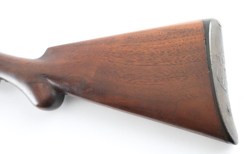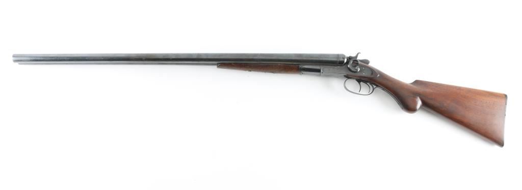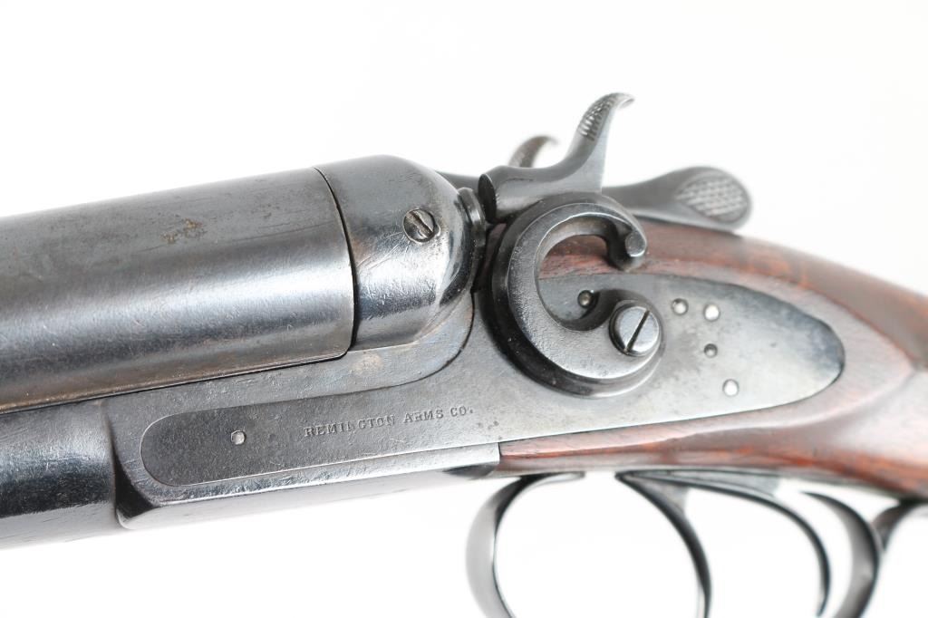 Antique Double barrel side by side shotgun has side lock action with external hammers, 30" barrels, front sight bead. Manufactured 1888-1908, this one in 1895. Bores are very good, barrels lock up tight, matching serial numbers, factory plastic buttplate. Metal has been re-blued, with some scattered areas of pin-prick pitting under the blue, "Remington Arms Co." address on knurled rib, and "Remington Arms Co." marked lock plates. Buttstock with bag grip is very good, forearm has scratches/dings with most of the checkering gone. NRA Condition-Very Good as Re-Blued. Antique Firearm.