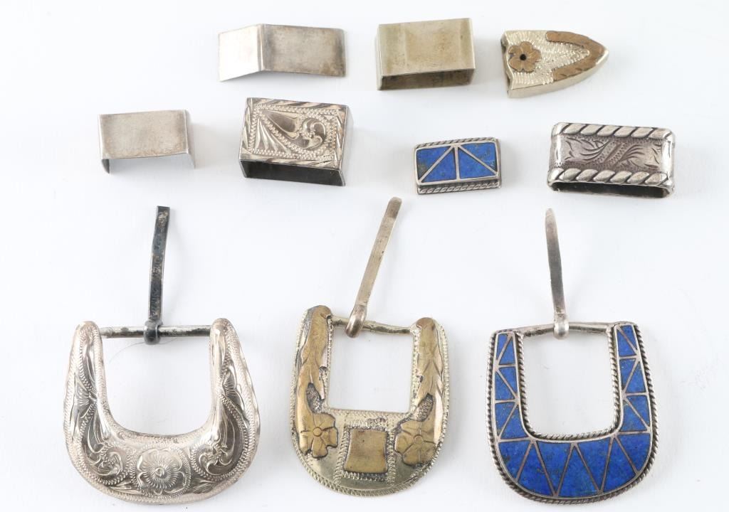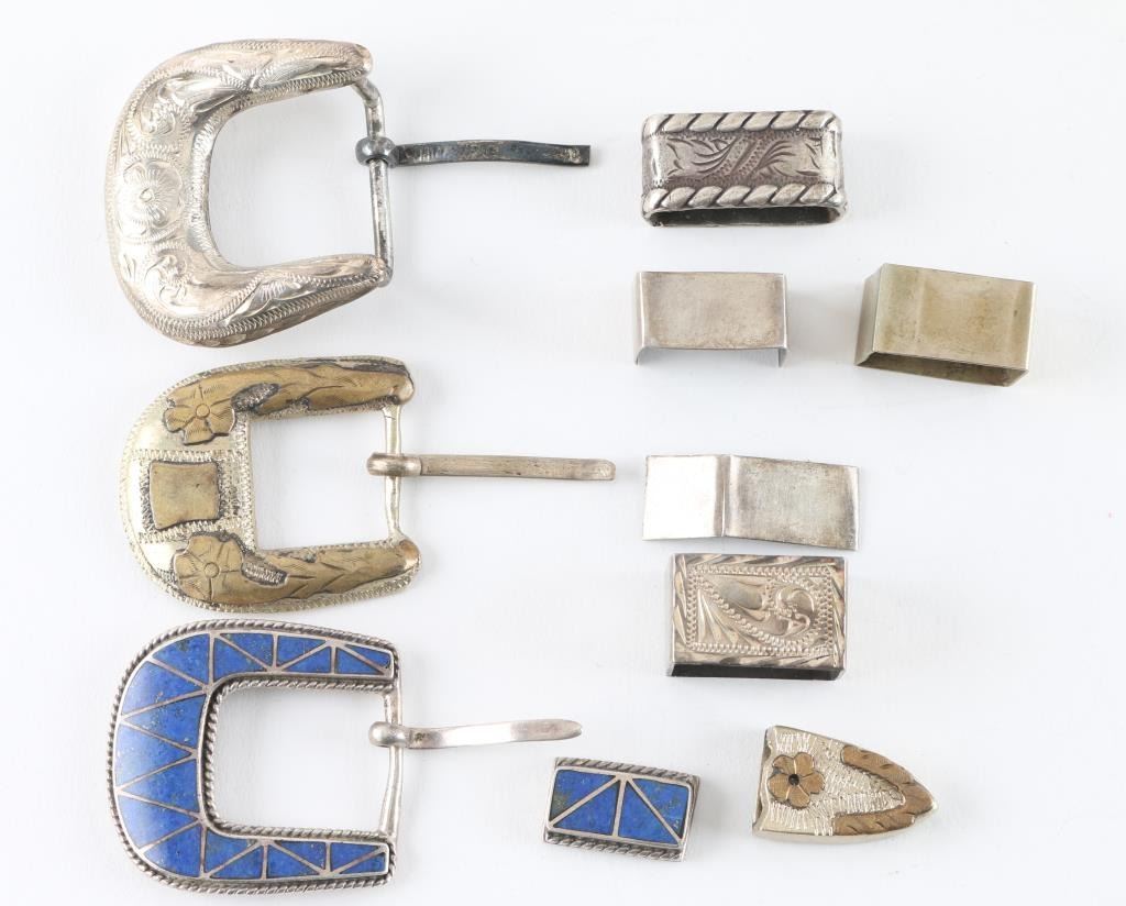 (1) Sterling Lapis set with marker mark of a moon (1) Engraved Sterling Buckle (1) Sterling & Brass Buckle marked Mexico