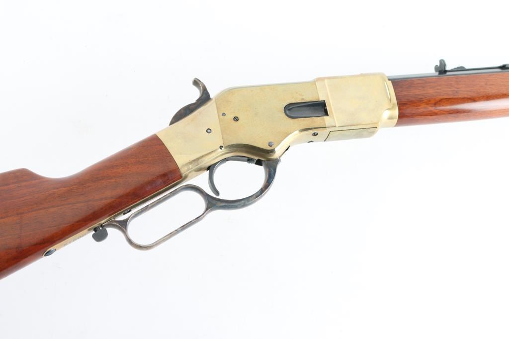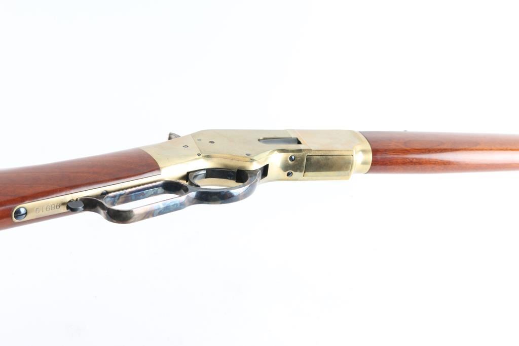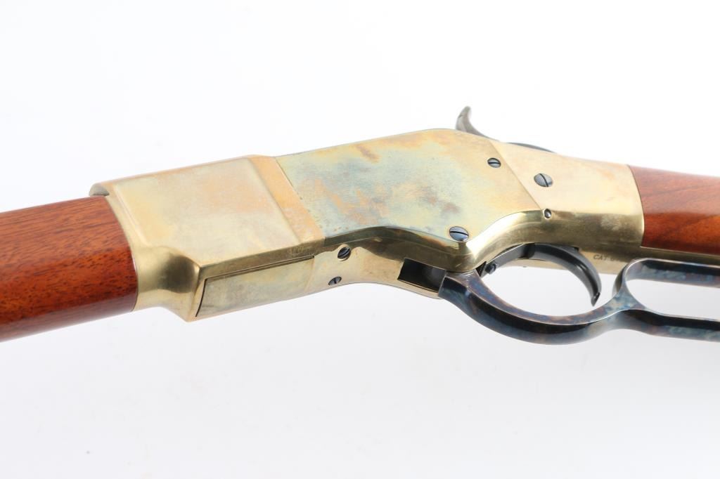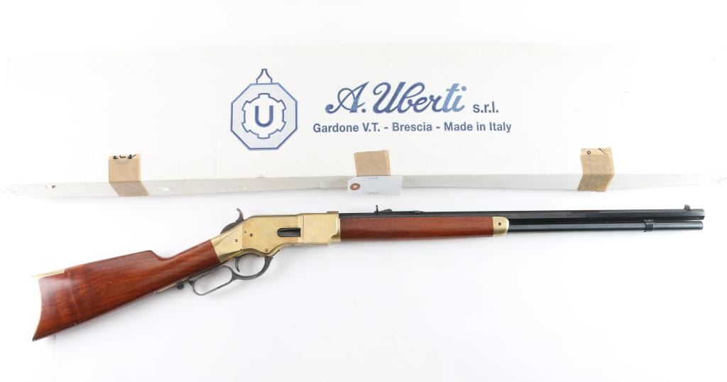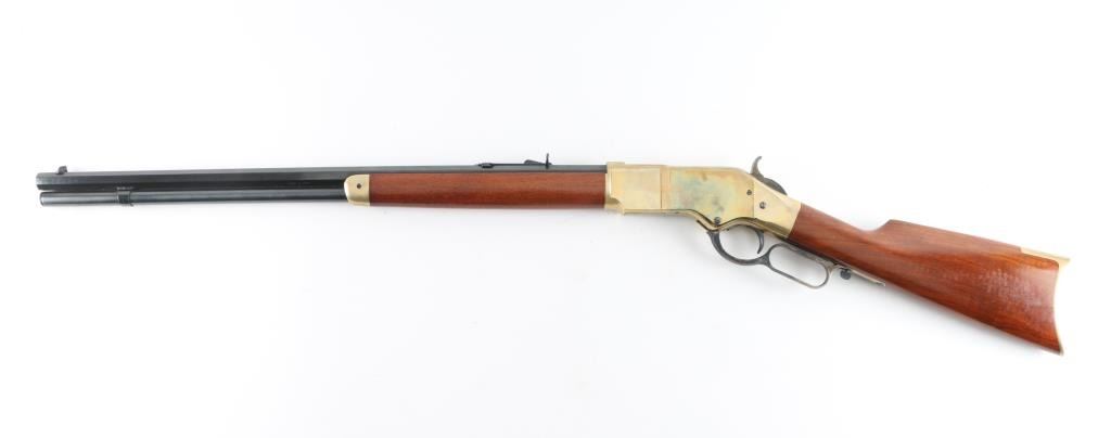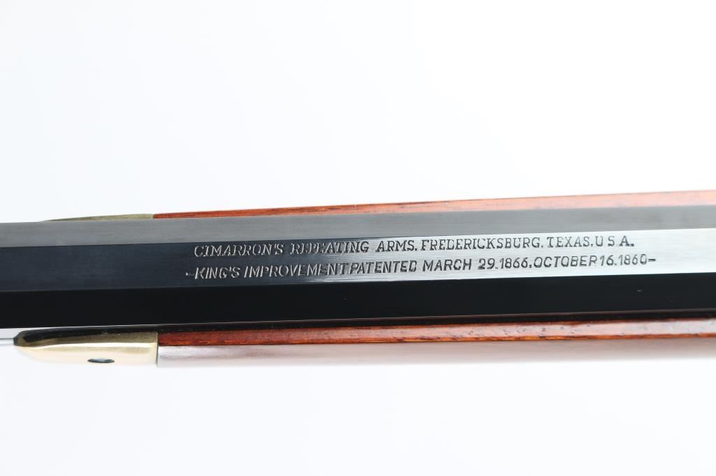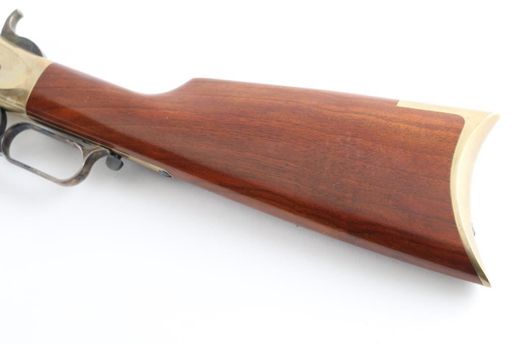 'Yellowboy Sporting Rifle' Reproduction of the brass framed Winchester Model 1866 lever action repeating rifle chambered in .45 Colt, manufactured in Italy circa 2002. Imported by Cimarron of Fredericksburg, TX with barrel address style import stamp featuring King's Improvement patent dates. Configuration: blued 24.25" octagonal barrel, full-length 13 round tube magazine, dovetailed blade front sight with set screw, elevation adjustable semi-buckhorn rear sight, smooth trigger, case hardened hammer with knurled spur, case hardened finger lever with latch, smooth walnut forend with brass cap and straight grip shoulder stock with crescent brass buttplate. Includes the original factory cardboard box with matching label and documents. Rifle retains approximately 98% of its original finish showing some scattered scratches and a small amount of surface rust around the muzzle. Action is smooth, the bore is very good+ and the wood stocks are near fine with blemishes & rubs. Condition is near NRA Very Good in box. ***Modern Firearm***