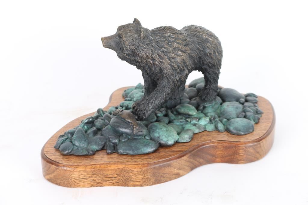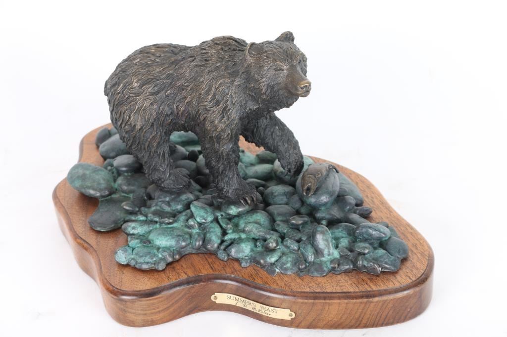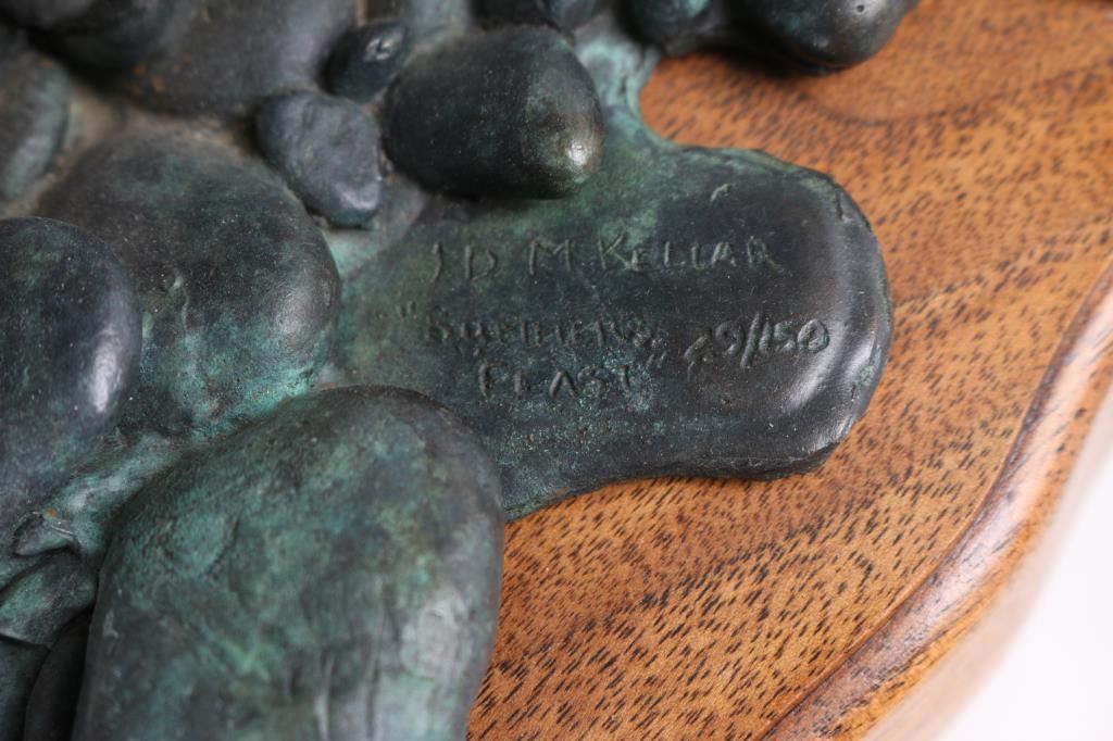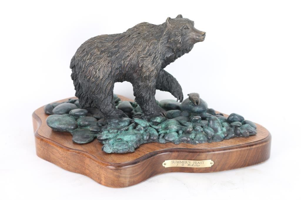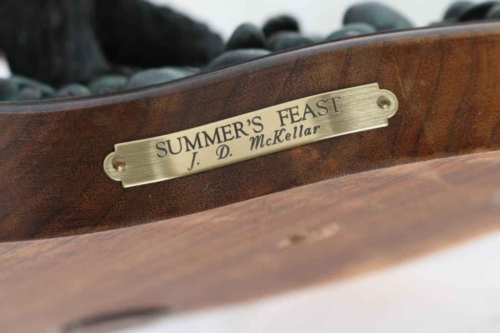 By J.D McKellar, entitled "Summers Feasts" measuring 14x18 on wood base. Numbered 29/150. Jerry D. McKellar (Born 1944) is active/lives in Washington. Jerry McKellar is known for Romantic wildlife and Indian sculpture.