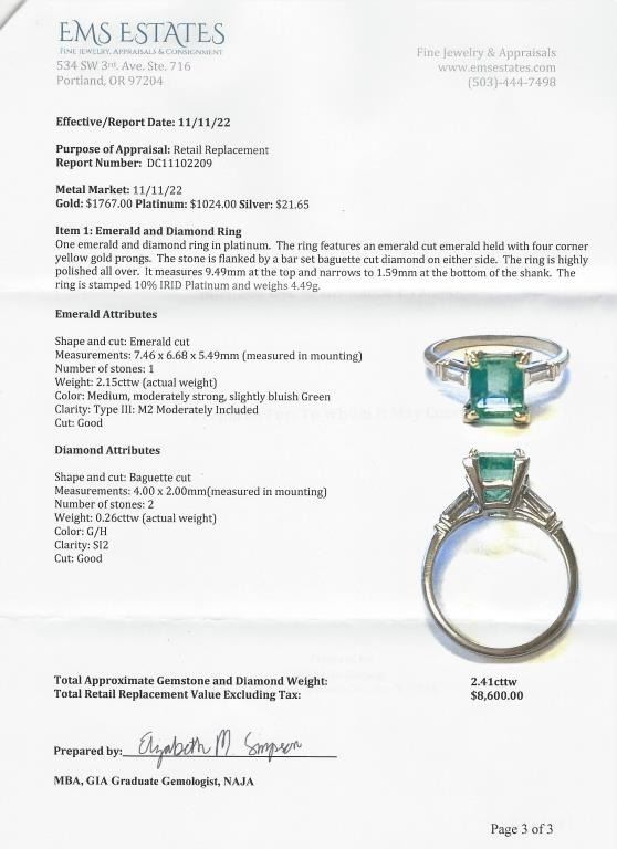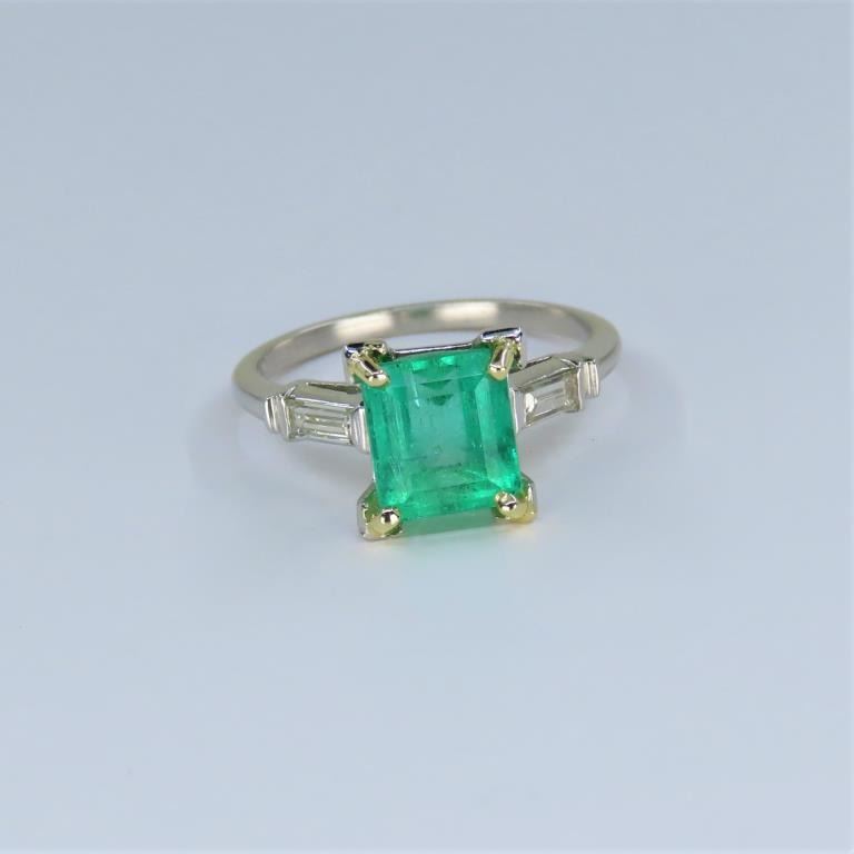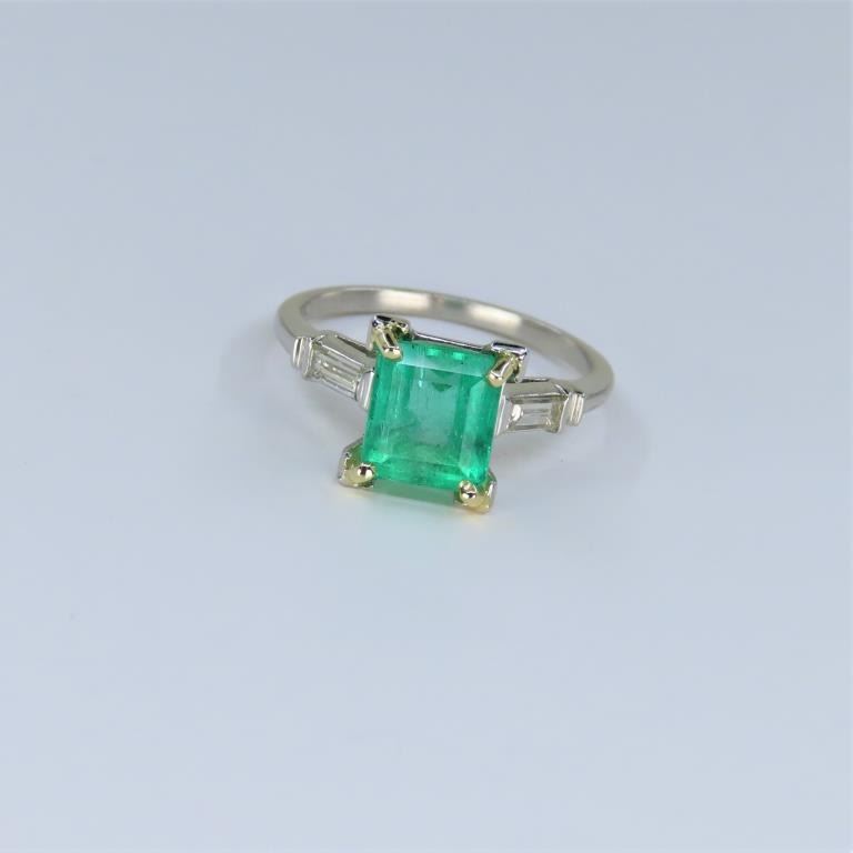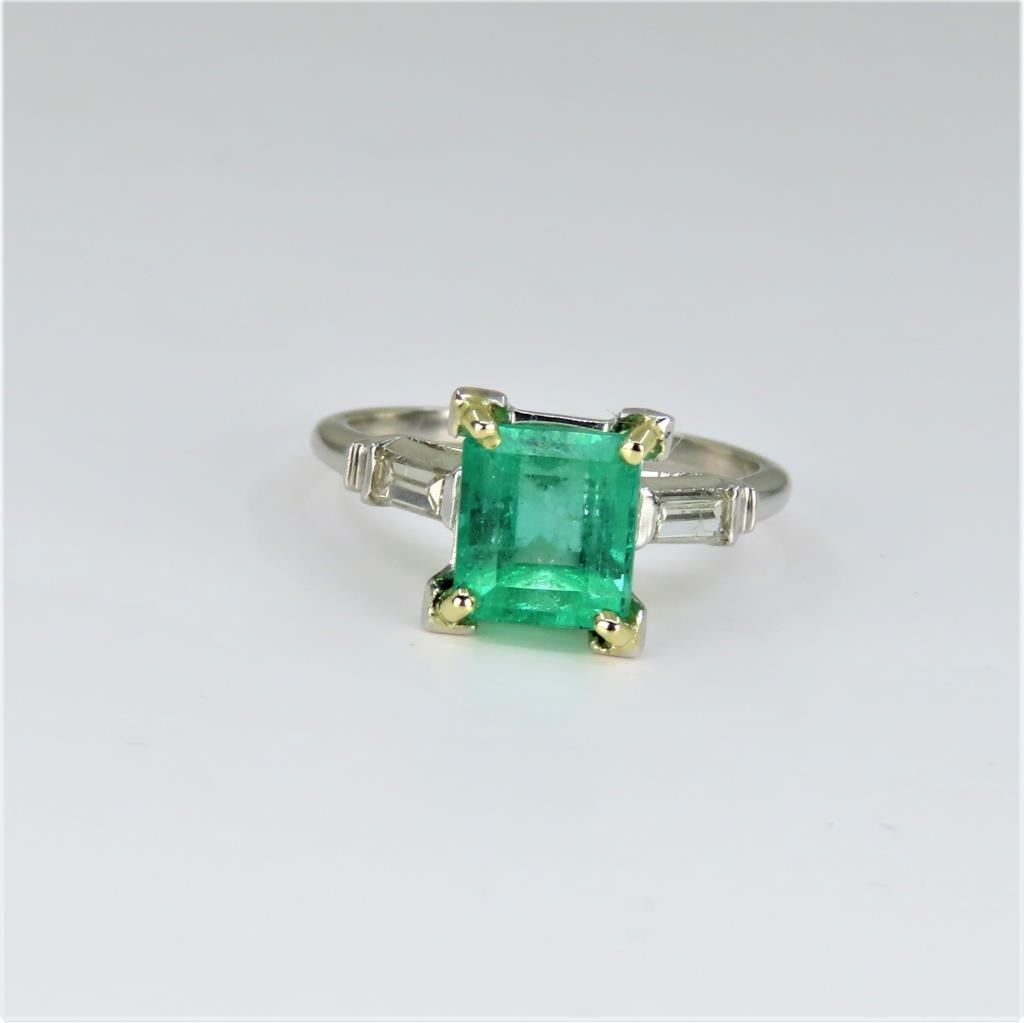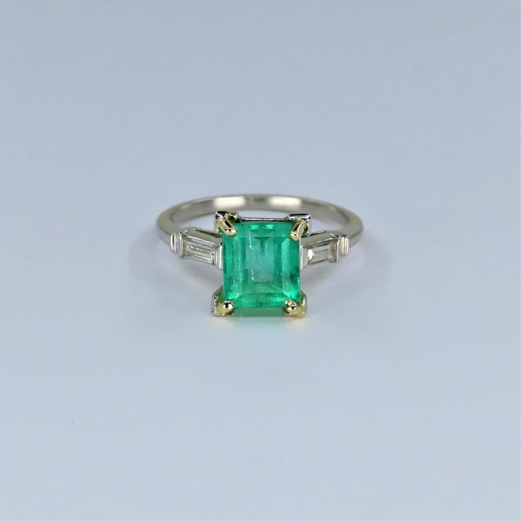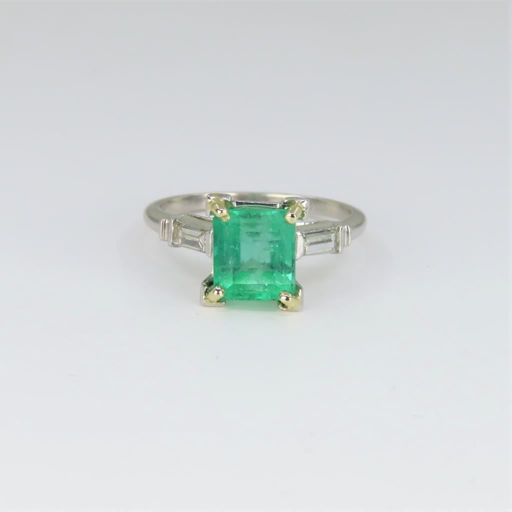and Diamond Ring featuring a bright fern green Colombian Emerald weighing 2.15 carats with two side baguette cut Diamonds weighing 0.26 carats with F-G colors and SI clarity set in a classic Platinum mounting. Full Retail Appraisal at $8,600.00