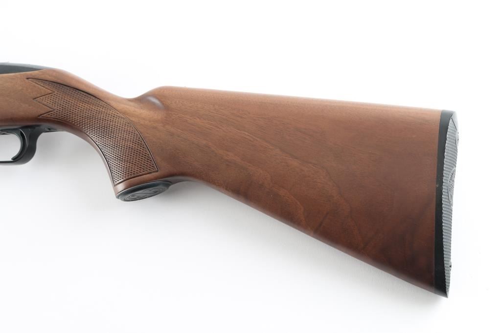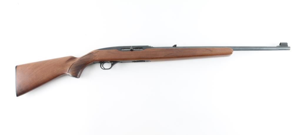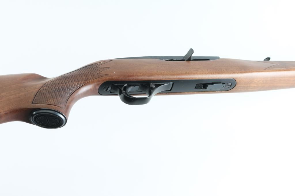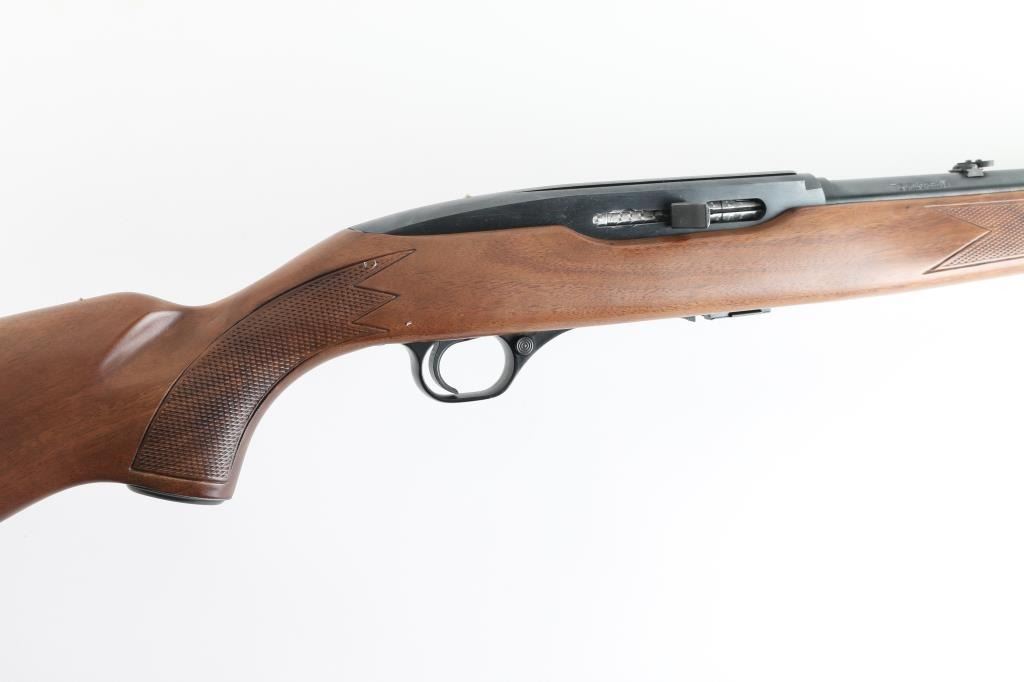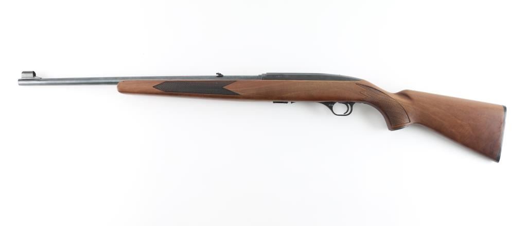 Semiautomatic rimfire rifle manufactured in Canada by Winchester, circa 1975-1980. Features blued finish, walnut stock with pressed checkering, 21.5" barrel, accepts detachable magazines (one supplied), ramp blade front sight with hood, folding adjustable rear sight, push button safety, blued steel grip cap, black plastic factory buttplate. Bore is pristine. Rifle is close to new condition with few handling marks. Wood shows fancy figure, some fiddle grain in butt. Condition is NRA Excellent *** Modern Firearm ***