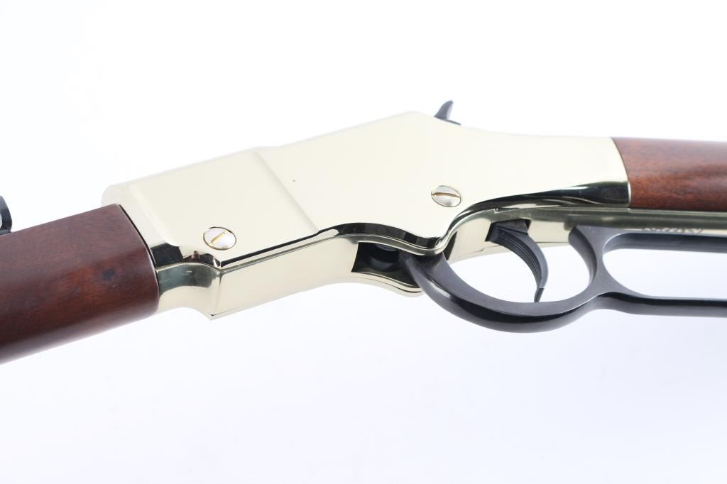 'Golden Boy' American made lever action repeating rifle chambered in .22 Long Rifle. Features a blued 20" octagonal barrel, full-length tube magazine, dovetailed blade front sight with brass bead, elevation adjustable semi-buckhorn rear sight, serrated trigger, serrated hammer spur, polished brass receiver, smooth American walnut forend and straight grip shoulder stock with brass buttplate. Includes the original cardboard box with documents. Rifle retains approximately 99% of its original finish showing some light handling marks/scratches. Action is smooth, the bore is pristine and the wood stocks are fine with some rubs. Condition is near NRA Perfect in box. *Modern Firearm*
