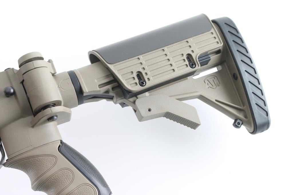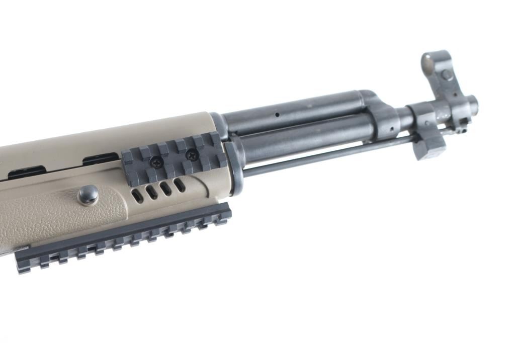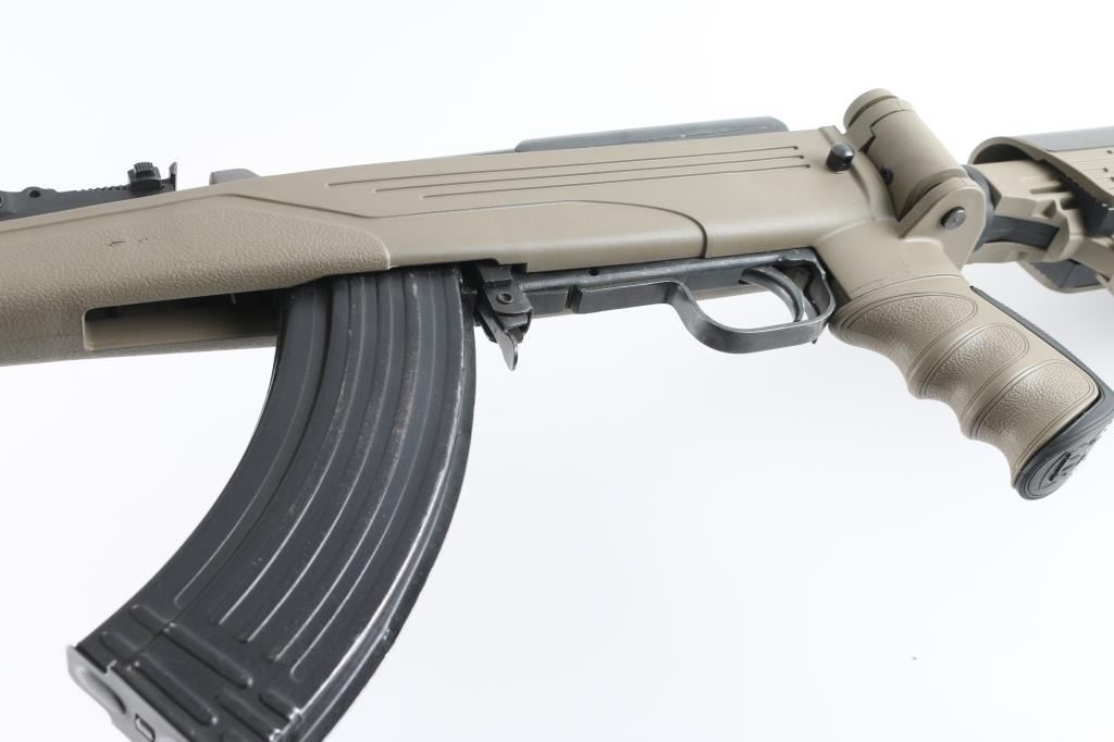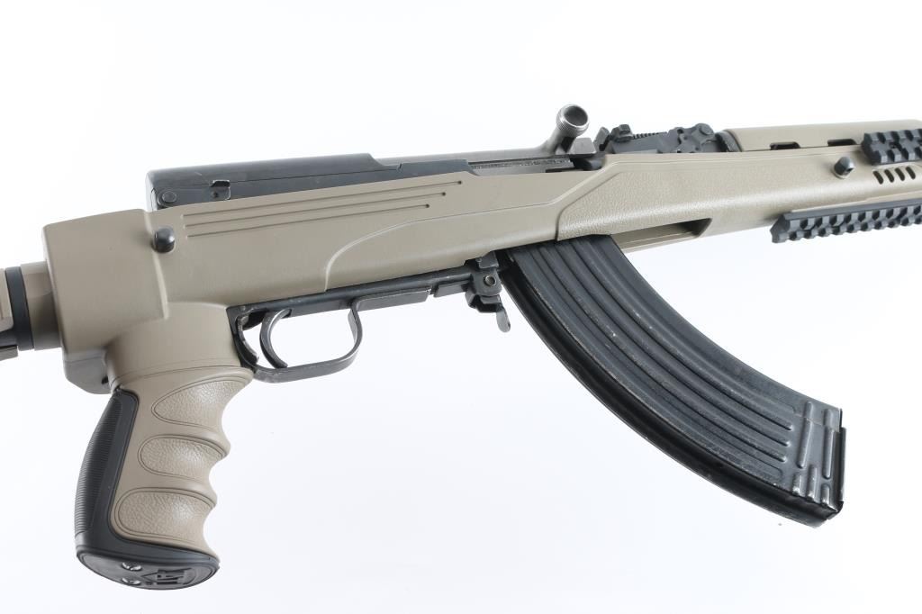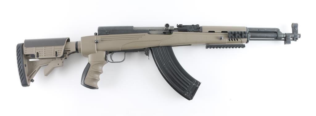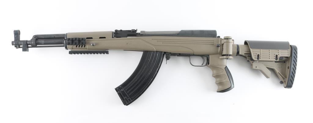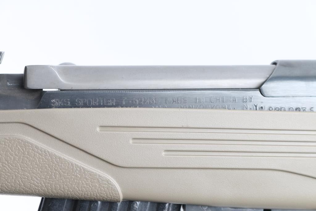 Semi-automatic SKS "Sporter". Made in China by Norinco. Imported by Labanu, NY. circa. 1990's. Marked on left receiver. SKS Sporter with 16" barrel. Hooded , elevation adjustable, front sight post. tangent rear sight. Cleaning rod, thumb safety in the triggerguard. Blued metal finish, matte bolt. Sporterized with a ATI tactical stock, earth colored polymer, with finger contoured grip, side-folding, adjustable buttstock, with rubber recoil pad, 6 sling swivel studs, accessory rails at 3,6,9, o'clock, ventilated handguard. 30-rd detachable AK magazine. Action is smooth/tight. Bore appears excellent. Stock is excellent. blued finish is about 97%, with some minor scratches, edge wear. NRA Condition-Near Excellent. Modern Firearm.