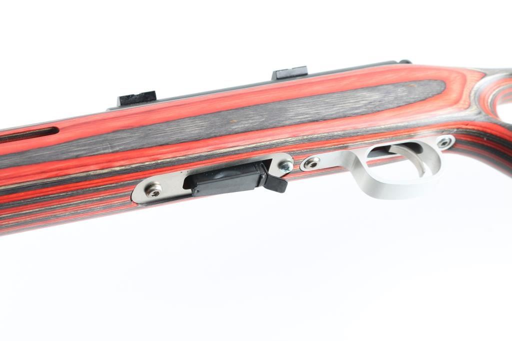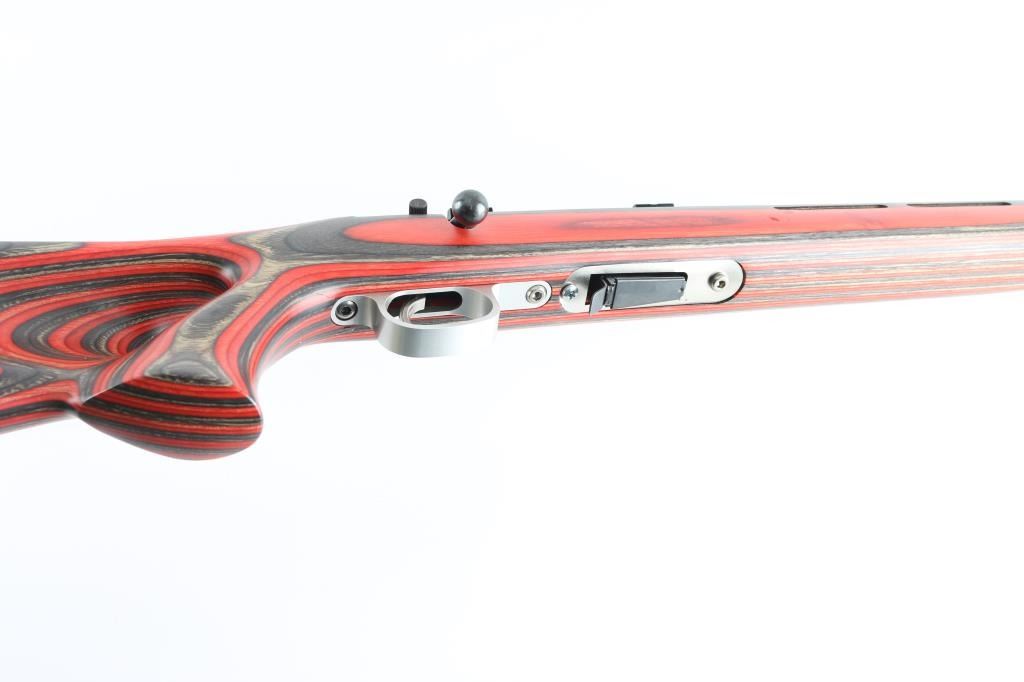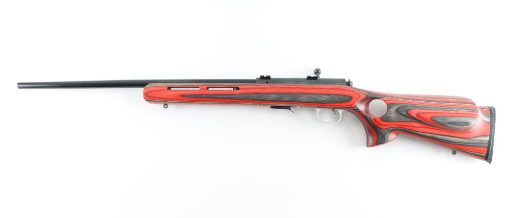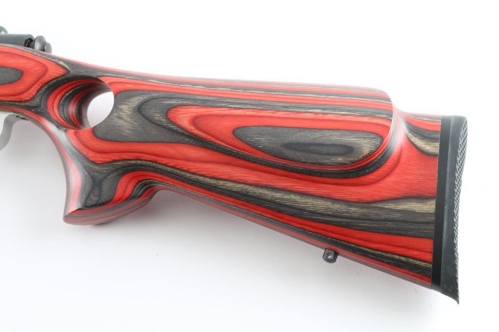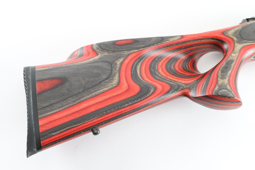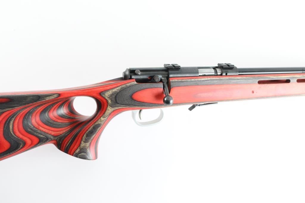 Canadian made rimfire bolt action rifle. Features blued action, semi-gloss black finished barrel, bare aluminum triggerguard, red and gray laminated wood thumbhole stock with vented forend & right hand cheekpiece, 20.5" barrel, manual safety, no sights, Weaver type two piece scope bases on top of receiver, sling studs, solid rubber butt pad. Bore is pristine. Overall near new with few handling marks. Includes one magazine. Condition is NRA Excellent - like new *** Modern Firearm ***