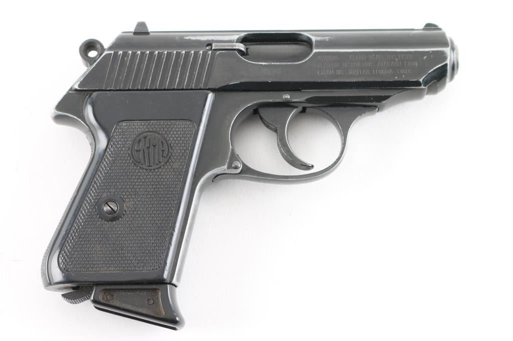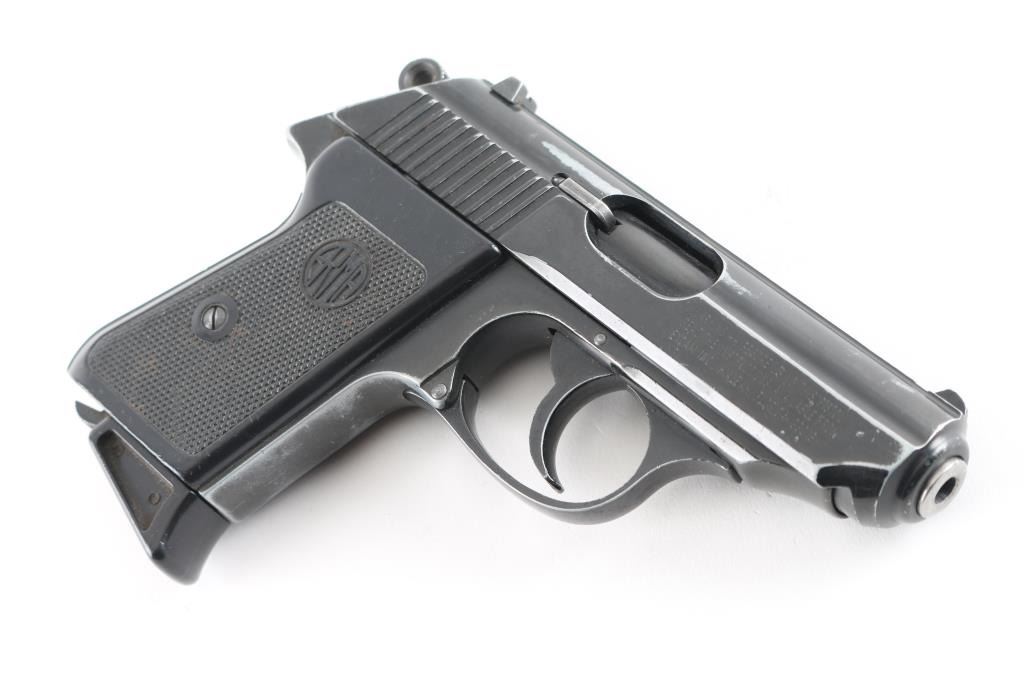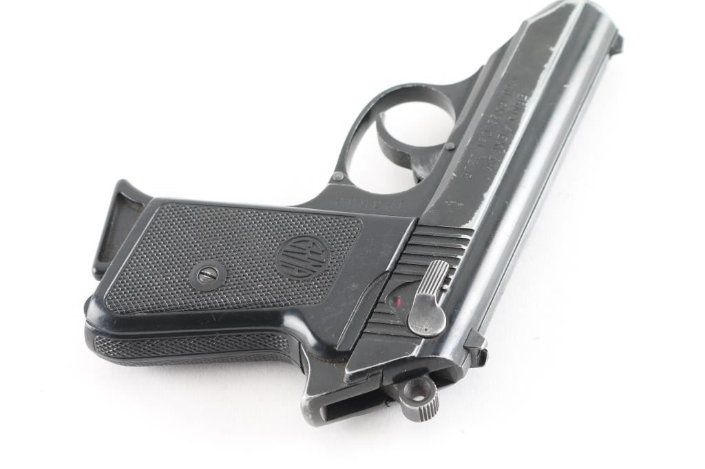 Double action semi-automatic pocket pistol similar in appearance to Walther PPK. Features blued/black finish, 3.25" barrel, fixed sights, slide mounted manual safety, smooth trigger, serrated round hammer spur and two-piece checkered brown plastic grips. Bore is very good condition, needs cleaning. Retains 80% finish with edge losses throughout, some scratches, handling marks. Grips are very good. Includes (1) magazine. Condition is NRA Good. Modern Firearm.