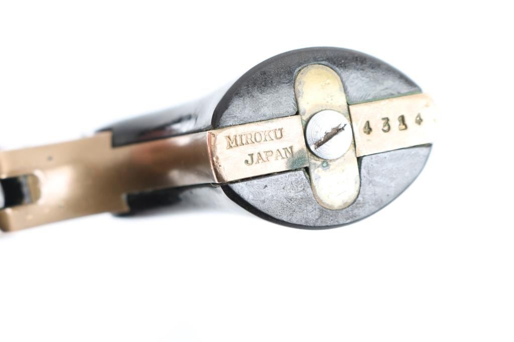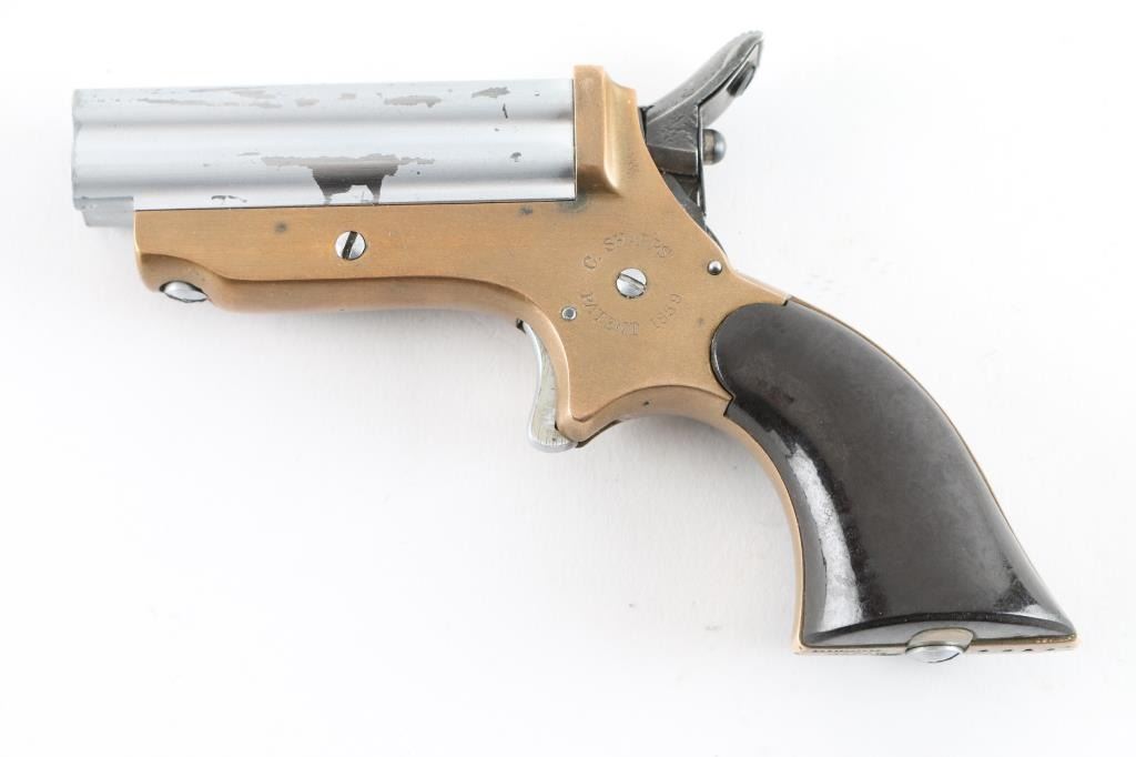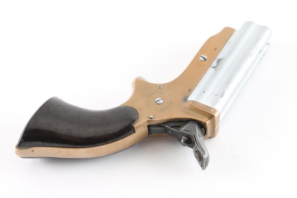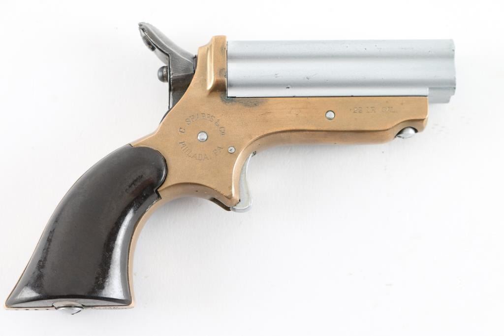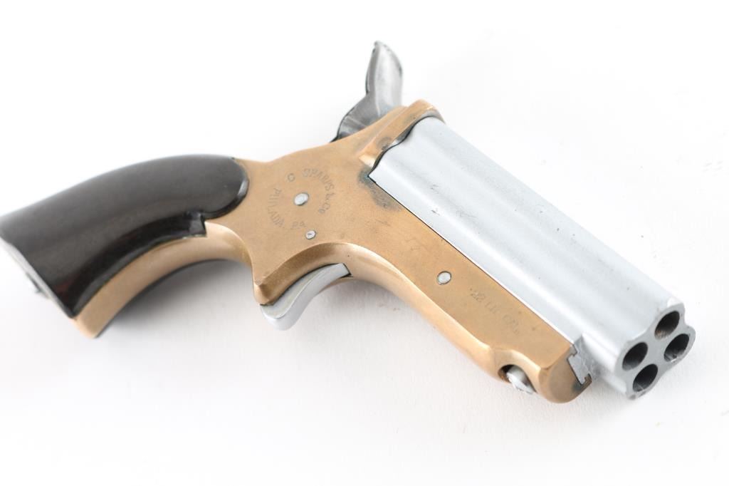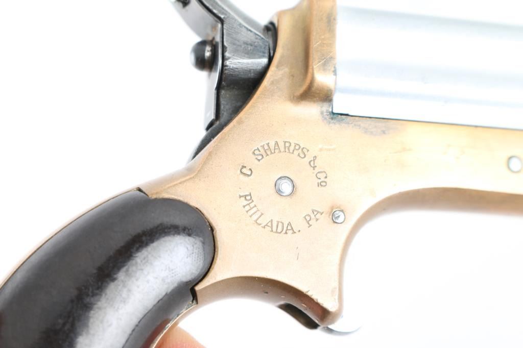 Japanese reproduction of the Sharps four-shot breech-loading pepperbox derringer chambered in .22 Long Rifle. Features four 2.5" matte gray barrels, brass bead front sight, 'v' notch rear sight, rotating firing pin on the hammer, smooth spur trigger, brass frame and two-piece smooth brown plastic grips. Barrels retain approximately 70% of their gray finish, with some flaking, mostly on the left side. The frame looks good. Action performs well, bores are good, need cleaning, and plastic grips are very good. NRA Condition-Good. C&R Firearm