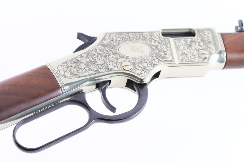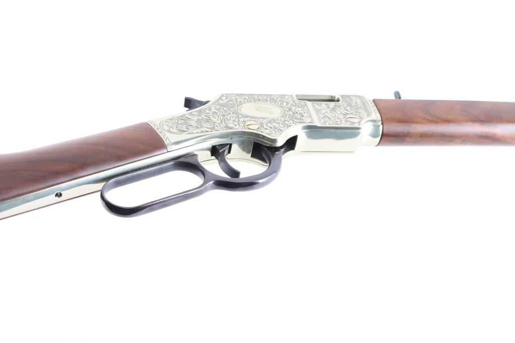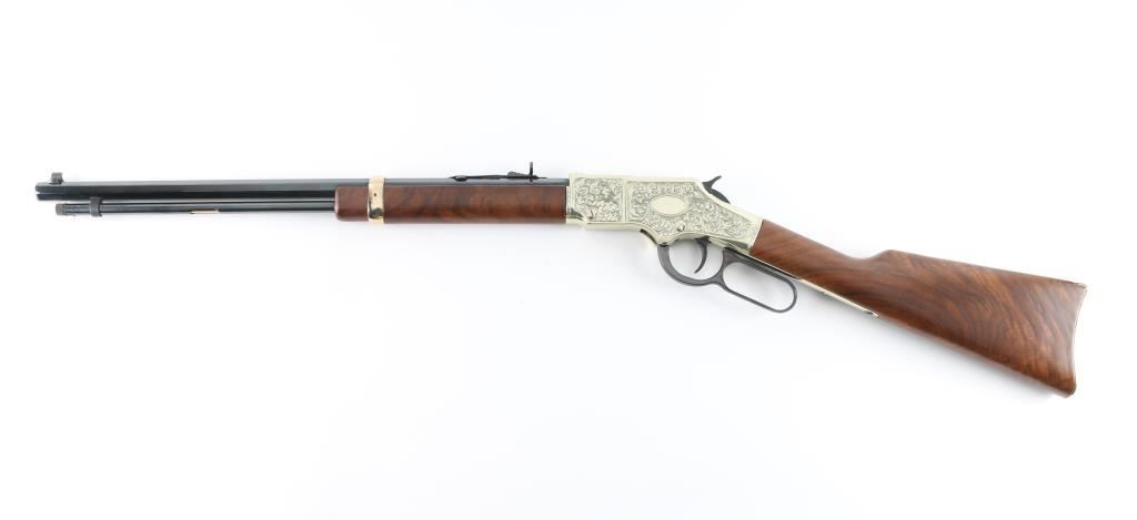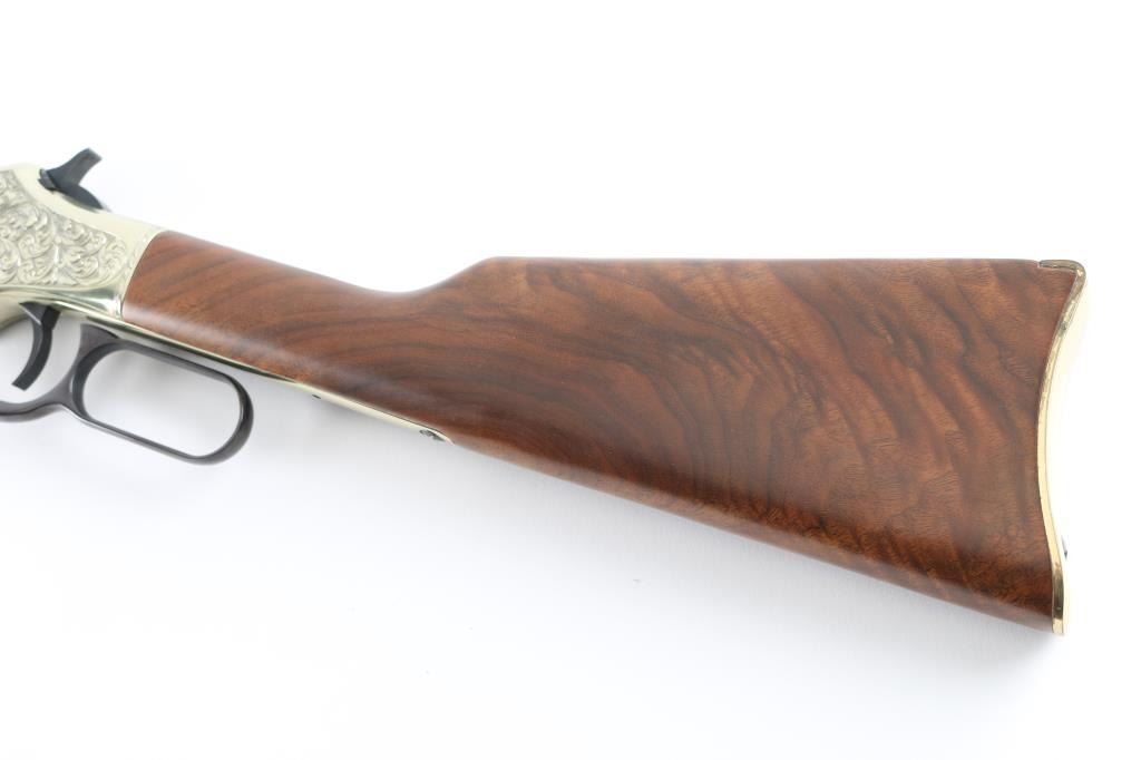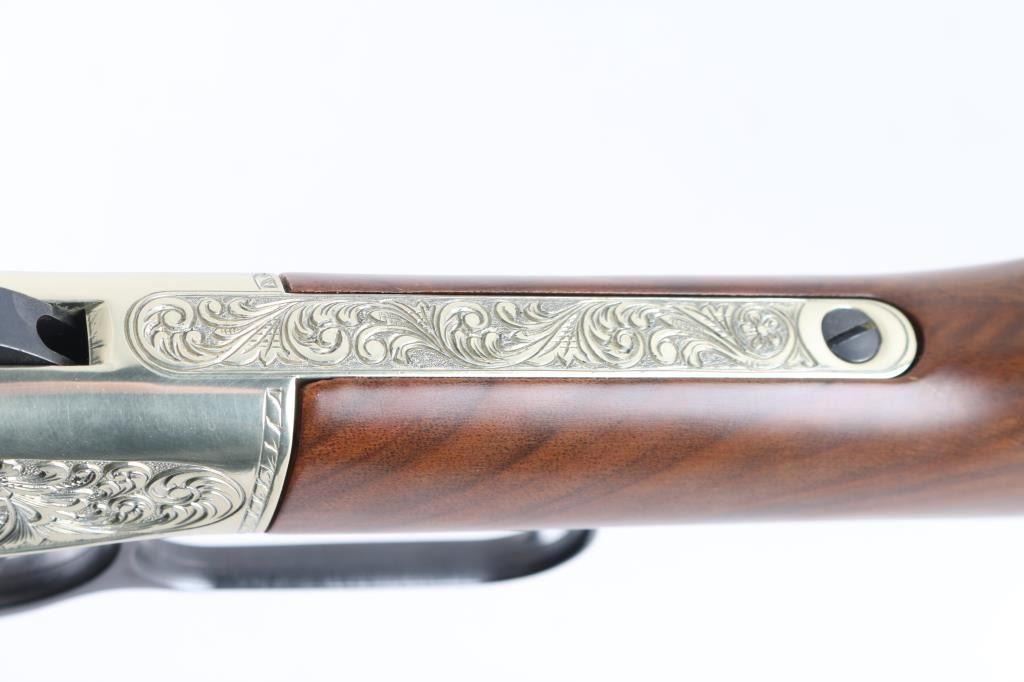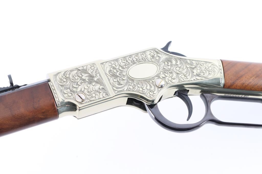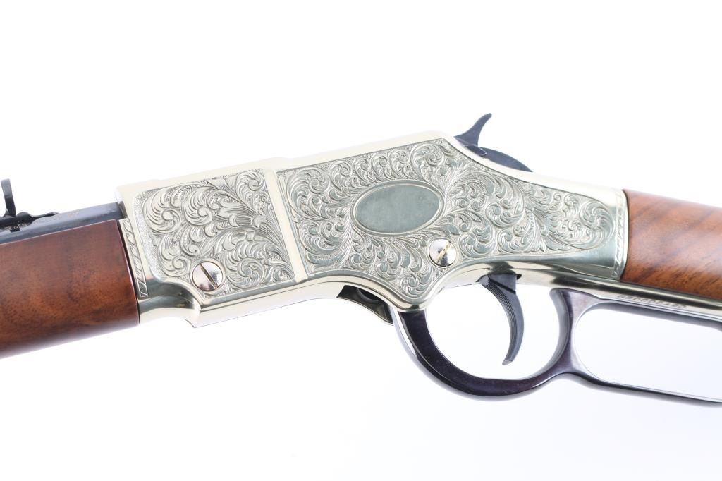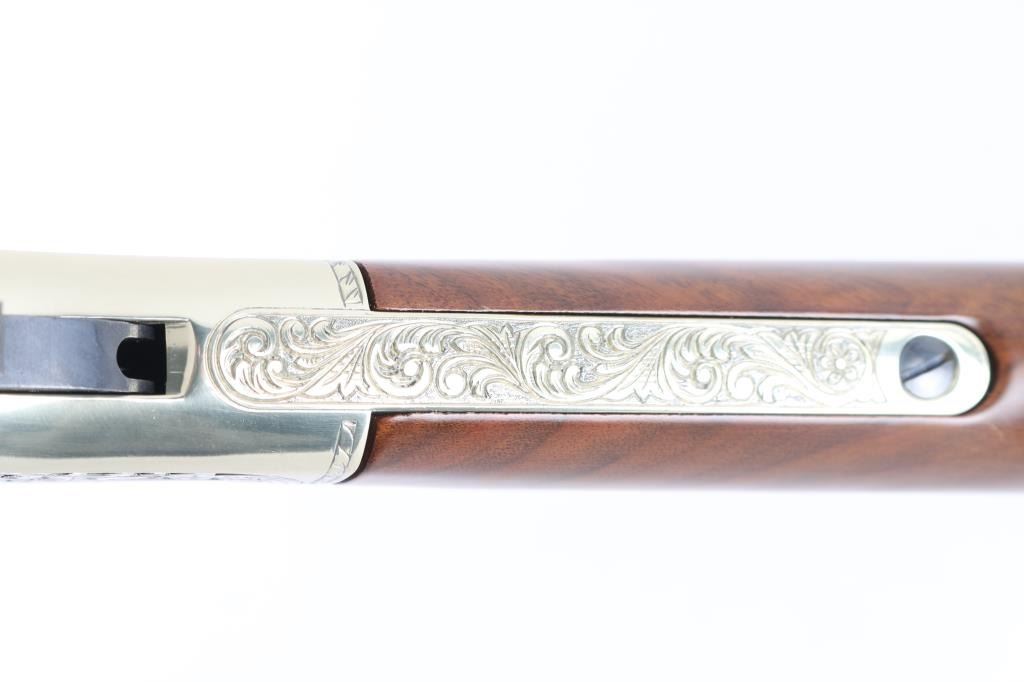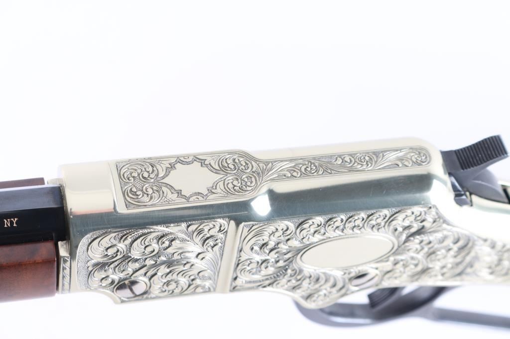 'Engraved' Lever action rimfire rifle with brass colored receiver cover, barrel band & buttplate, blued finish on remainder of metal parts. Features two piece smooth fancy figured walnut stock with straight grip, 20" octagonal barrel, buckhorn sights, full length tube magazine under barrel. Floral scroll engraving covers sides, top, and tang of action, with blank ovals in center of receiver sides. Right side oval has some sort of rough blemish in center. Overall condition is like new, with few signs of handling and use, with distressed condition original factory box. Condition is NRA Excellent *** Modern Firearm ***