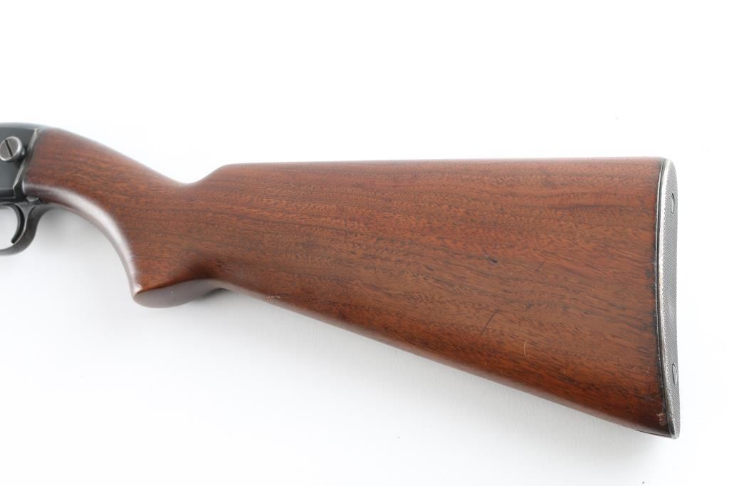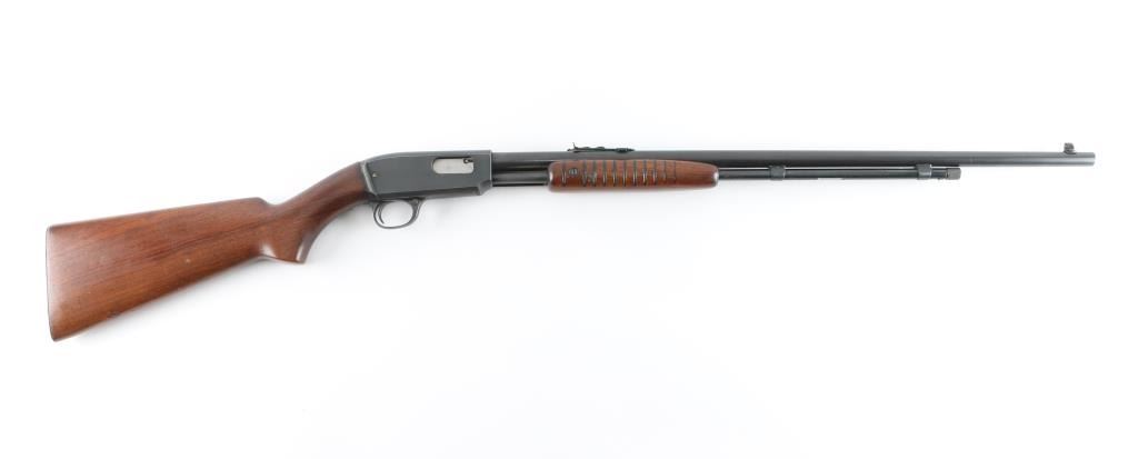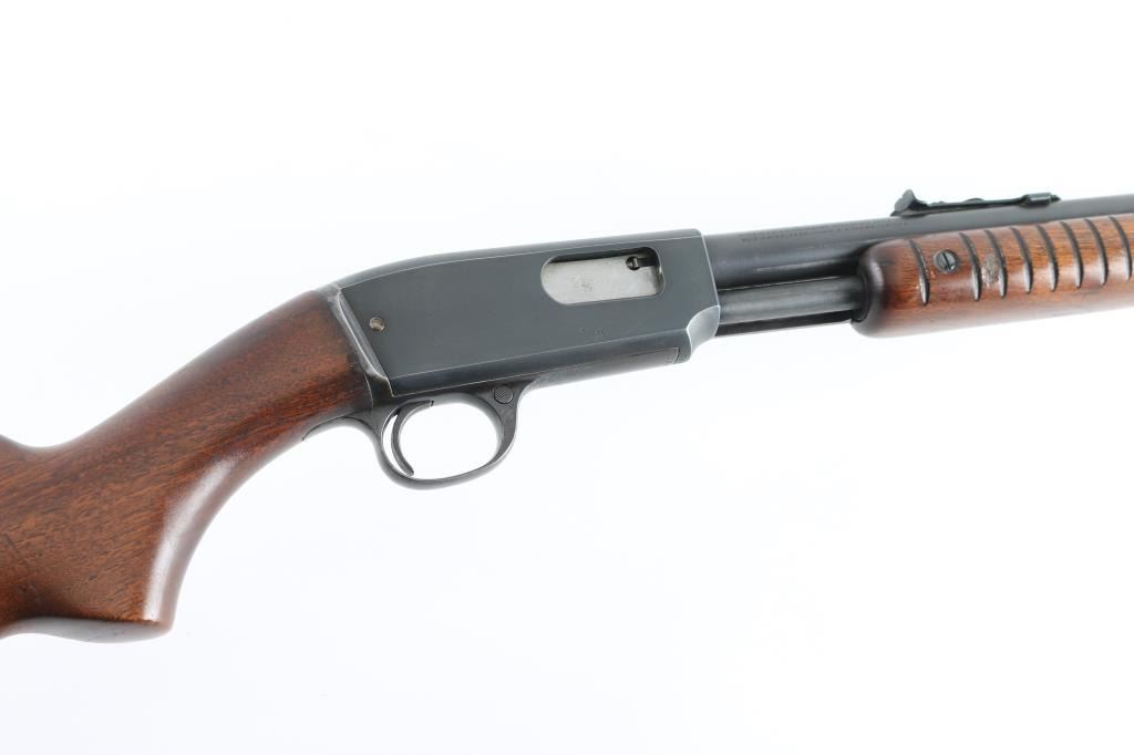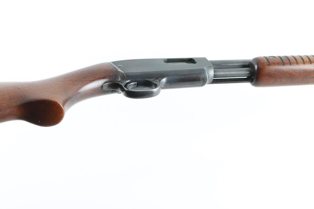 American made pump action rimfire rifle manufactured circa 1936. It features a blued finish, grooved wood flat bottom pump handle, smooth wood butt stock with a knurled steel buttplate. It sports a 24" barrel, a dovetailed blade front sight and sporting rear sight, the 3/4 magazine tube is under the barrel, with a manual safety, smooth trigger and takedown screw on left of receiver. Metal finish has been reblued and looks good but there are some signs of minor pitting under the reblue. There is a loss of finish on the left side of the receiver. Wood looks good with a couple of small dings or dents. Bore looks good, bright. LOP is 13.5". Condition is NRA Very Good as refinished. *C&R Firearm*