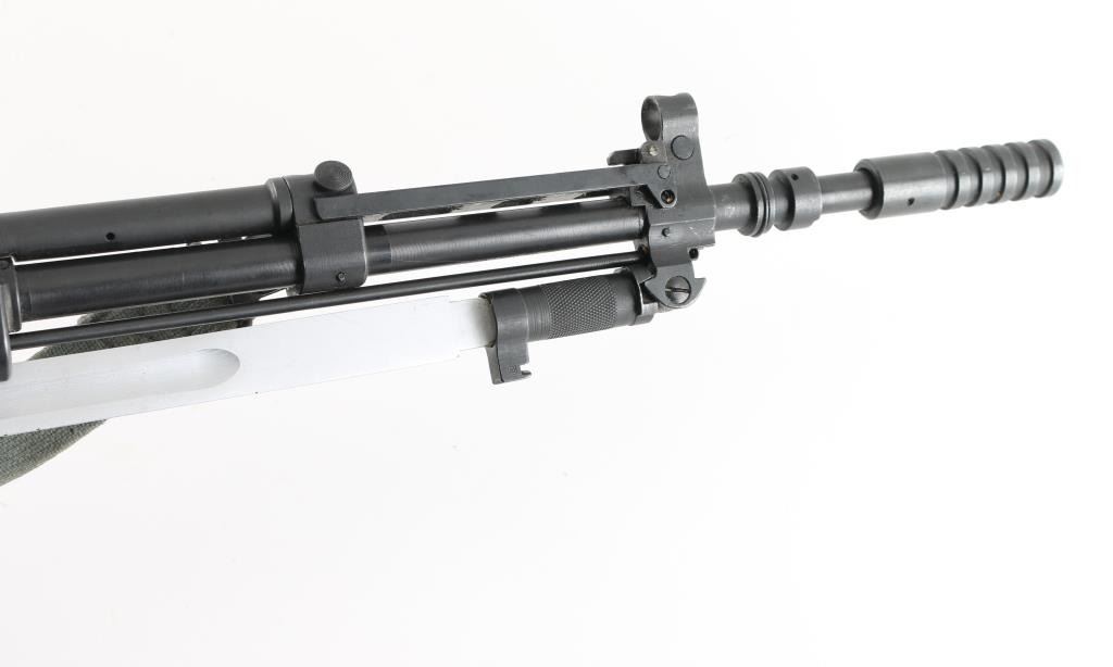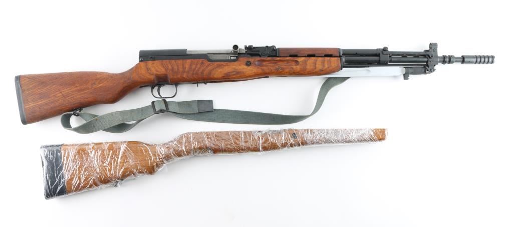 Yugoslavian military semiautomatic rifle imported by Samco. Features 22" barrel (24" with the installed muzzle brake), protected post adjustable front sight, rear tangent sight, flip up three dot "low light" sights, cleaning rod under barrel, folding blade bayonet, flip up accessory sight, missing its fixed 10 round magazine, manual safety, smooth wood stock & hand guard, sling swivels, thin rubber butt pad, cleaning gear in butt trap. Bore is very good condition. Retains 90% finish (appears arsenal reblued) with scuffs, scratches, handling marks. Wood is very good, slightly rough finish. Numbers match where observed (bolt & carrier), some parts also marked with what appear to be drawing numbers. Stock stamped "D-66905", shallow, appears stamped over a different number. Includes good condition web sling, and also a Chinese SKS stock (very good condition, includes rear swivel, added 2" plastic butt spacer with rubber butt pad). Missing the magazine assembly. Condition is NRA Very Good+ (missing magazine) *** C&R Firearm ***