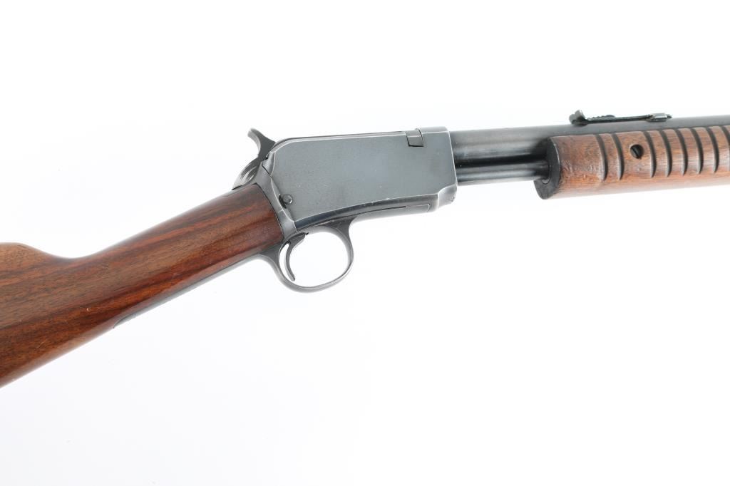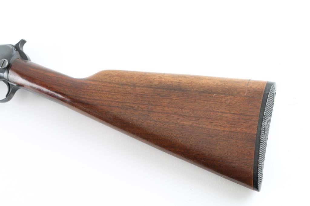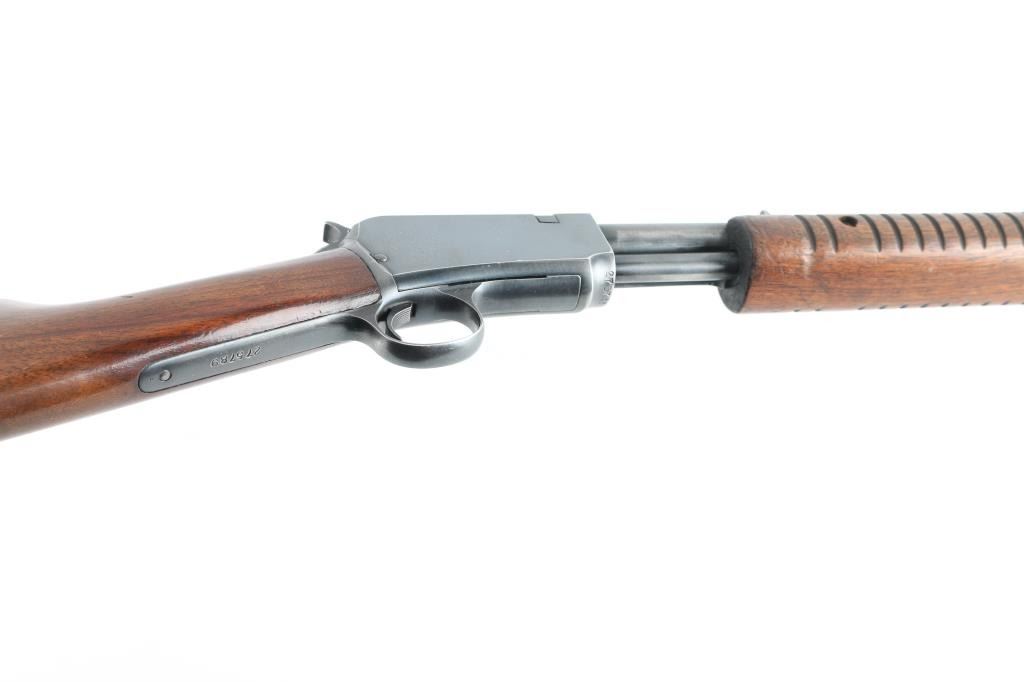 American made slide action, rimfire rifle chambered for .22 Short, Long and Long Rifle cartridges, circa 1949. It sports a 23" round barrel with 3/4 magazine tube, a blued finish, dovetailed blade front sight, adjustable rear sporting sight, take-down receiver, serrated hammer spur, serrated trigger, grooved walnut slide handle and smooth straight grip shoulder stock with factory hard rubber buttplate. Metal finish looks good with a loss of blue in spots on the barrel and receiver and a few minor dings and scratches. Wood looks good, no cracks. Bore looks very good, bright. LOP is 13.5". Condition is NRA Very Good *C&R Firearm*