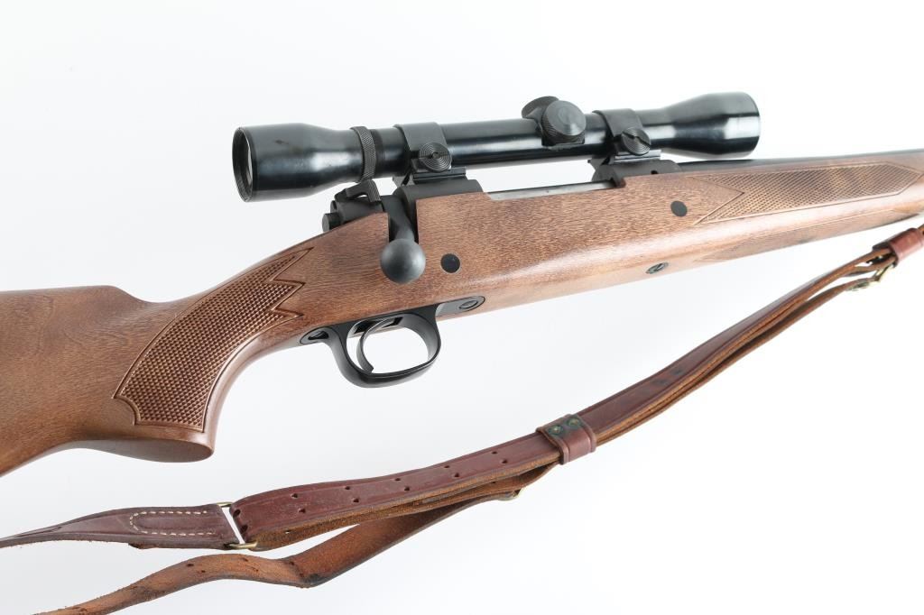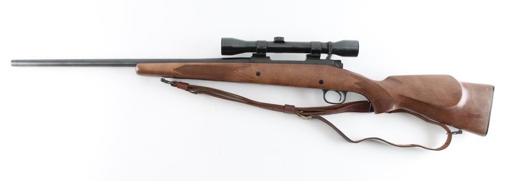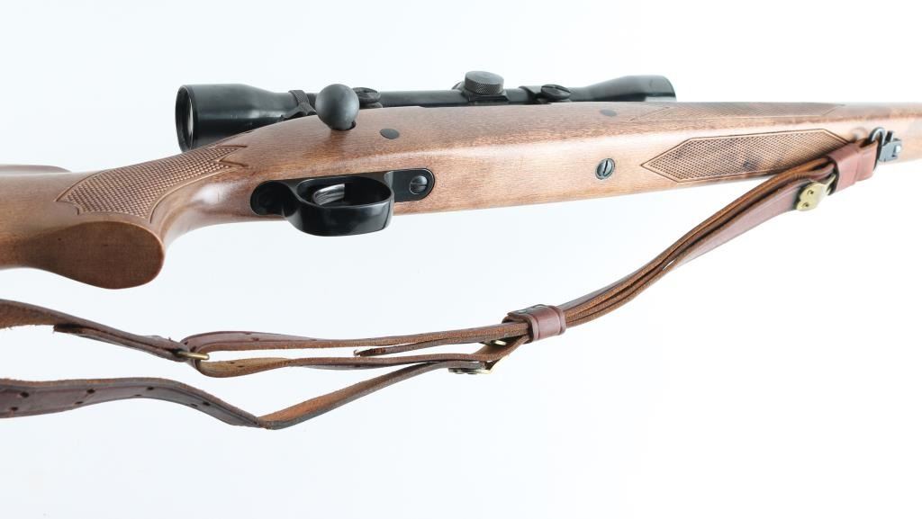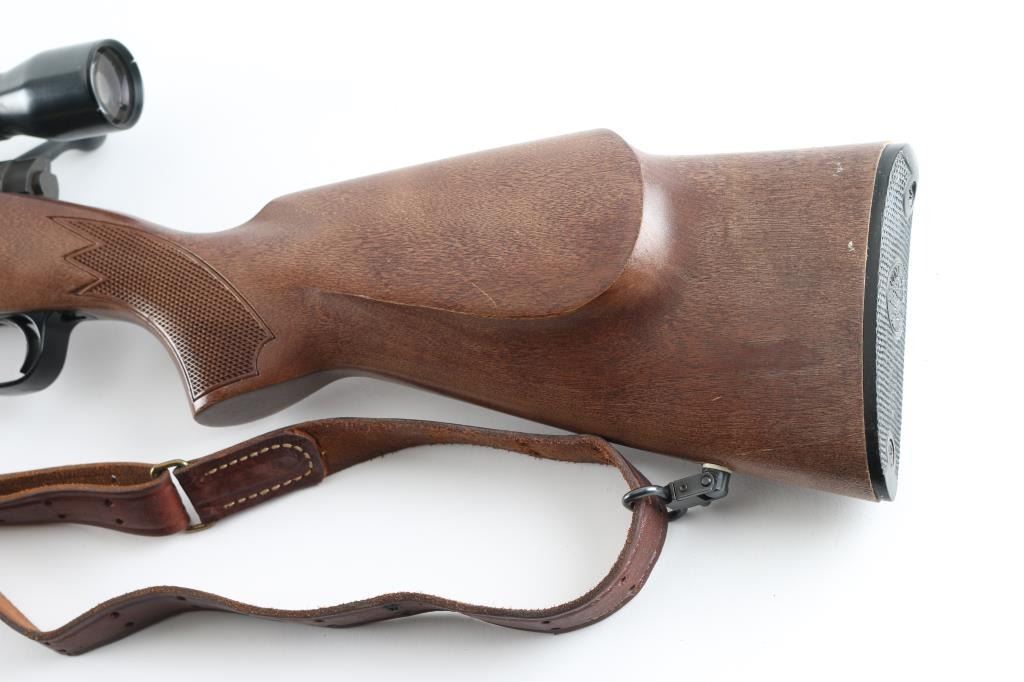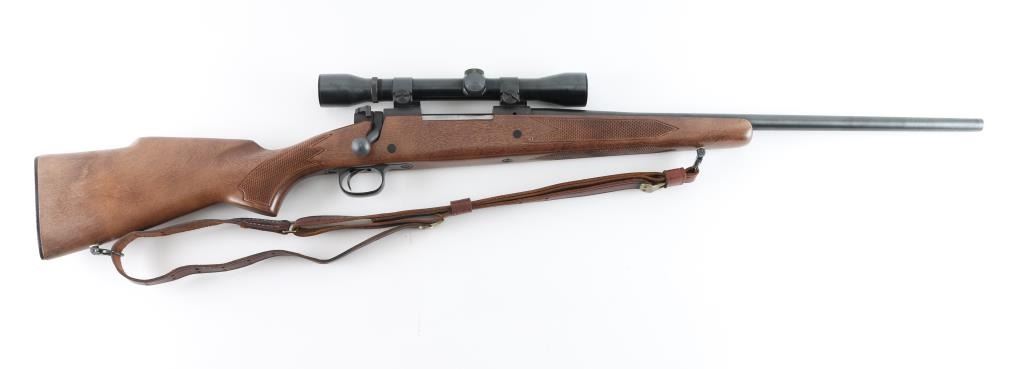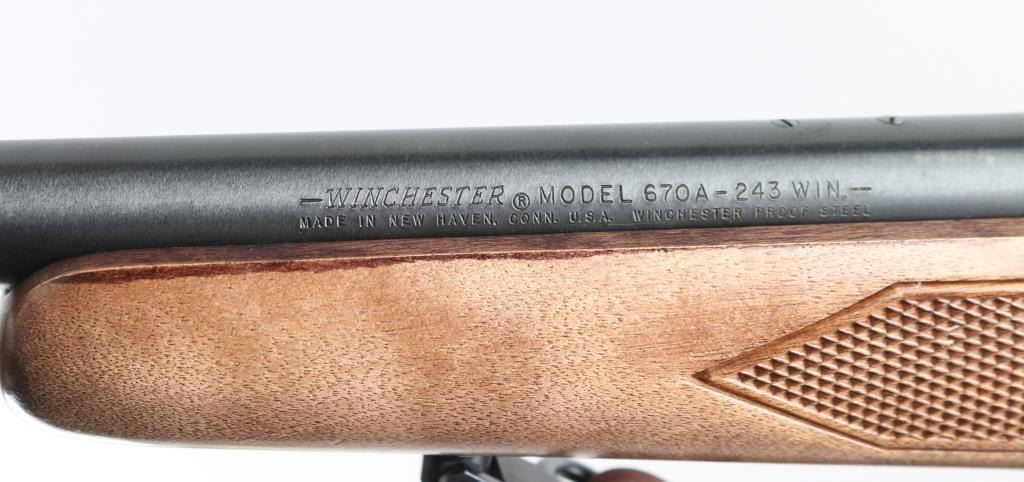American made push feed bolt action sporting rifle chambered in .243 Winchester, manufactured circa 1972-1979. The model 670A was an economy version of the Model 70 that was produced to compete with other manufacturers budget rifles. Features a blued 22" tapered barrel, no sights (plug screws fill the holes), Weaver Marksman 4x scope installed on a two-piece base, matte finished receiver which is factory drilled & tapped for a side mounted sight, serrated trigger, three position safety on the rear of the bolt, internal 4 round blind magazine, swivel studs and press checkered Monte Carlo style wood stock with factory plastic buttplate. Bore is very good condition. Retains 95% finish showing showing scattered light handling marks. Wood is very good with few blemishes. Scope is very good condition, clear view, fine crosshair. Includes good condition leather two-hook sling. Condition is NRA Excellent *** Modern Firearm ***