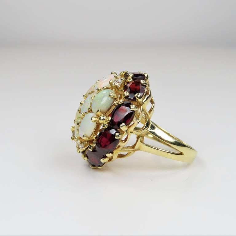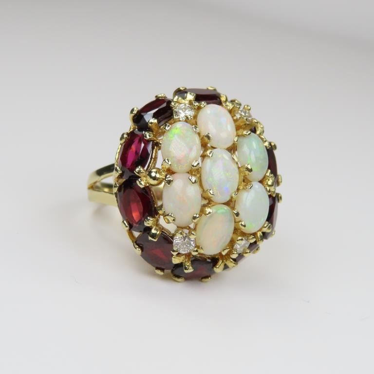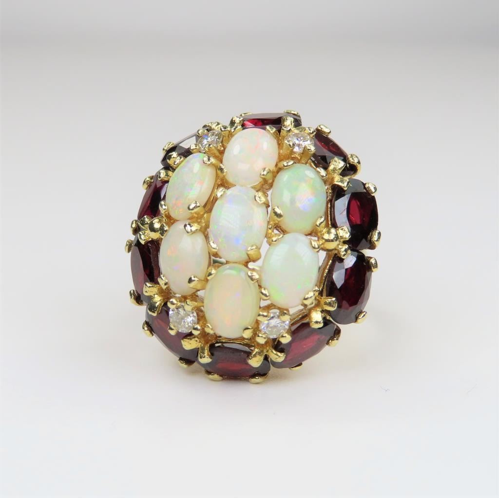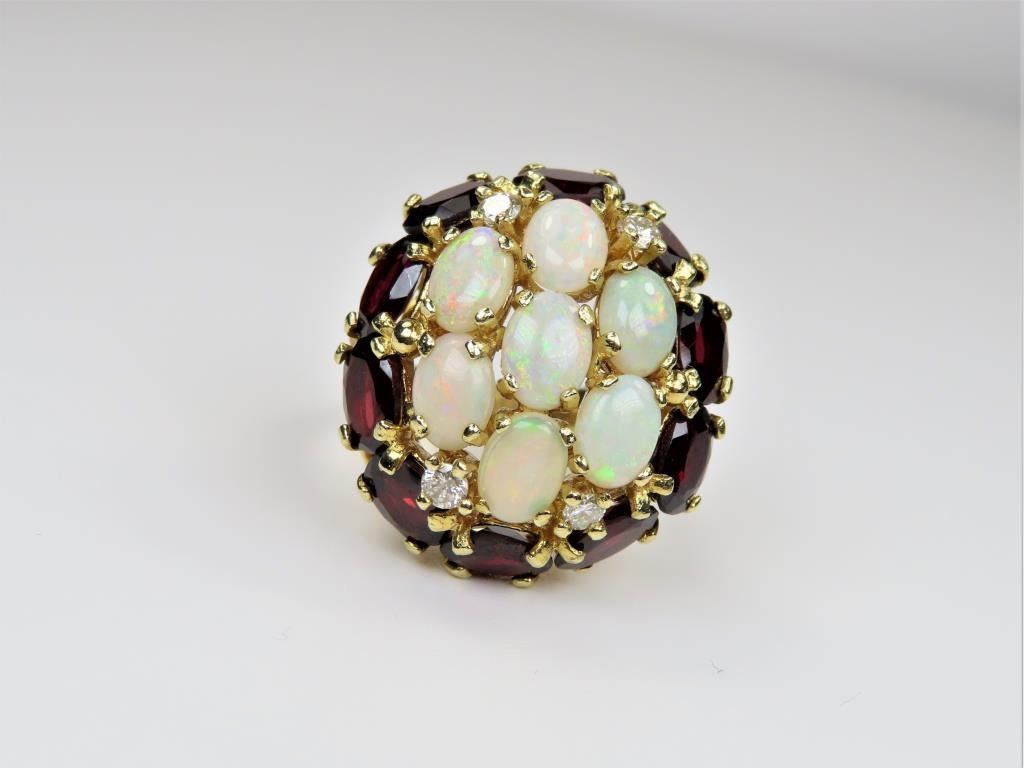 Diamond Ring featuring 7 oval Australian Opals with full spectrum color flashes framed with 10 oval cut Garnets and 4 round Diamonds with a combined gem weight of approx. 10.00 carats set in a bohemian style setting in 14 karat yellow gold. Size is approx 8. Retail $5,000-$6,000