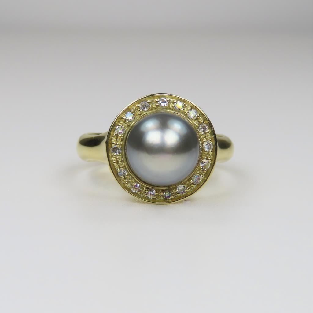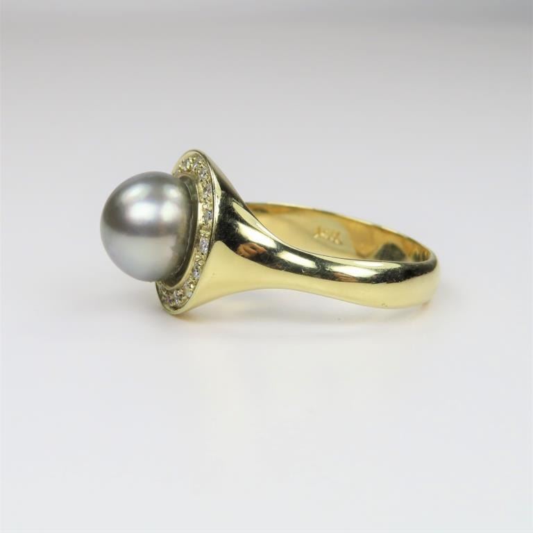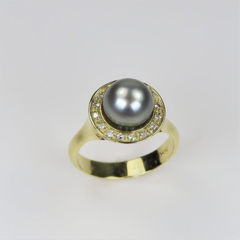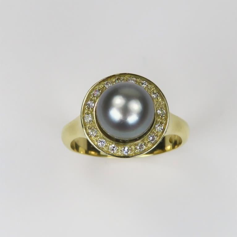 Diamond Ring featuring a Black Pearl measuring approx. 10.00-11.00 MM in diameter with peacock color overtones encircled with 16 round cut pave set Diamonds weighing approx. 0.20 carats with G-H colors and VS clarity crafted in 14 karat yellow gold. Retail $3,000-$4,000 Estimates $1,800-$2,800