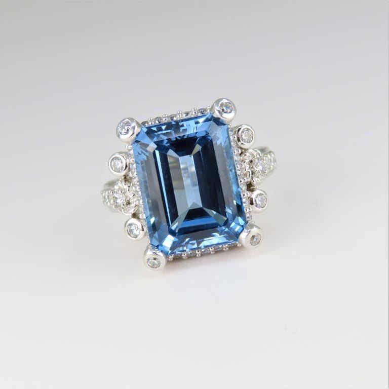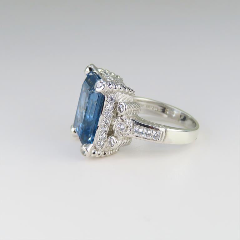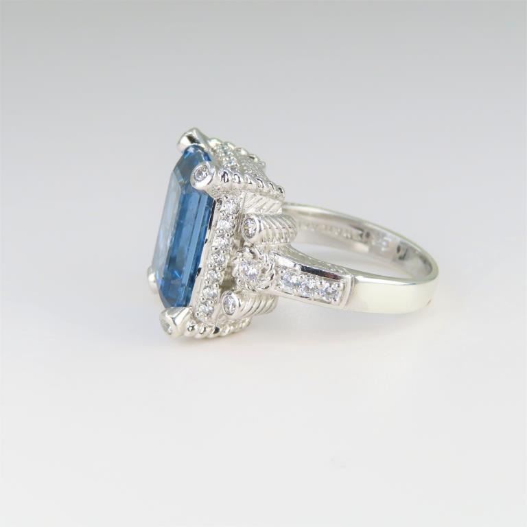 and White Sapphire Ring featuring an emerald cut Blue Topaz accented with 40 round cut White Sapphires set in beautiful Sterling Silver setting.