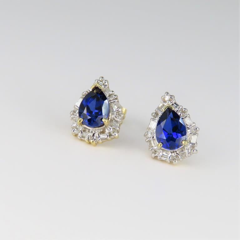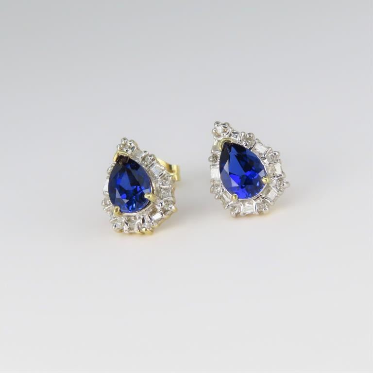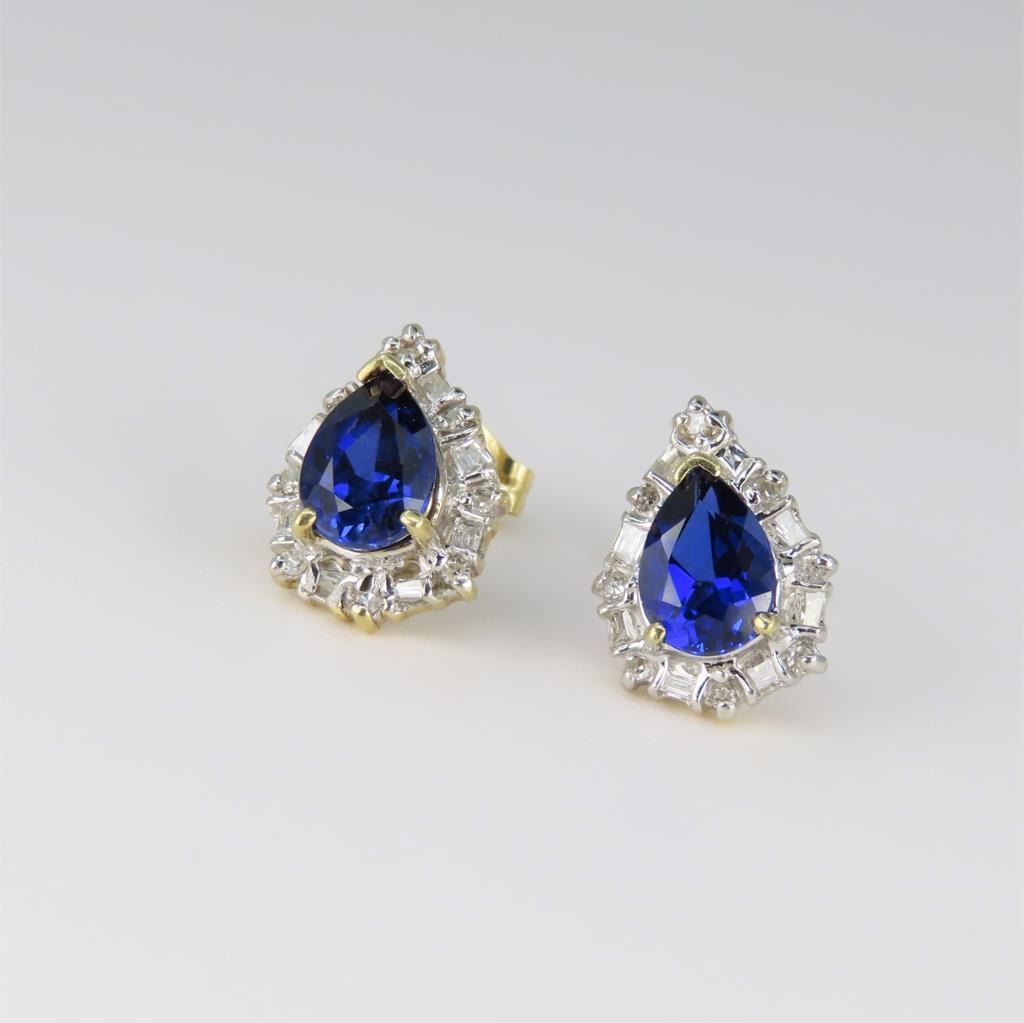 stud earrings, featuring 2 pear shape lab created Blue Sapphires framed with 32 baguette and round cut Diamonds weighing approx. 2.00 carats set in 14 karat yellow gold.