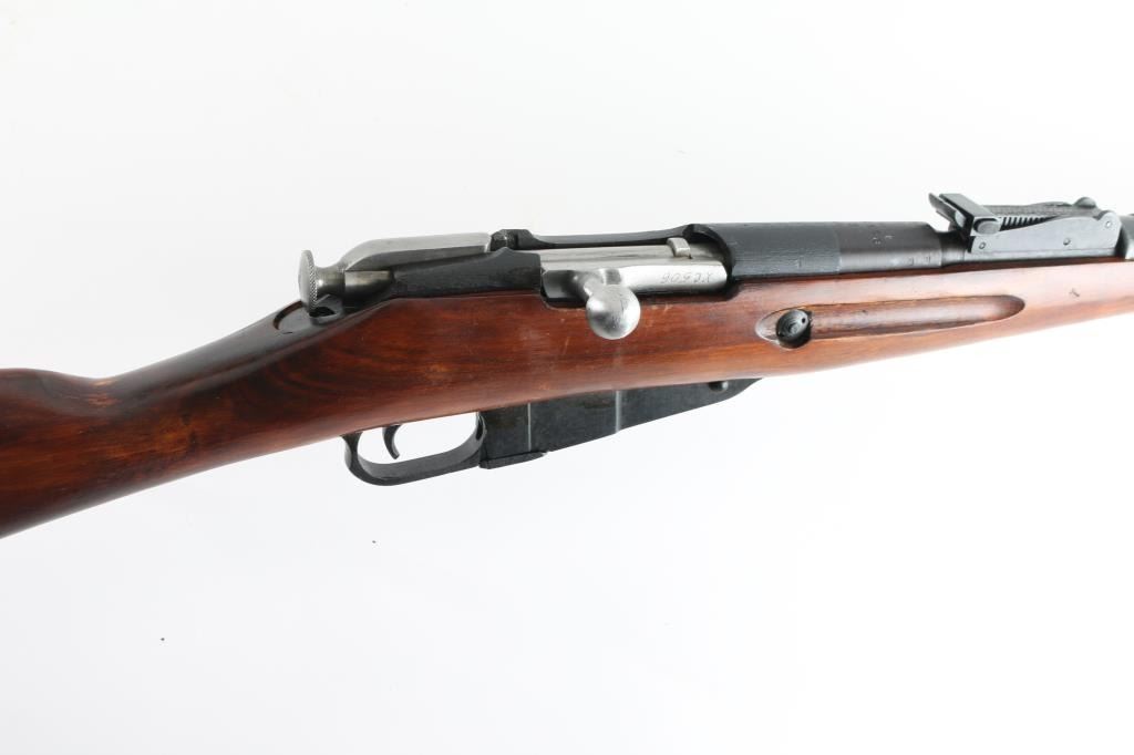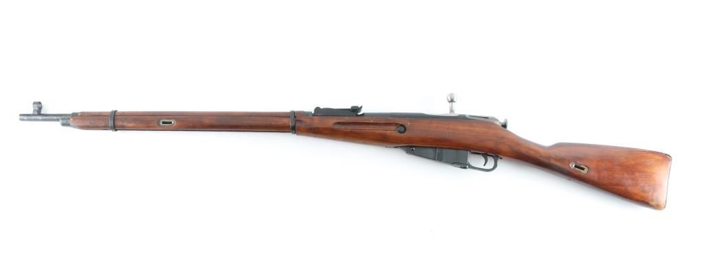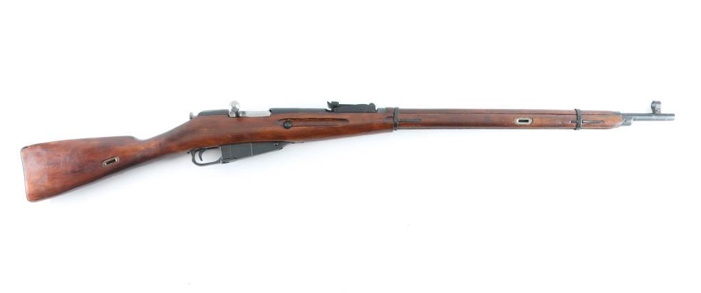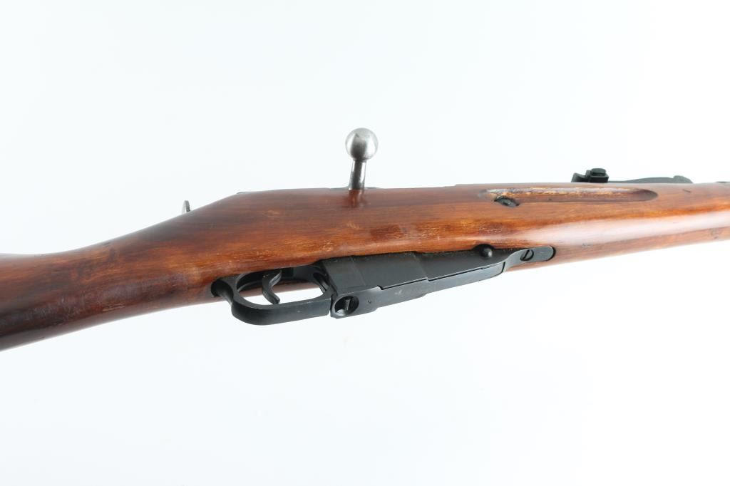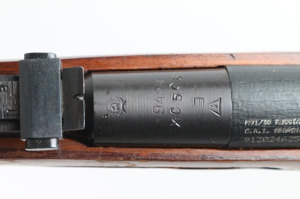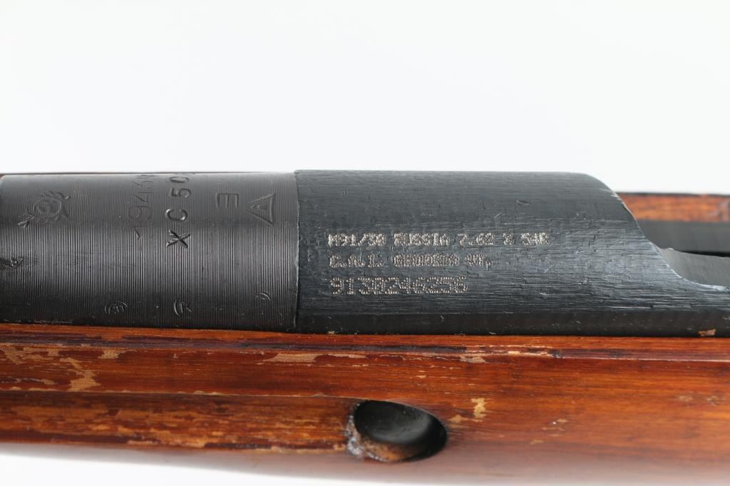 SN: 9130246256 Russian (Soviet Union) WW2 military bolt action rifle dated 1943. Imported by CAI. Arsenal refinished. Features blued finish, wood stock & handguard, 29" barrel, post front sight, tangent rear sight, sling slots. Bore is very good. Metal retains 94% dark blue finish, with minor edge wear/scuffs. Bare metal bolt. Wood is very good with minor scratches/scuffs, some finish loss from handling, Original serial number matches on receiver, bolt. floorplate, and steel buttplate, electro-pencilled except for the receiver. No cleaning rod. NRA Condition-Very Good. C&R Firearm