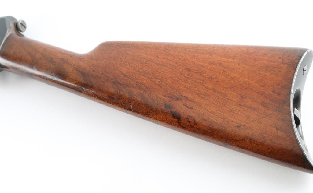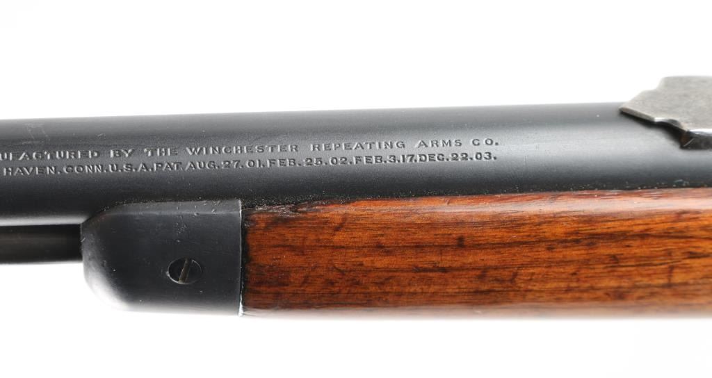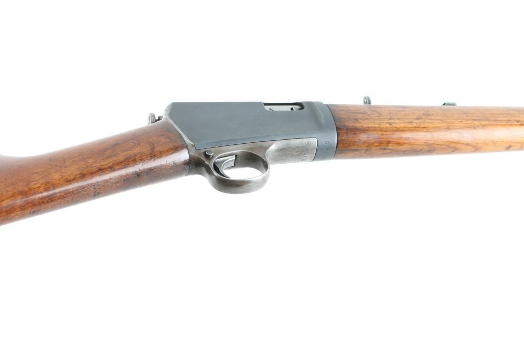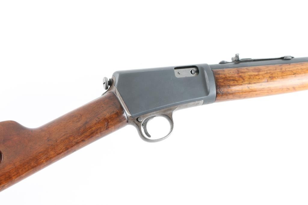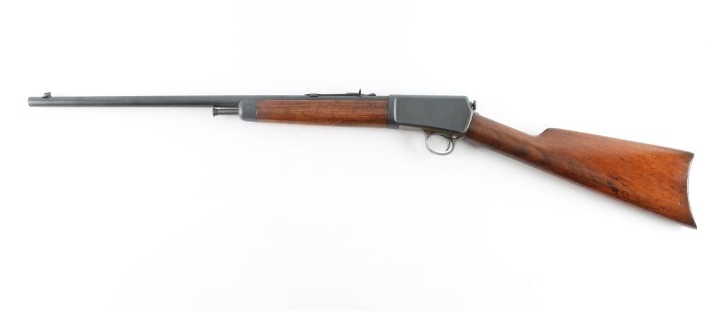 Vintage semiautomatic rimfire rifle manufactured circa 1909. Features blued finish, wood forend with steel nose cap, wood butt with straight grip, steel semi-crescent buttplate, 20" barrel, dovetailed blade front sight, sporting rear sight, magazine tube in butt, manual safety, takedown screw at receiver rear. Bore is very good condition. Retains 75% finish, reblued receiver & barrel, thin brown over bare metal on trigger housing and lower tang. Markings are sharp, and numbers on receiver & trigger group match. Wood is very good condition overall, varnished over small dents and some minor oil staining. Trigger does not return, needs repair to return spring. Condition is NRA Fair (refinished, needs repair) *** C&R Firearm ***