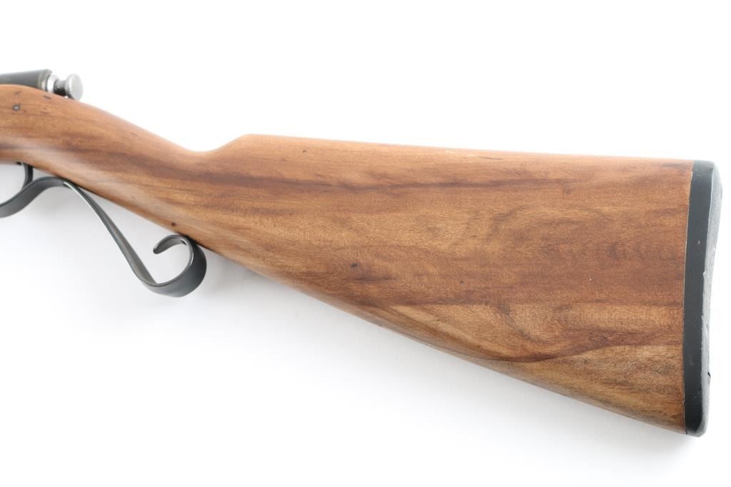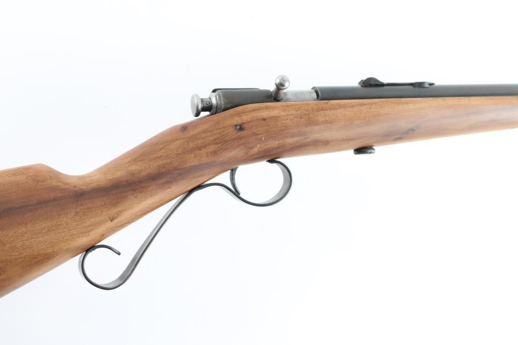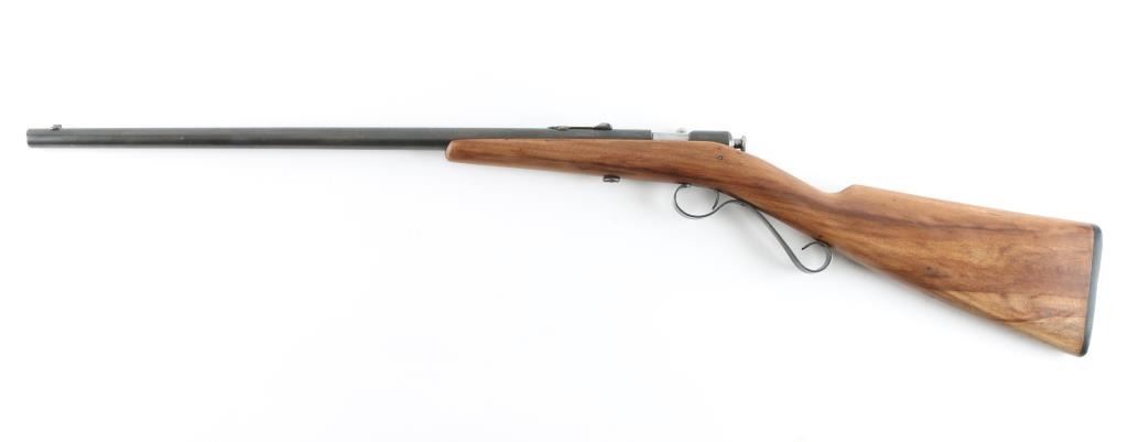 American made single shot bolt action rifle, manufactured circa 1904-1931. Features a blued finish, 21" barrel, dovetailed blade front sight (bead top broken off), adjustable rear sight, metal trigger guard with fancy finger rest, smooth wood shoulder stock, factory composition buttplate. Bore is good condition, frosted with some light pitting, might improve with a good cleaning and lead removal. Retains 90% coverage of re-blued finish, mostly turned brown, showing old tiny pits (giving a slightly rough texture), dents and other blemishes to the surface texture underneath. Markings are sharp. Stock is very good condition, sanded and finished with clear coat, some dents and other impacts show as darker color. Condition is NRA Very Good (refinished) *** C&R Firearm ***