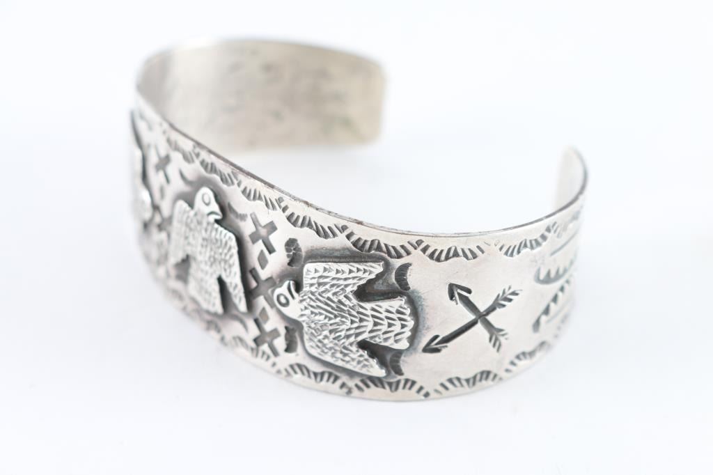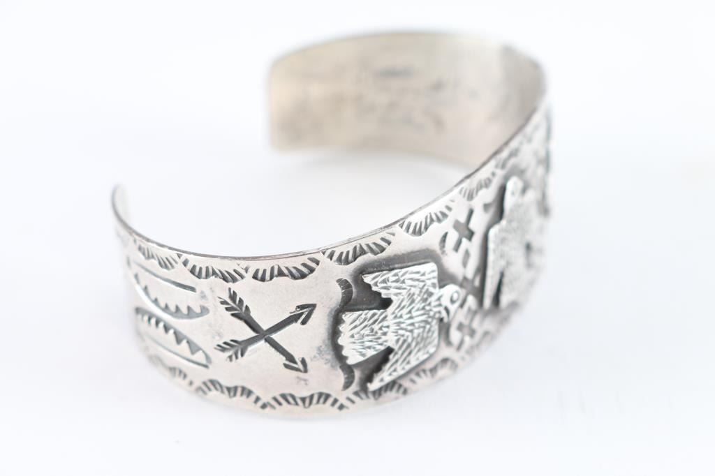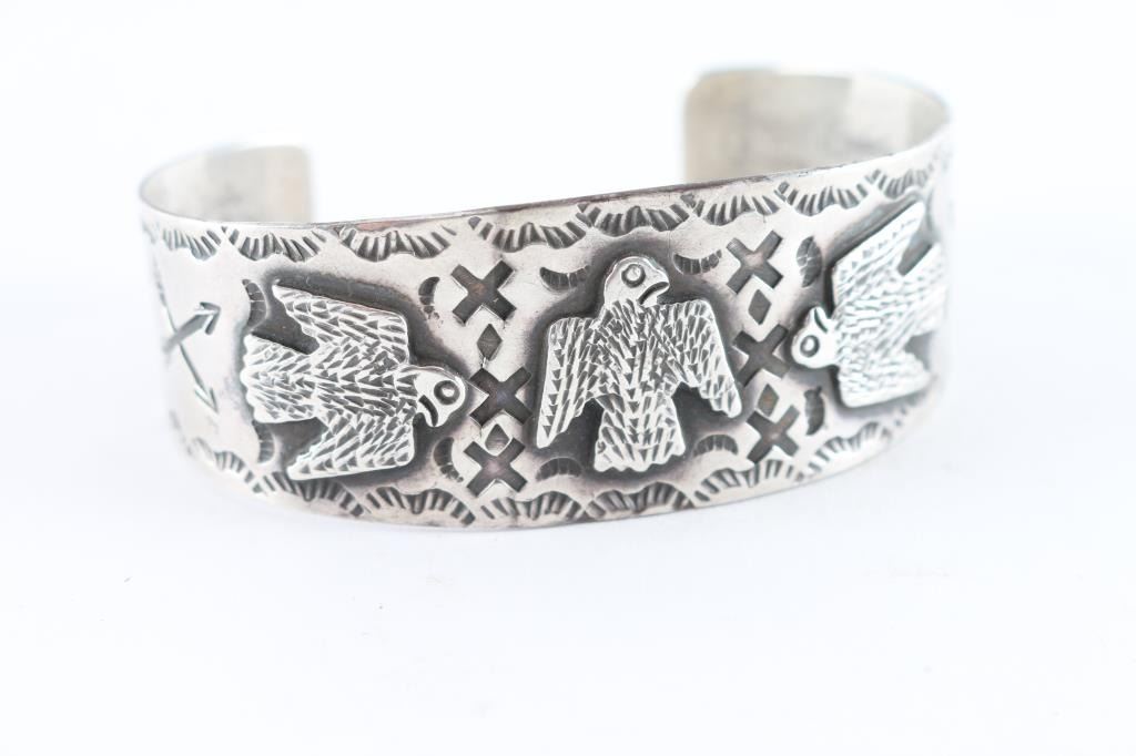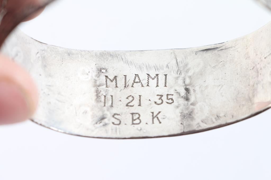 With thunderbird motif, all sterling sliver, old pawn, marked "Miami 11.21.35 S.B.K". Measures approx 2.75" wide, 1.75" tall, made from a strip approx 6.5" long.