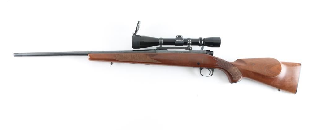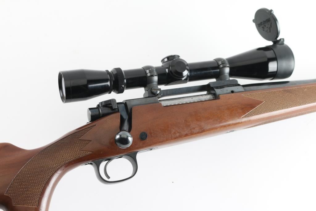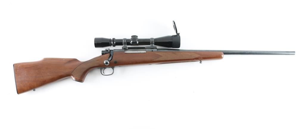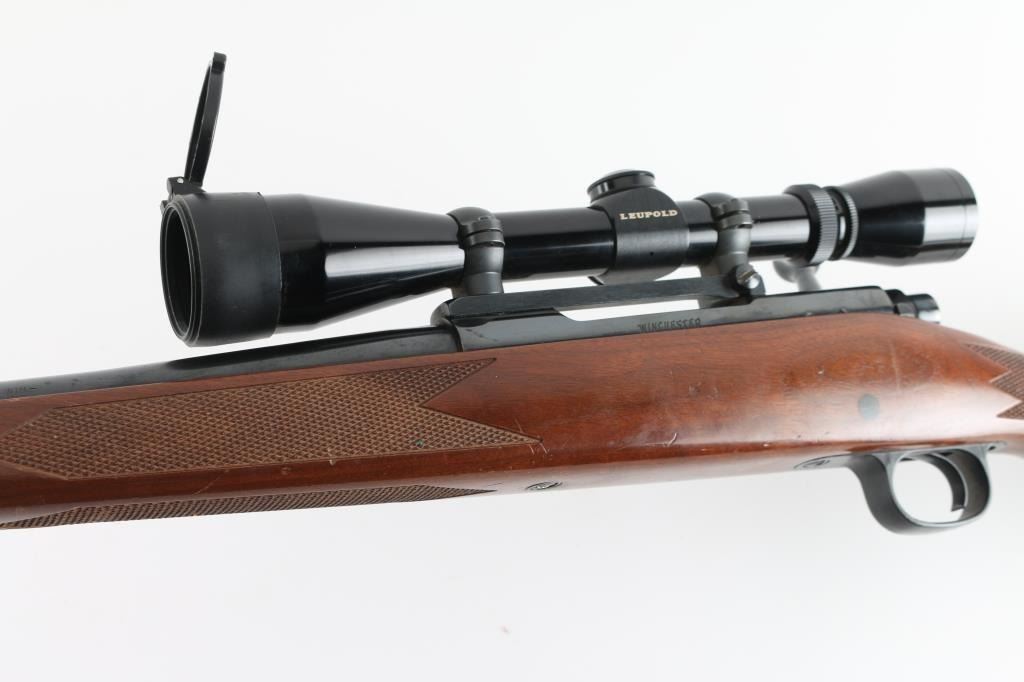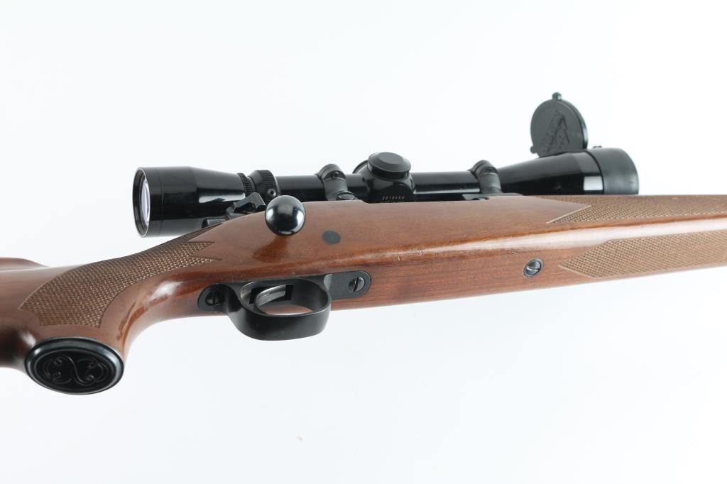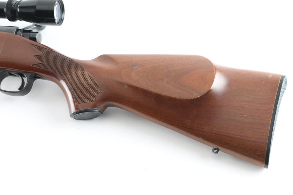 Push feed bolt action sporting rifle, manufactured circa 1978. Features a polished blued finish, 22" tapered barrel, drilled/tapped for sights, serrated wide trigger, jeweled bolt with three position safety on the rear, internal box magazine with hinged floorplate, swivel studs, and checkered pistol grip walnut shoulder stock with right handed cheek rest, Black plastic factory buttplate & 13,5" LOP. Rifle exhibits nearly all of it's original blued finish with some rubs and a small area of pitting at the muzzle. Action is smooth, the bore is very good and the wood stock is very good with minor scratches. Mounted with a Leupold VX-I 3-9x450mm scope, clear optics. NRA Condition-Good+ Modern firearm