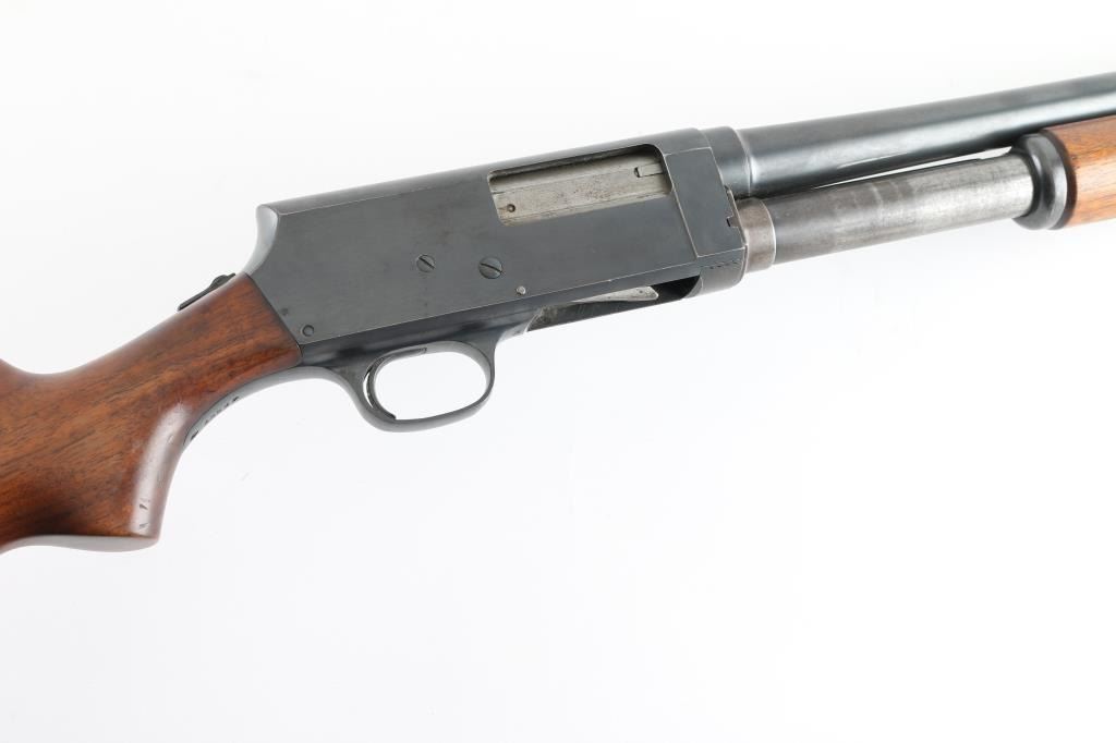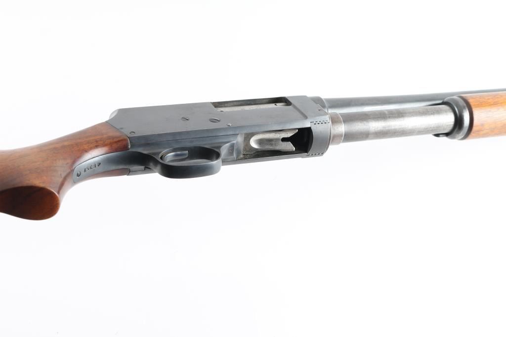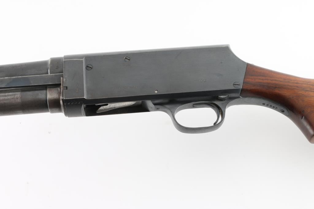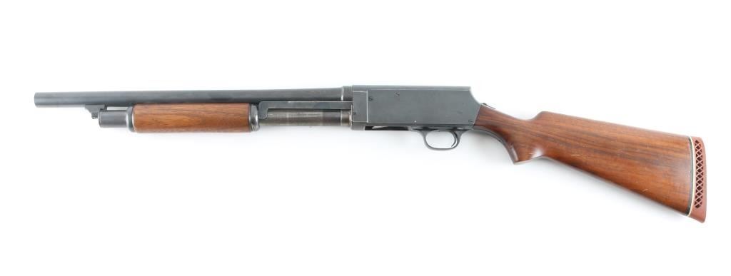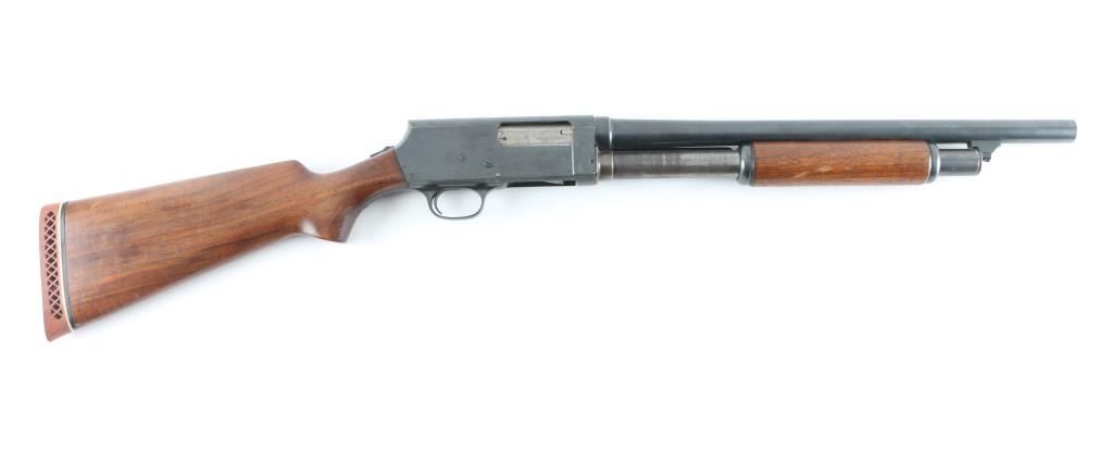 WW2 era U.S. Military trench gun, also used in Korea, and Vietnam. Dull blue wartime finish, upper tang sliding safety, and locking block in the top of frame. Three line address, and two line gauge markings on the left barrel. Left frame marked "U.S". above the trigger, "P" ordnance bomb proofs on left frame, and barrel. Smooth metal jacketed wood forearm, and pistol grip stock. Bore is excellent, action is smooth,wood is very good, with some minor scratches/dings. Blue is very good with minor scratches/scuffs. Note* This shotgun has been sporterized with the following changes, 20" barrel has been shortened to 18", no sighting bead. Heat shield/bayonet lug has been removed, a Pachmayr recoil pad has been added. NRA Condition-Very Good as Sporterized. C&R Firearm