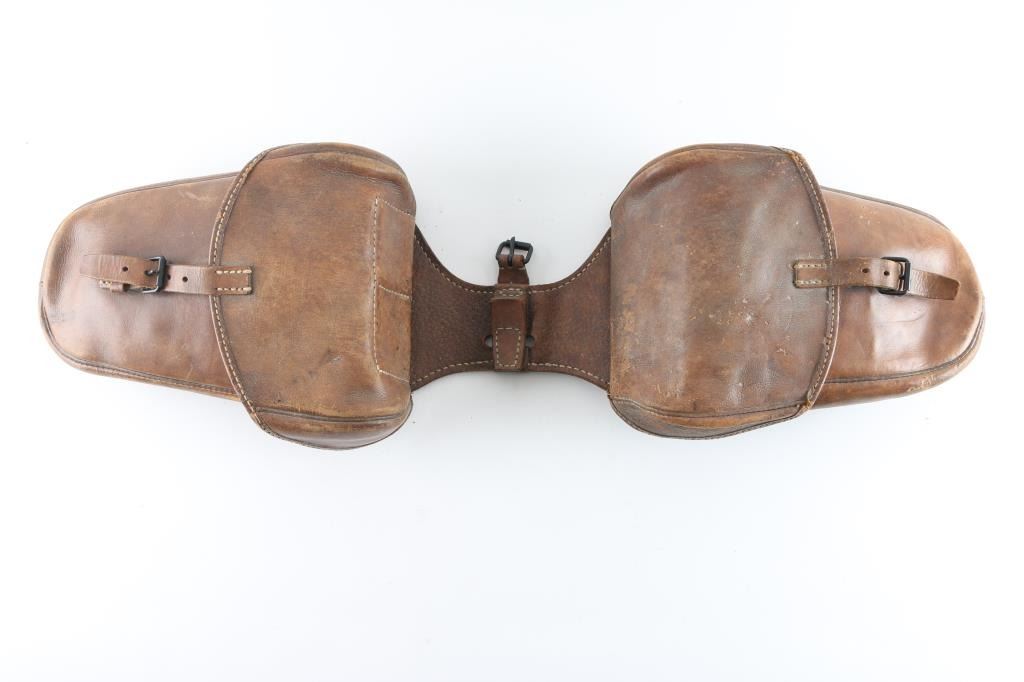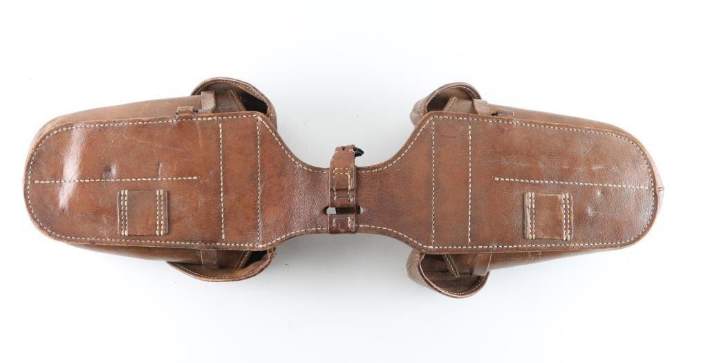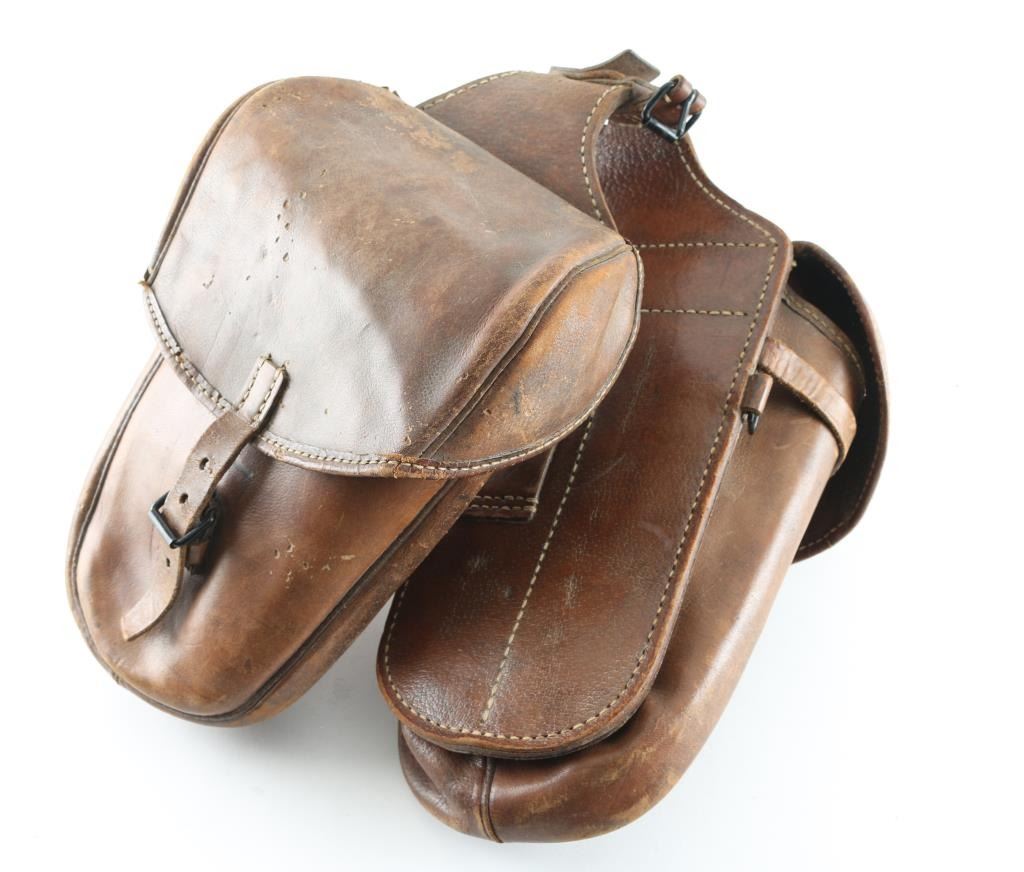 In fair condition, shows sign of age with slight cracking on right bag, pig skin construction with white cotton stitching.