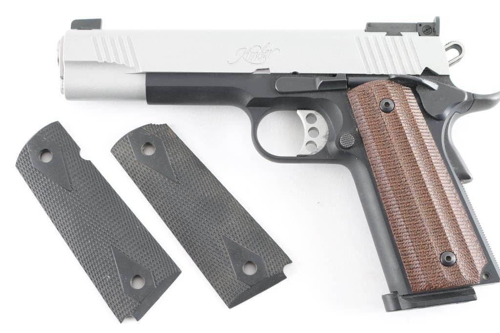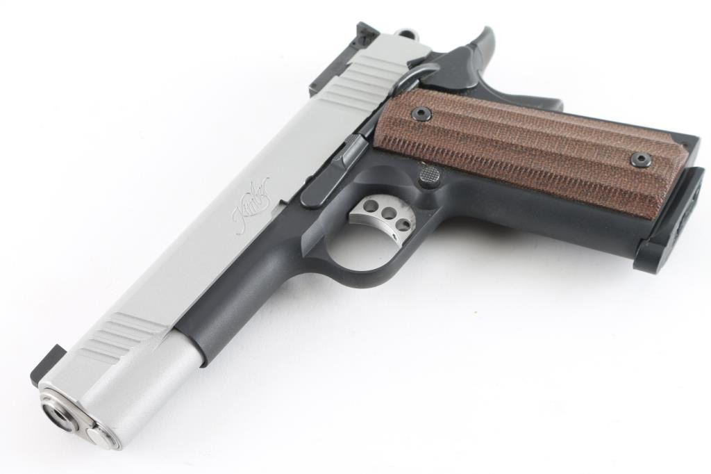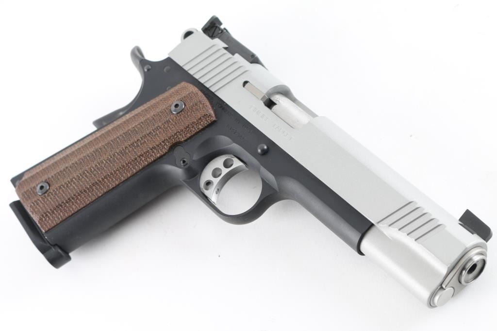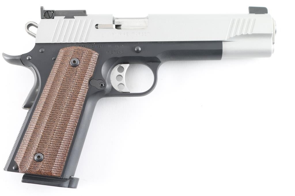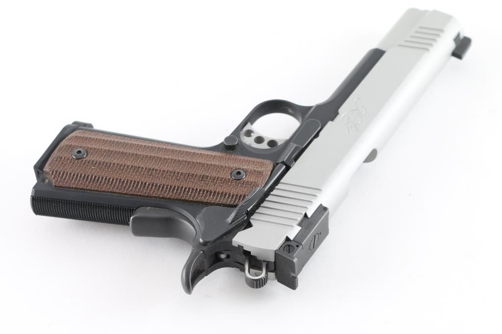 Semi-automatic 1911-A1 style rimfire pistol chambered in .22 LR. Features a matte gray slide finish, and a matte black frame. 5.25" barrel with recessed crown, dovetailed blade front sight, adjustable rear notch sight, adjustable serrated trigger, skeletonized hammer, manual safety, beavertail grip safety, push button magazine release, knurled mainspring housing. Faux contoured wood grips.10 round magazine, and two piece checkered black rubber grips. Includes factory hard case with lock, set of checkered diamond polymer grips. and documents. Pistol shows little to no wear. Action is smooth, bore is excellent, and grips are fine. Comes with one magazine. NRA Condition-Excellent. ***Modern Firearm***