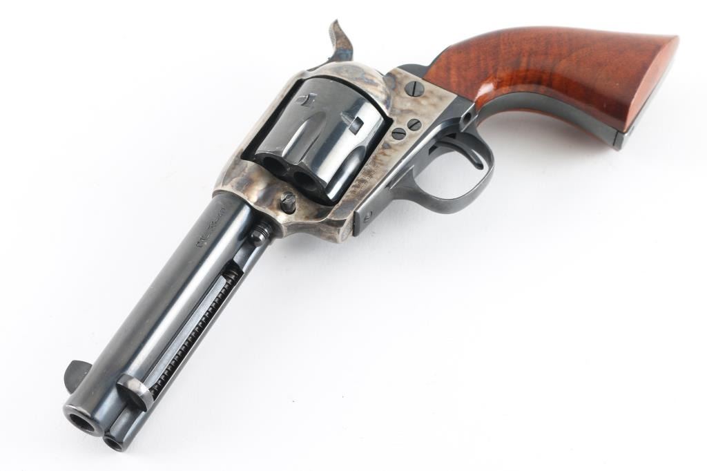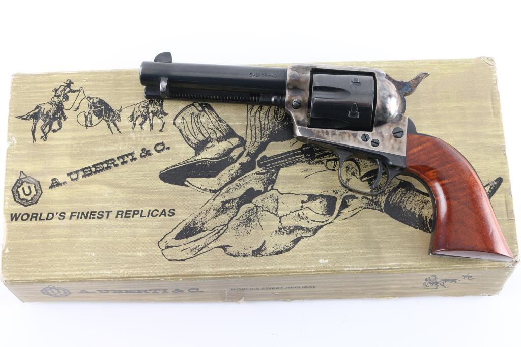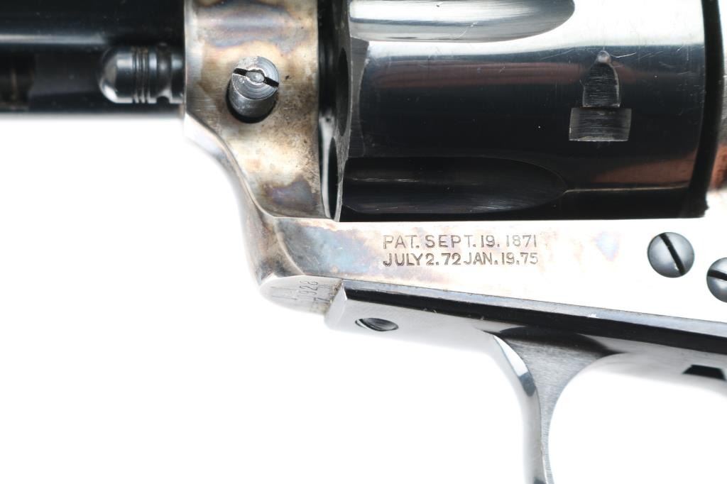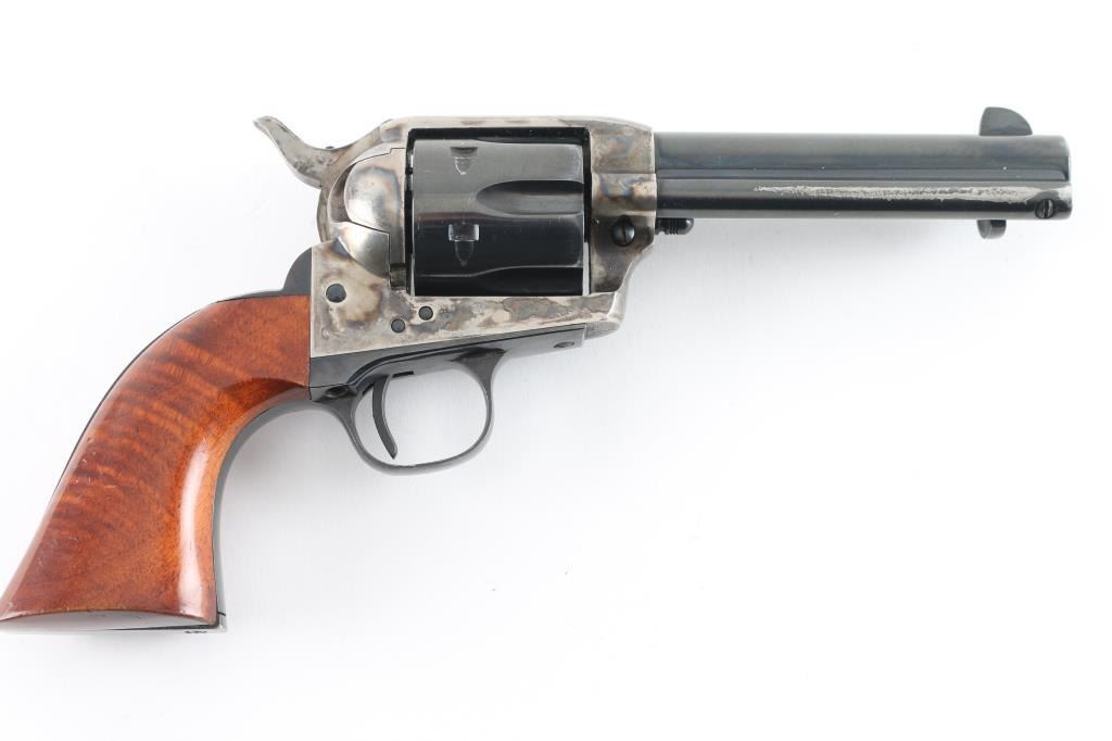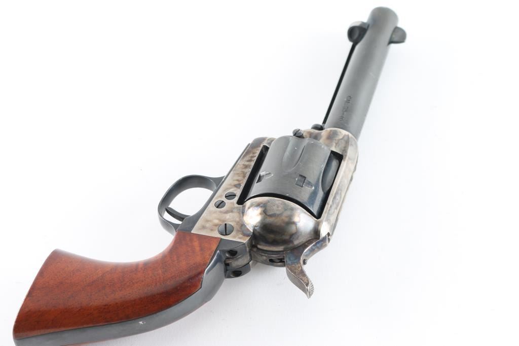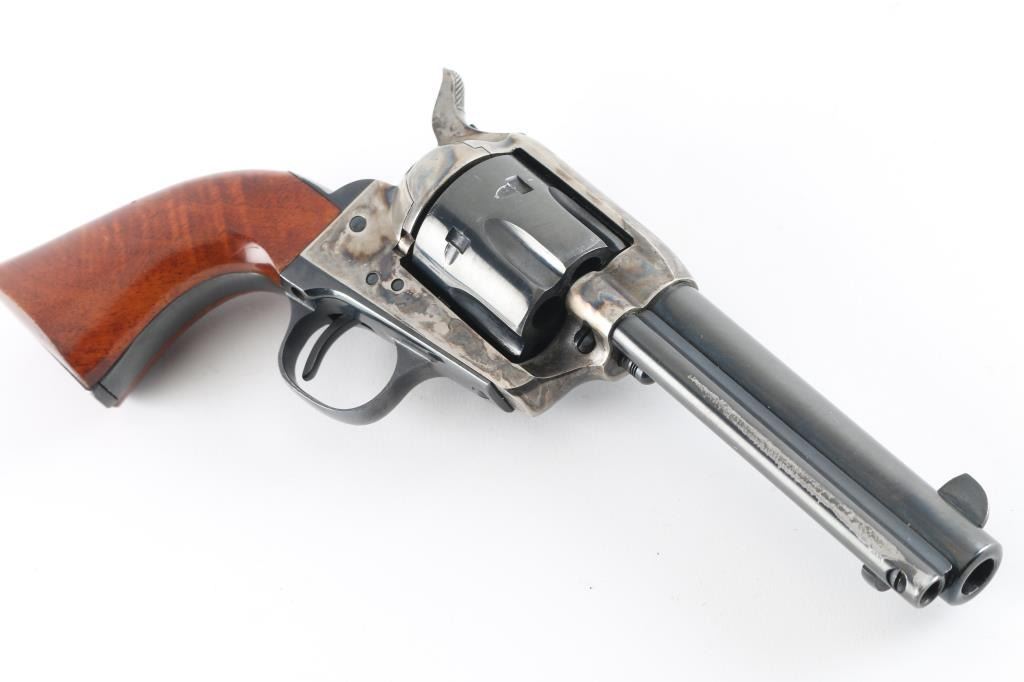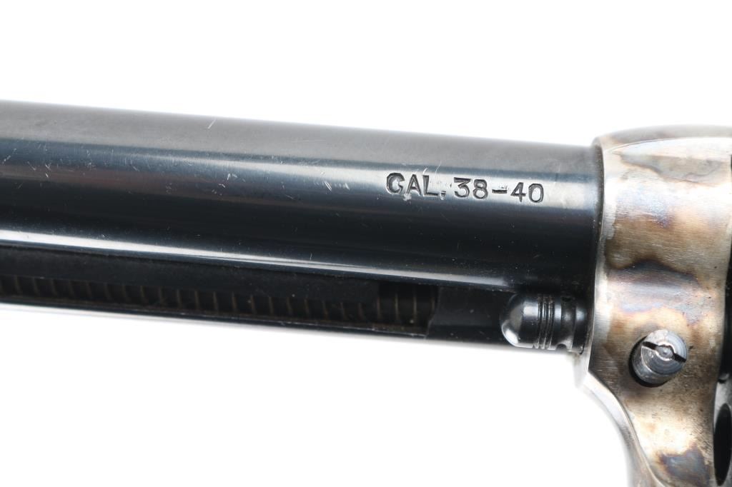 Italian made six shot revolver chambered in .38-40 and modeled after the Colt Single Action Army. Features a 4-3/4" blued barrel, fixed sights, case hardened frame, & hammer blued cylinder, trigger, trigger guard & backstrap, checkered hammer spur and one piece walnut grips. Revolver retains 92% original finish, with some edge wears/scratches, there is a narrow 3" scrape along the ejector rod housing. Bore is very good with strong rifling, but a little dirty. Action is crisp/tight. Grips are very good with minor dings. Comes in original factory box with manual. NRA Condition-Near Very good. Modern Firearm