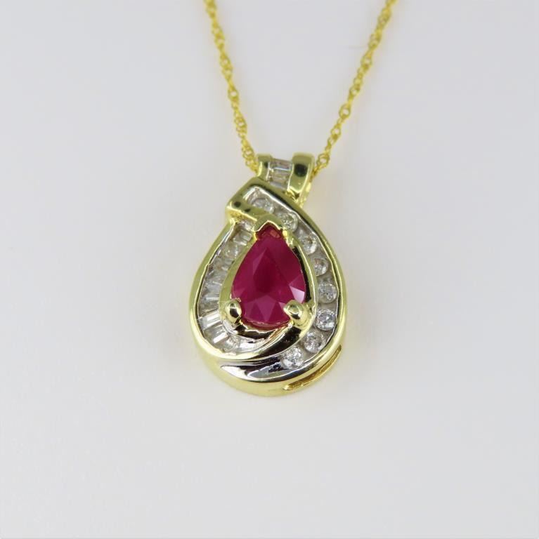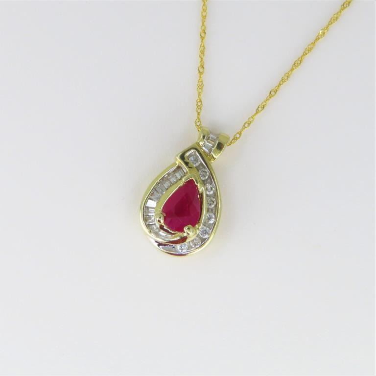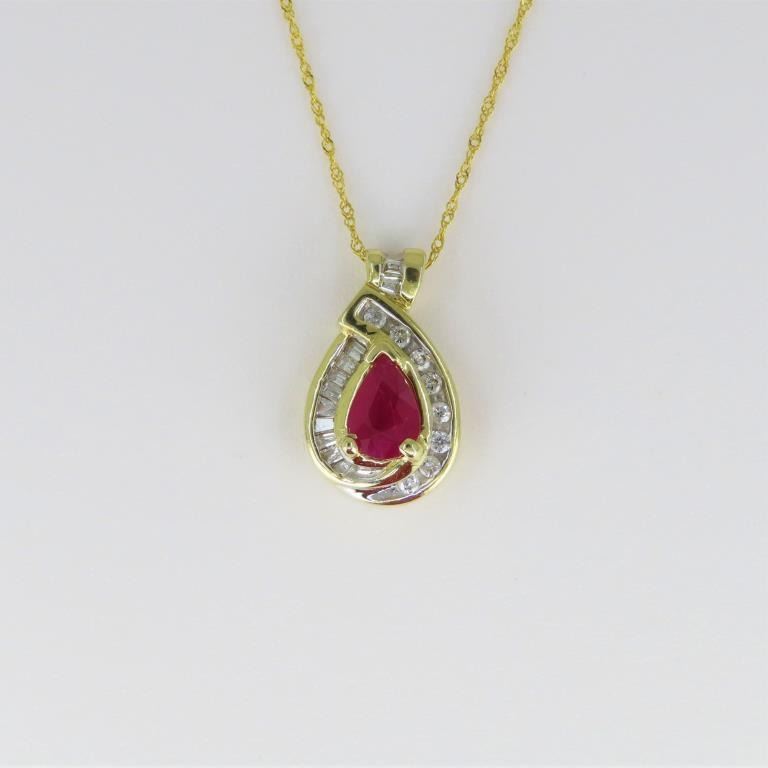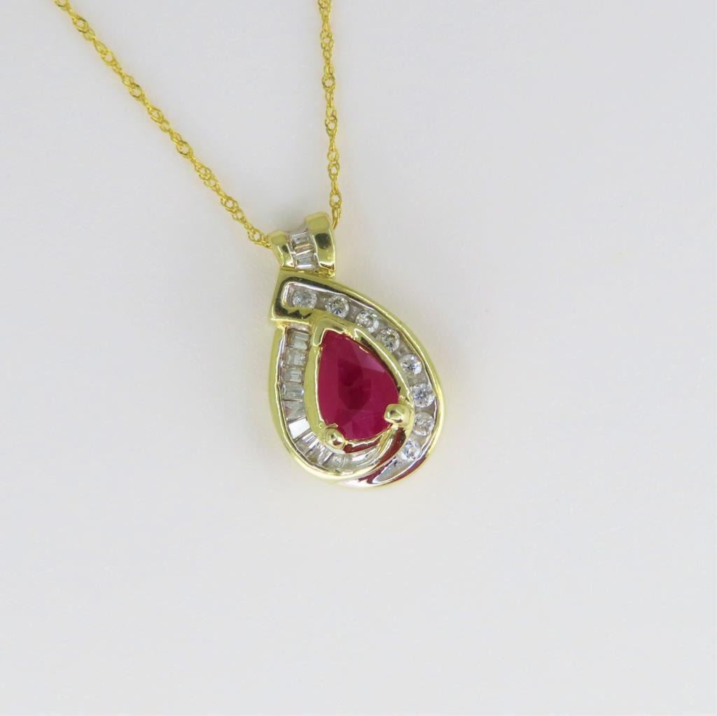 Bright Red Ruby and Diamond Pendant featuring a pear shape Ruby weighing approx. 1.00 carat surrounded by 20 round and baguette cut Diamonds weighing approx. 0.50 carats with H-I colors and SI clarity set in 14 karat yellow gold setting.