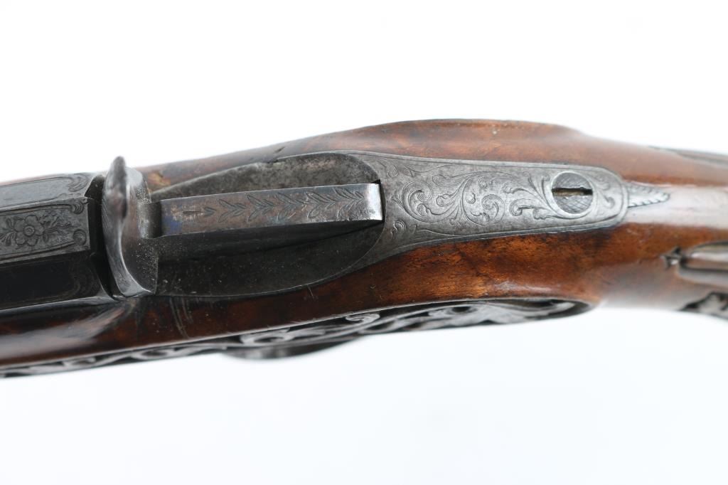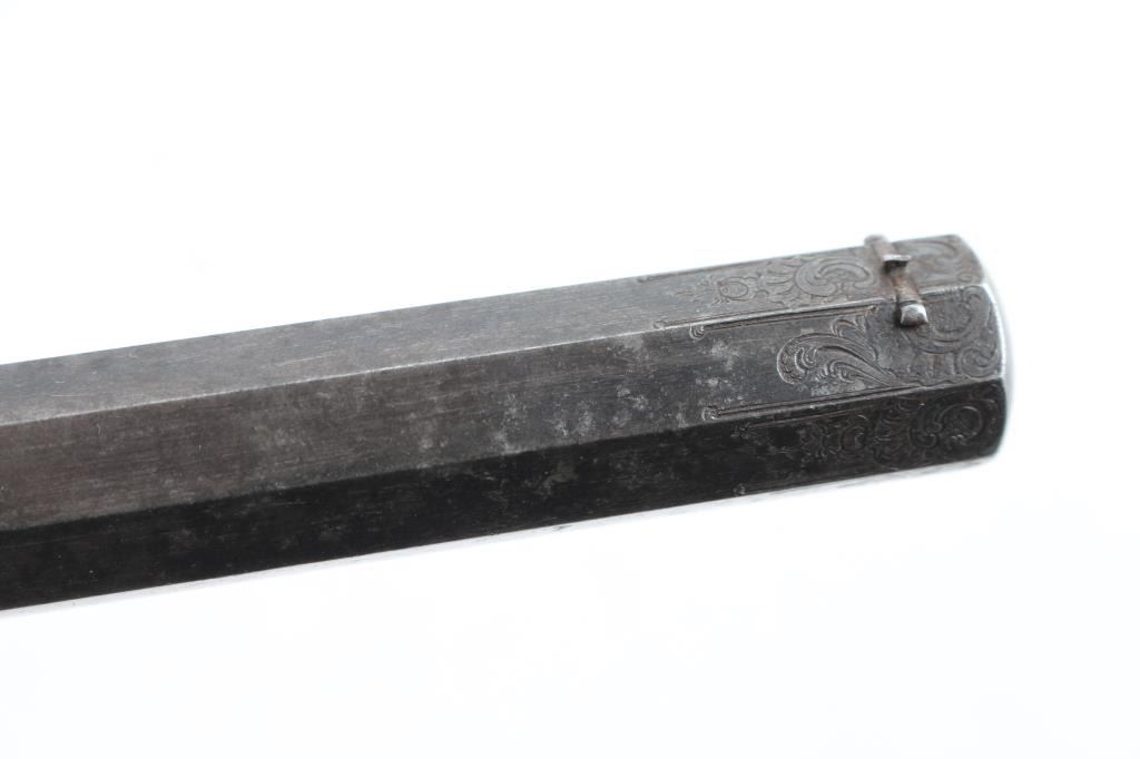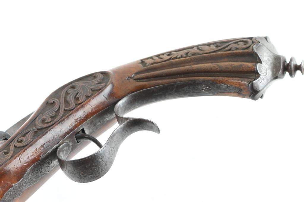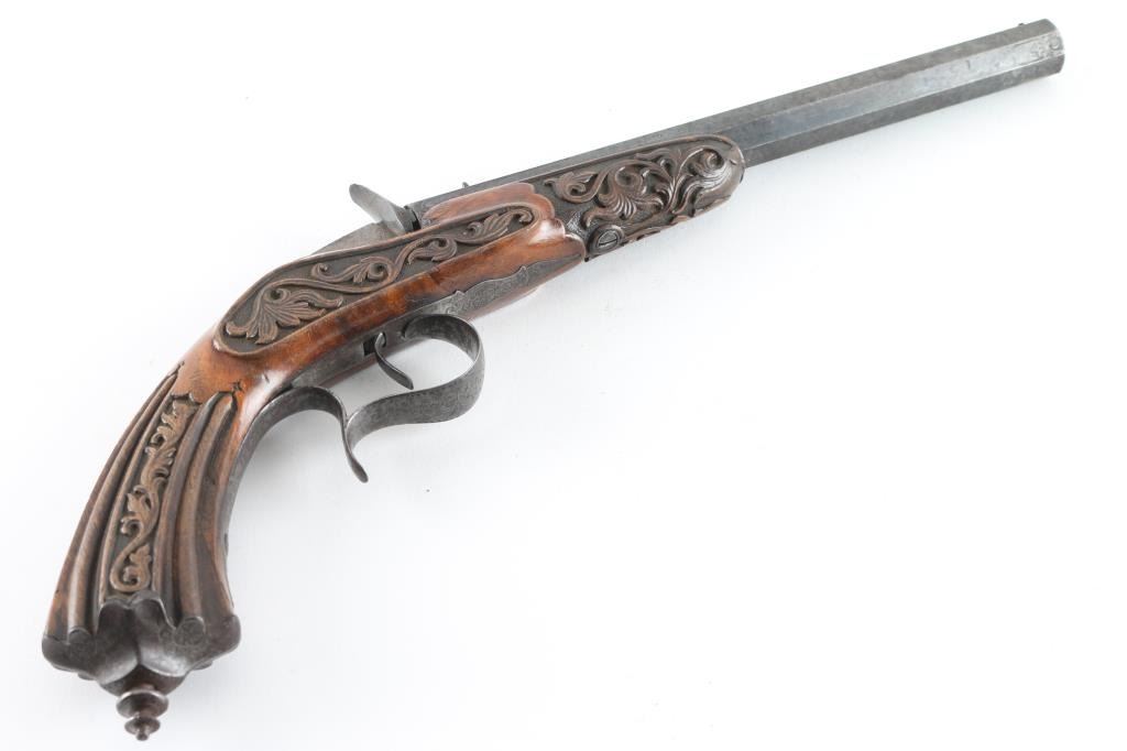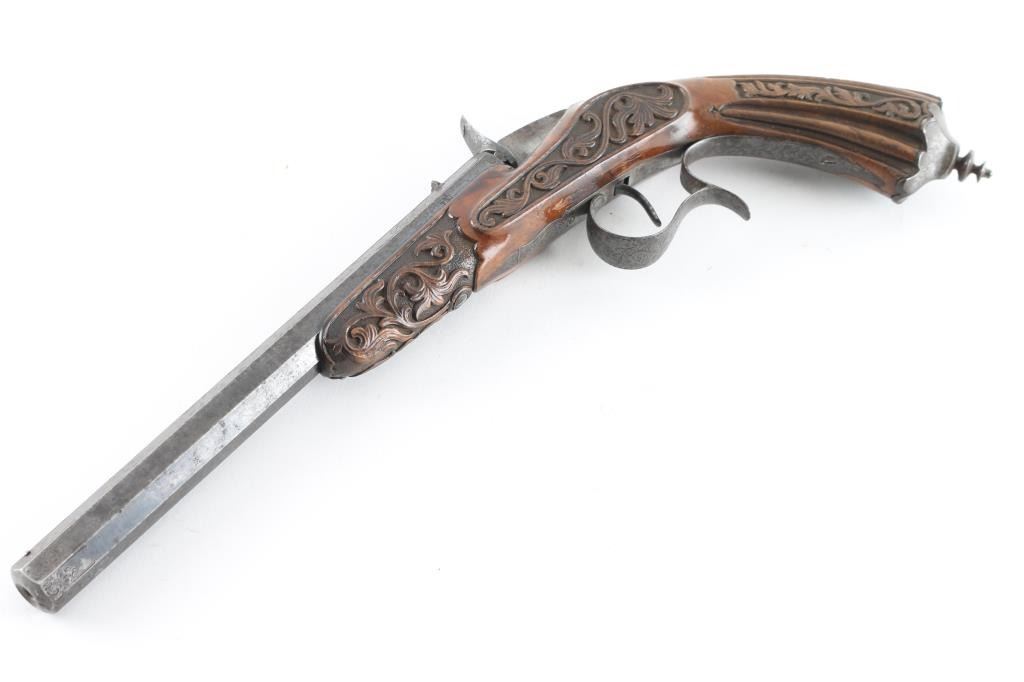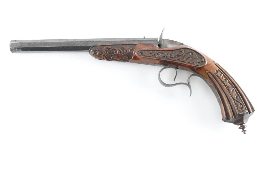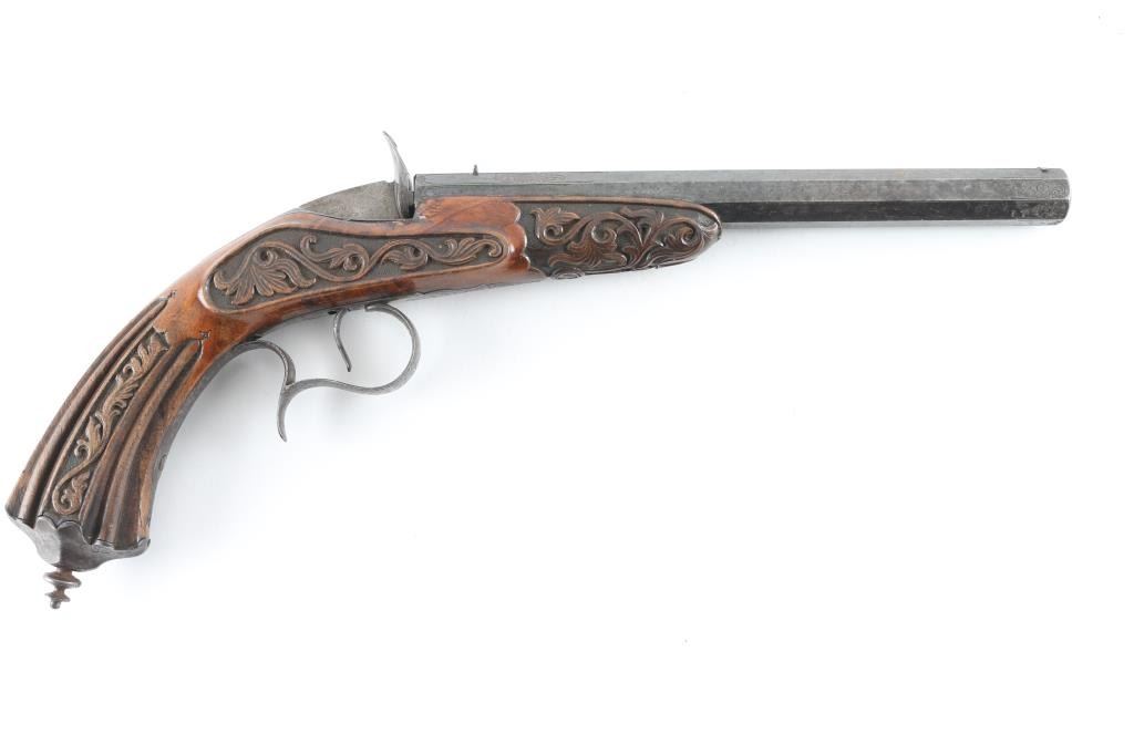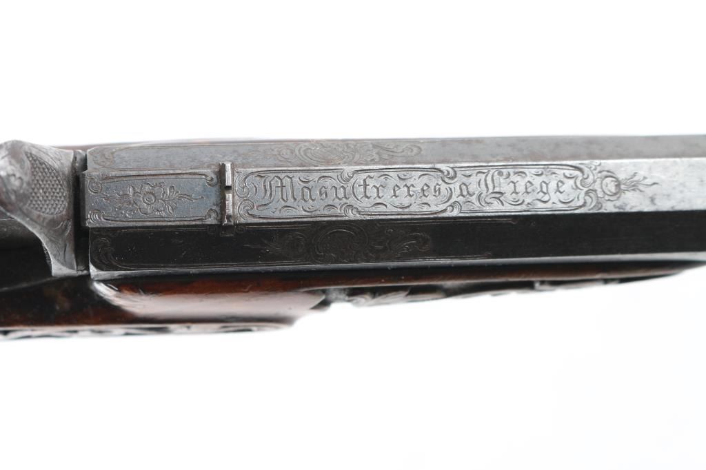 From late 19th century engraved in fancy script on barrel. Marked "Masu-Freres-Liege"( Belgium). Fancy carved in relief carved wood stock and blued octagon barrel. Approx 22 rim fire black powder proofed. Approx 60-80% blue with some light rust and erosion which may clean. Stock near fine. Action good. Bore dark. Some minor pitting. High quality and full size and weight, 15inch overall with 9inch barrel. "Antique" Firearm