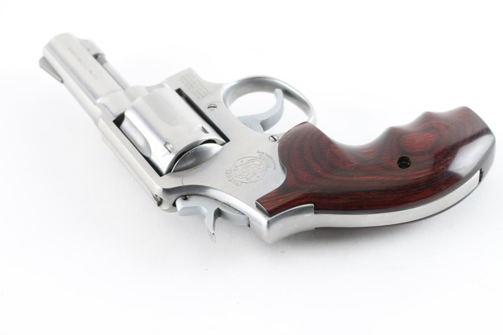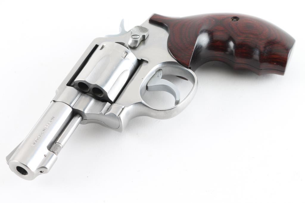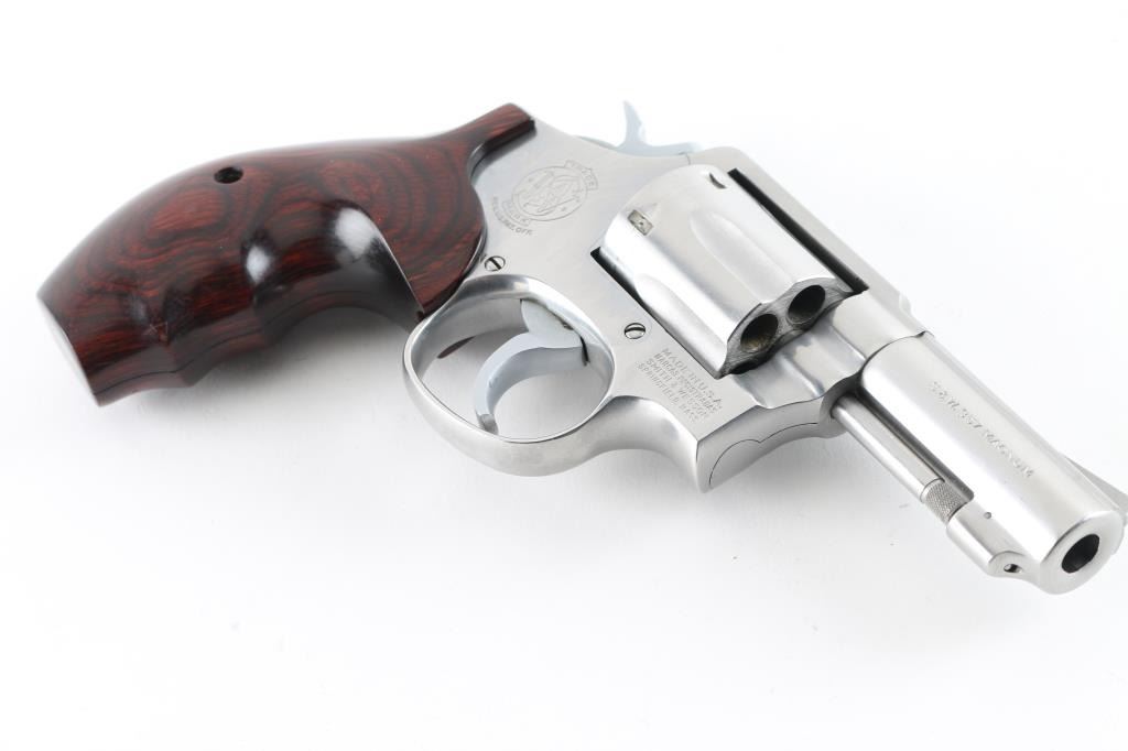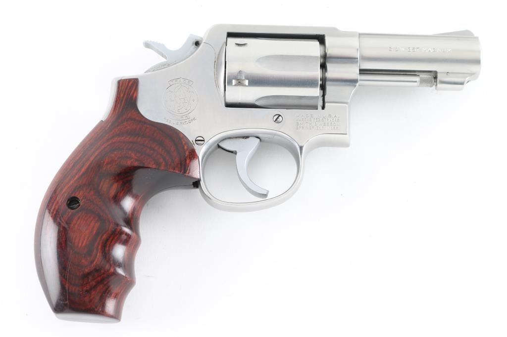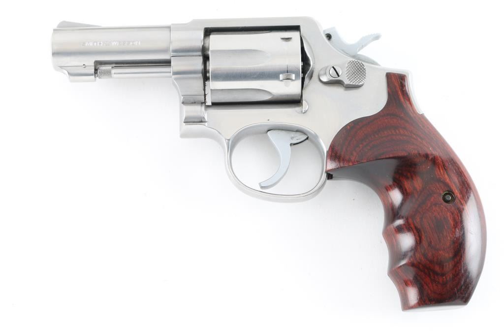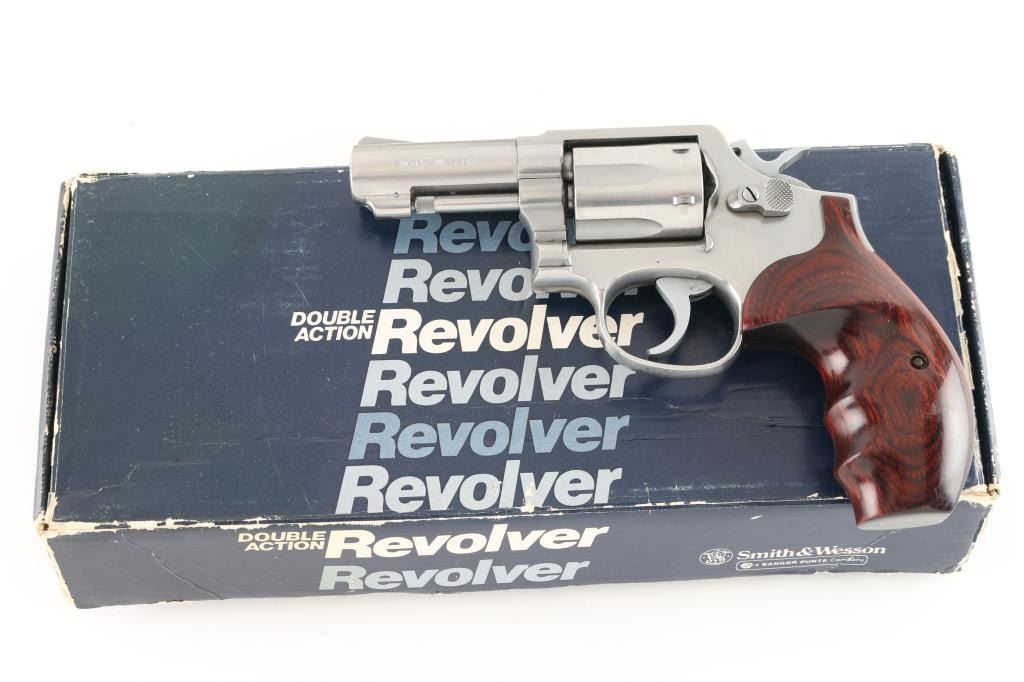 Revolver. "The .357 Military & Police Heavy Barrel Stainless." D/A, S/A. 6-Rd Capacity. Heavy barrel stainless. (1972-2004) Built on the K service frame with 3 screws. Round butt frame. 3" barrel with serrated ramp front, and square-notch rear sights. Stainless steel finish. Deluxe hardwood contoured grips. Bore and Cylinders are very good but a little dirty. Metal finish is good with numerous minor scratches. Grips are very good. Comes in original, matched blue S&W factory box with paperwork, and cleaning rod. NRA Condition-Very Good. Modern Firearm