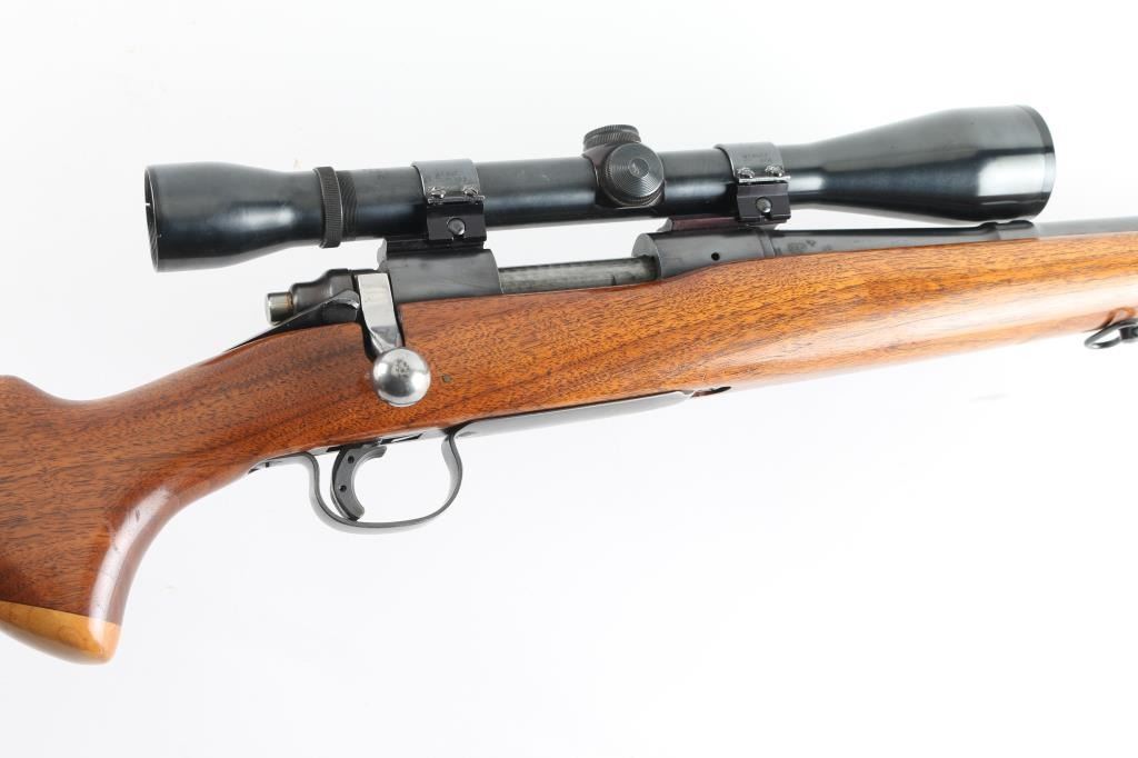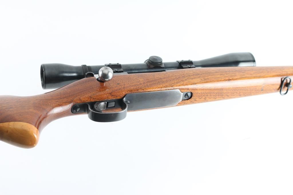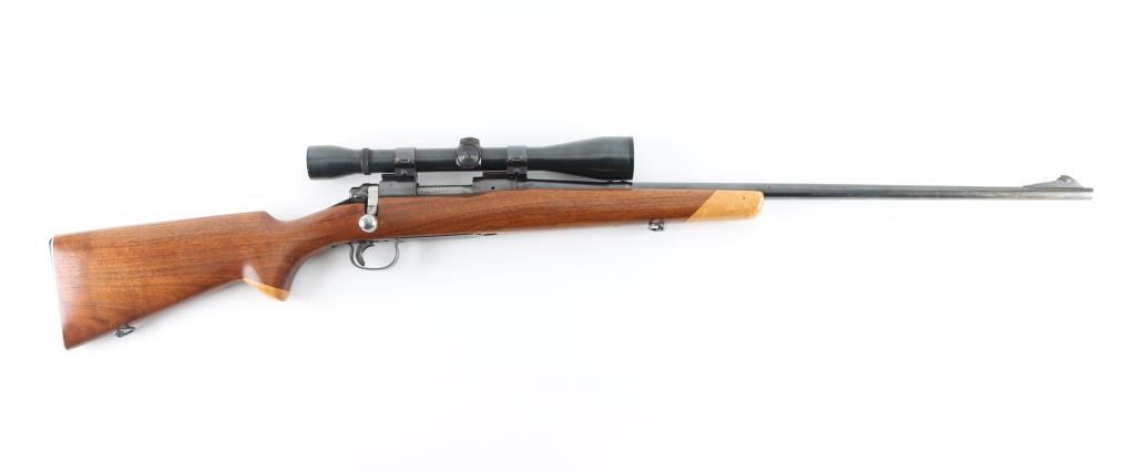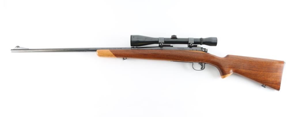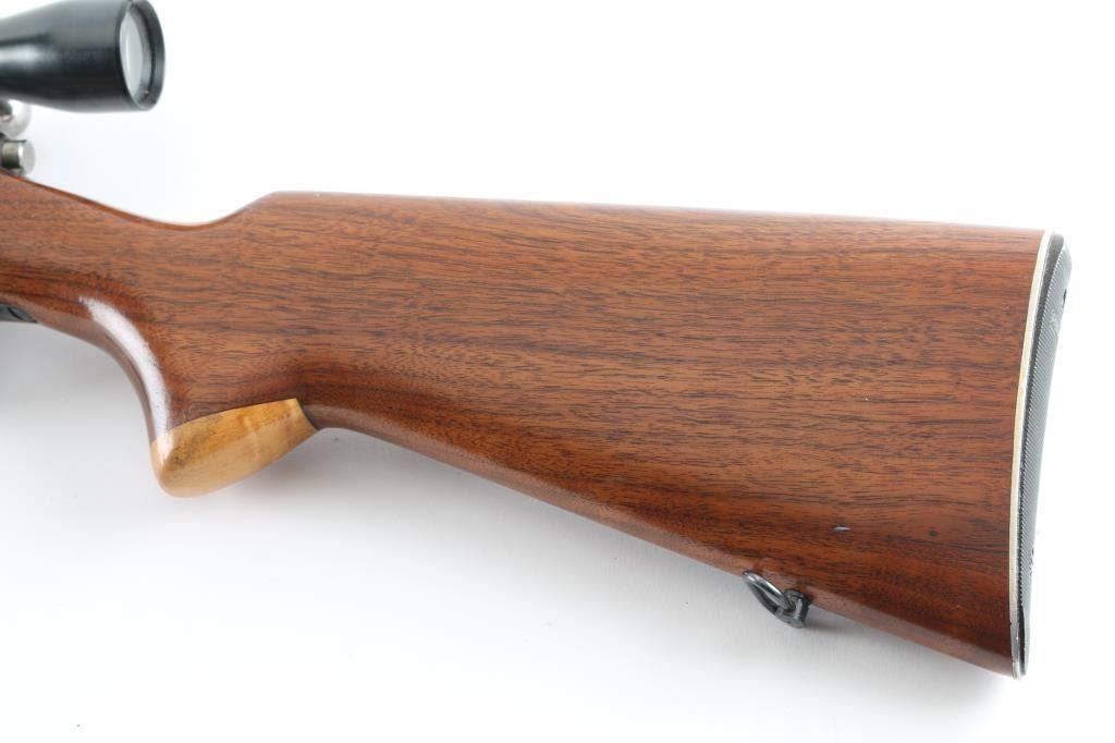 Bolt action rifle with 1952 date code on barrel. Features blued finish, 26" barrel, smooth walnut stock with maple forend tip & grip cap, blade front sight, empty dovetail in barrel (sight removed), two piece Weaver scope bases, manual safety, sling swivels, ribbed aluminum factory buttplate. Wide trigger shoe with serrated face attached to trigger. Bore is very good condition. Retains 60% finish with mostly bare metal on floor plate, large area of cleaned patina and some scaly texture on barrel near muzzle. Stock is very good condition. Mounts a very good condition Weaver K6 60-C scope, clear view, duplex reticle. Condition is NRA Good++ *** C&R Firearm ***