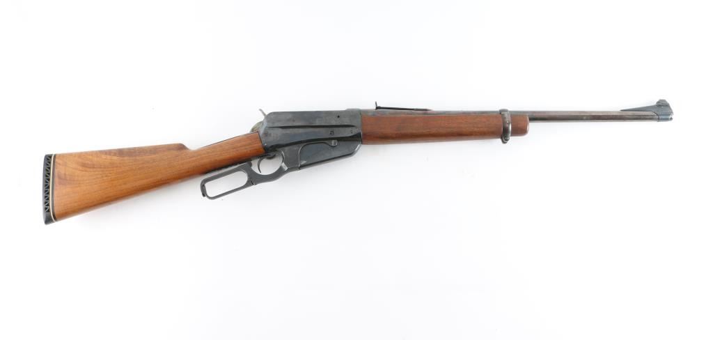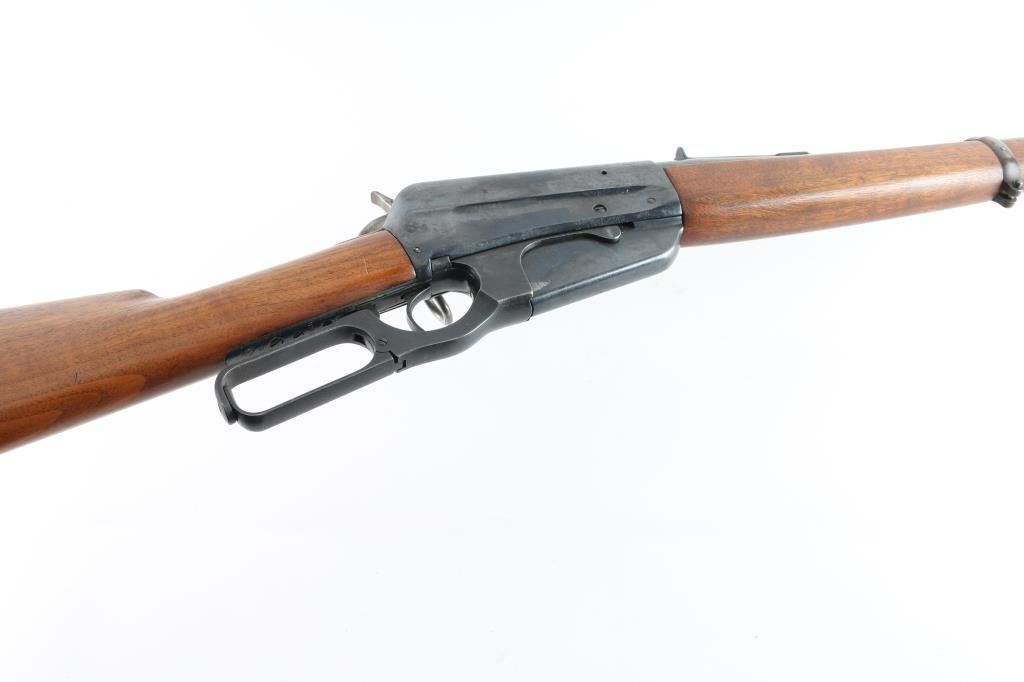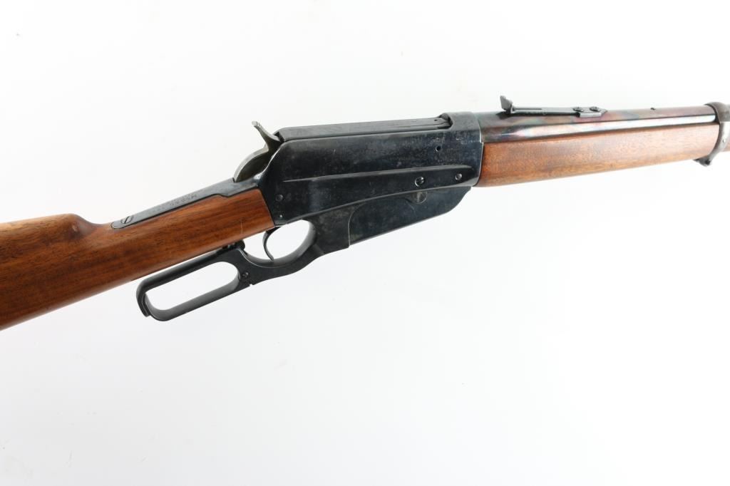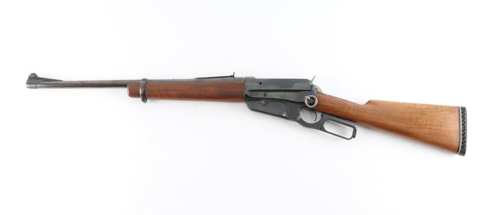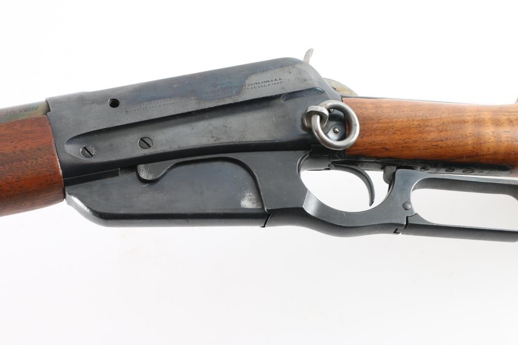 Lever action centerfire rifle chambered for 30-40 Krag. It has a 20" barrel, a Lyman raised ramp blade front sight, adjustable rear sight, serrated hammer spur and smooth trigger. Two piece smooth wood stocks with a barrel band on the forearm and a Pachmayr recoil pad. The sights are not period. Barrel marked .30 Army. The gun appears to have been reblued at some point. The nickel steel barrel is a plum color while the receiver has pitting under the reblue and shows some wear. A saddle ring has been added to the left side of the receiver. Wood stocks are fine. Bore looks good, needs cleaned. LOP is 13.25". Condition is NRA Good as redone *C&R Firearm*