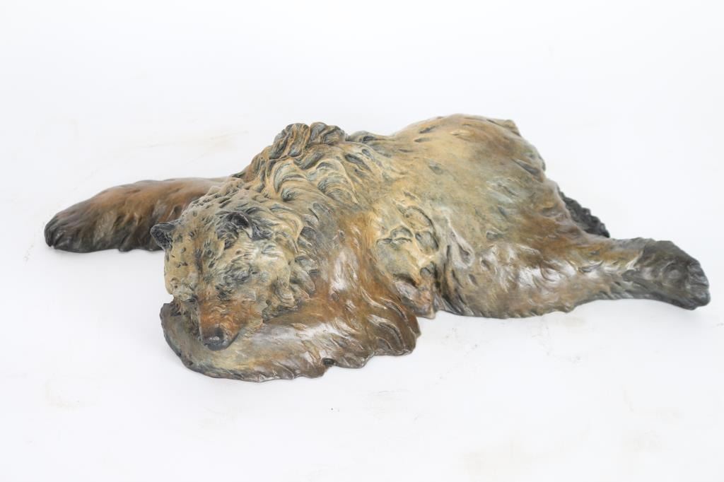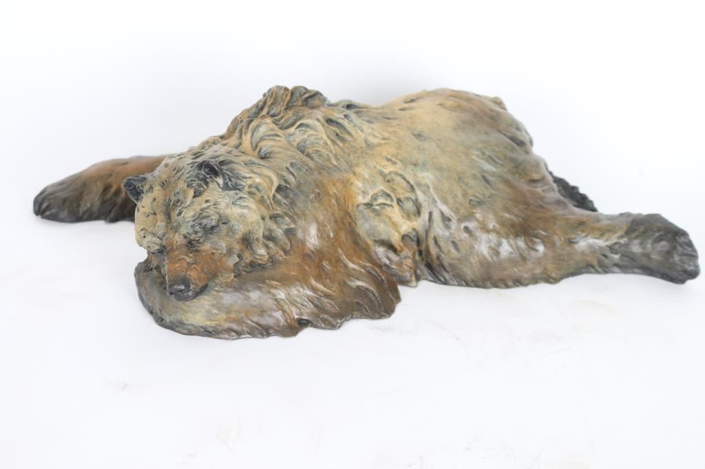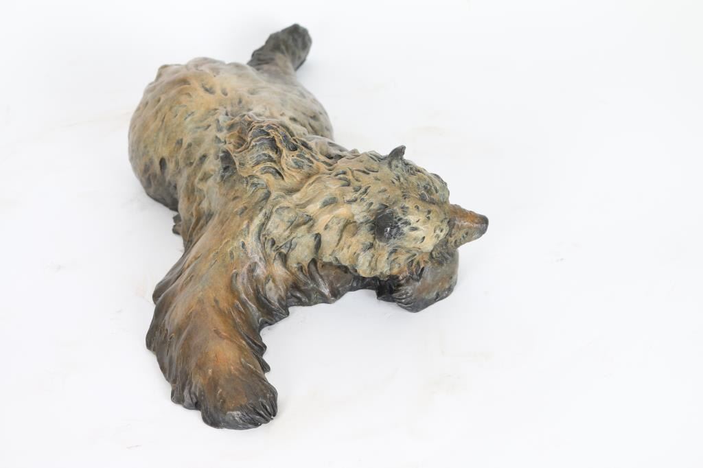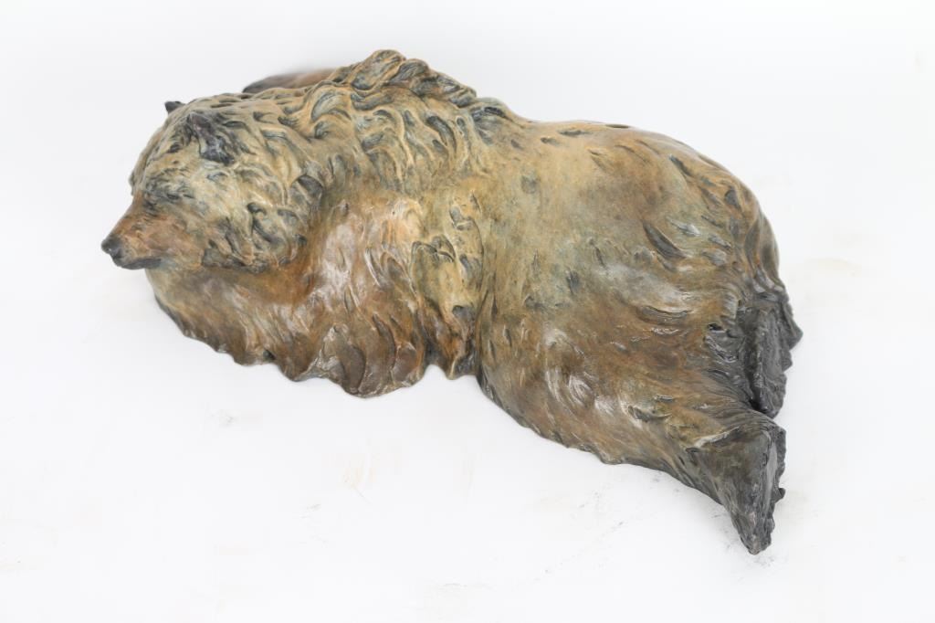 By J.D McKellar, entitled "Snoozing Bruin" signed in bronze. Measures 17x5x8". Jerry McKellar is known for Romantic wildlife and Indian sculpture.
