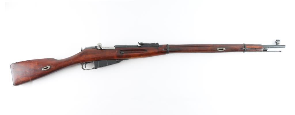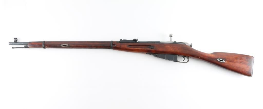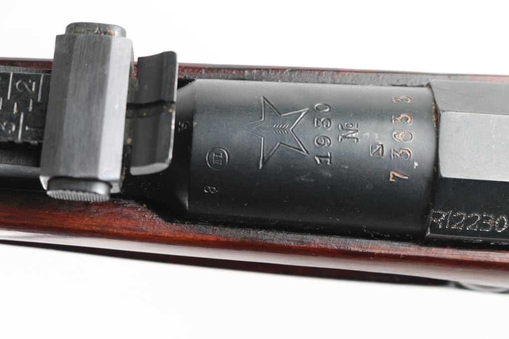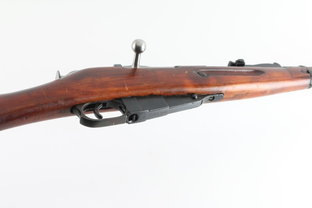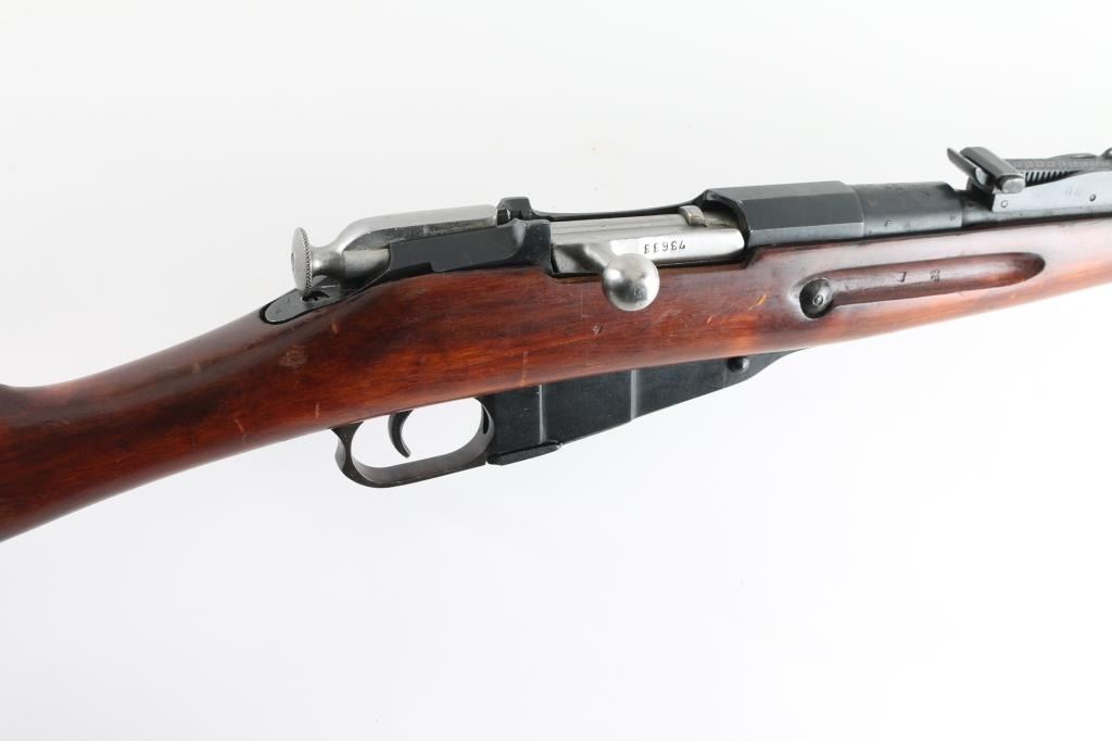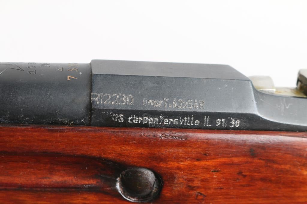 SN: R12230 Russian (Soviet Union) military bolt action rifle dated 1930. Imported by R Guns (Left Receiver) Arsenal refinished. Features blued finish, wood stock & handguard, 29" barrel, post front sight, tangent rear sight, sling slots. Bore is very good, with strong rifling. Metal retains 96% blue finish, with minor edge wear/scuffs. Bare metal bolt. Wood is very good with minor scratches/scuffs Original serial number matches on receiver, bolt. floorplate, and steel buttplate. Cleaning rod present. NRA Condition-Very Good. C&R Firearm