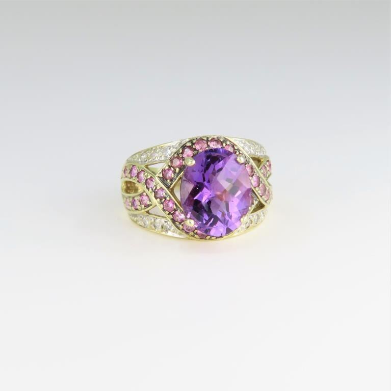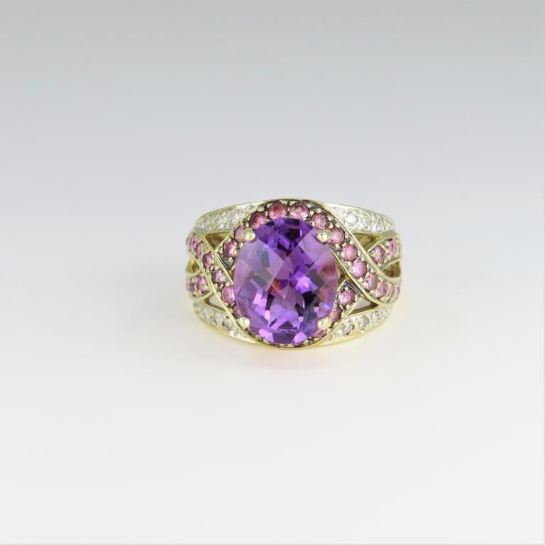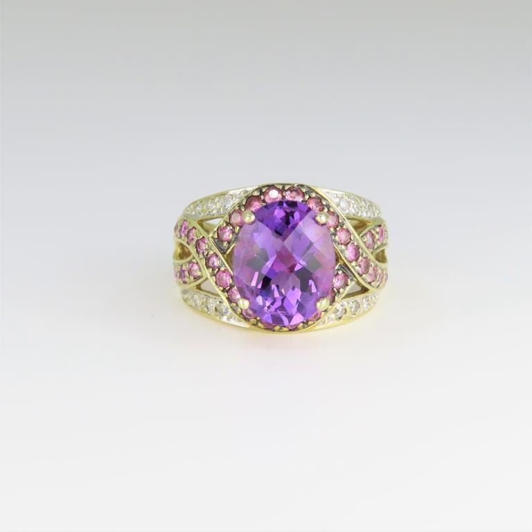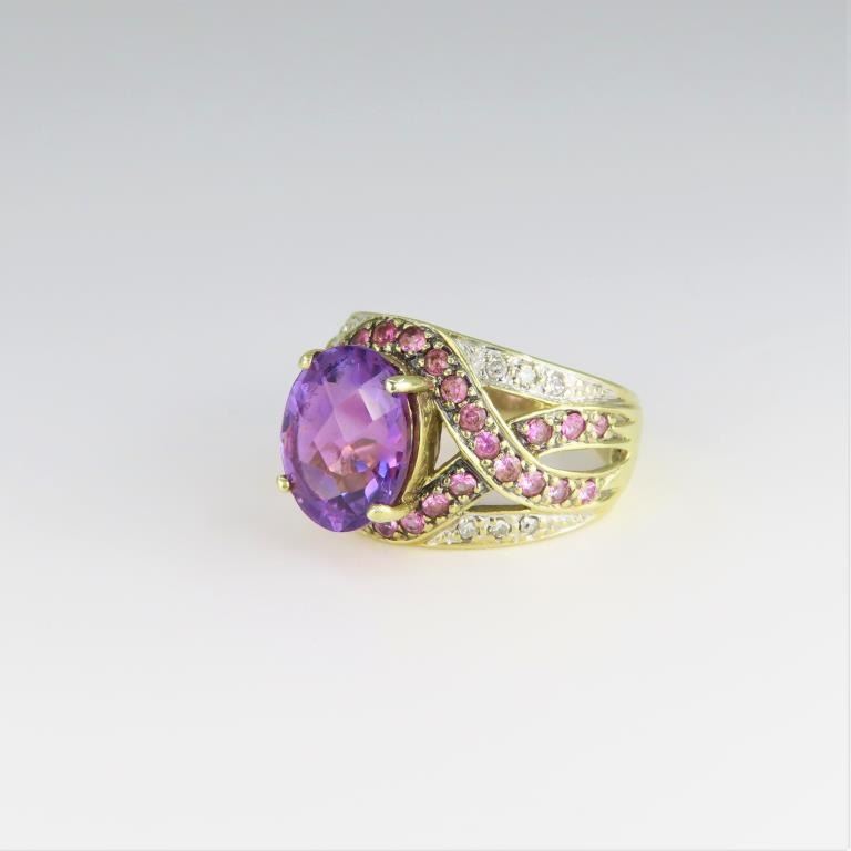 featuring a checkerboard cut Amethyst weighing approx. 6.00 carats and accented with 45 round Diamonds and pink Tourmalines weighing approx. 2.00 carats fine set in a 10 karat two-tone gold setting.