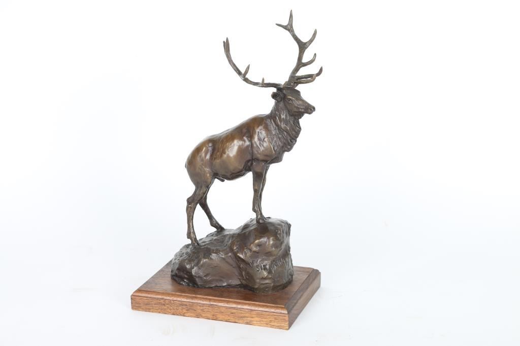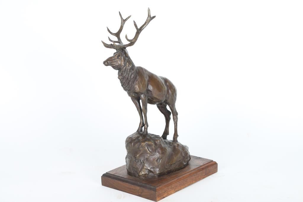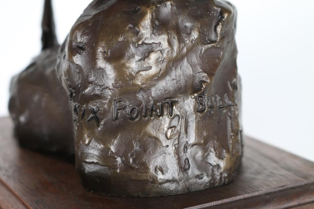 By Bob Scriver, entitled "6 point Bull", numbered 105/110. Measures 12x7" on wood base. Bob (Robert Macfie) Scriver (1914 - 1999) was active/lived in Montana. Bob Scriver is known for Animal and western sculpture.