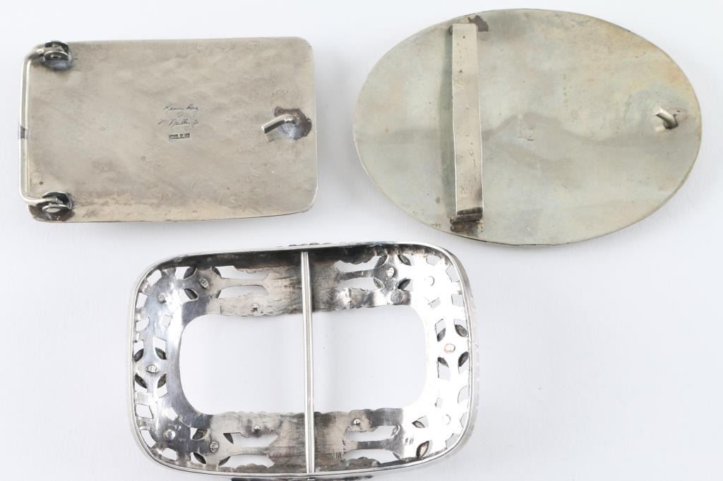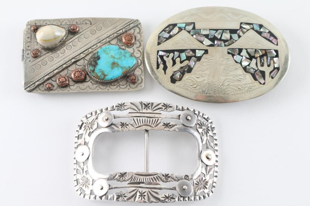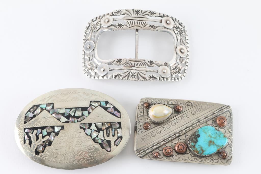 (1) Silver .833 Belt Buckle with chased design stamped with lion mark possibly Dutch, 3.75x2.5" (1) Navajo turquoise & Shell Buckle stamped Kenny Ray Mc Neilly JR. (1) Mexican Belt Buckle with inlaid shell silvered colored metal.