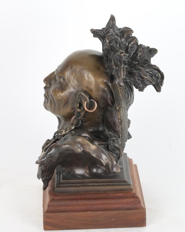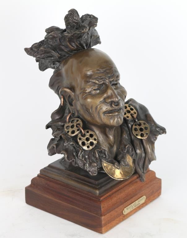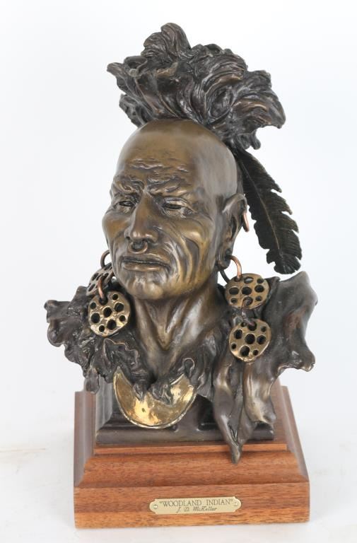 By J.D McKellar, entitled "Woodland Indian" , measures 11x5x5", numbered 2/20 on wood base. Jerry McKellar is known for Romantic wildlife and Indian sculpture.