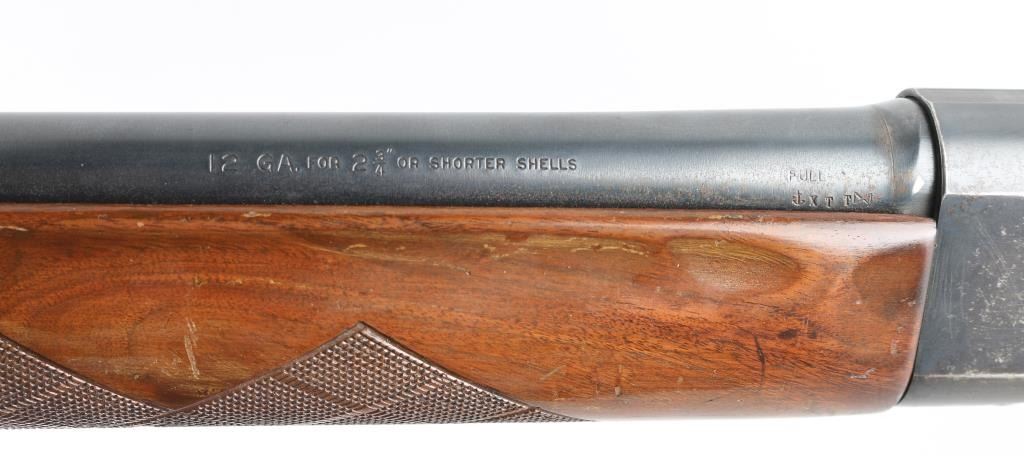 Semiautomatic shotgun. Barrel date code 1948. Accepts up to 2-3/4" shells. Features blued finish, checkered wood forend, wood stock with curved grip & checkered wrist, ventilated rubber recoil pad, 28" plain barrel, Full choke, steel front bead on raised base, manual safety. Bore is very good condition. Retains 70% blue with scuffs & scrapes & edge losses throughout, cleaned patina & pits across left side of receiver, some rust on barrel at wood line. Wood is good to very good condition with many scratches and dents, blemishes to finish. Recoil pad is hard, is a poor fit. Bolt handle can be pulled out of bolt fairly easily. Condition is NRA Good *** C&R Firearm ***