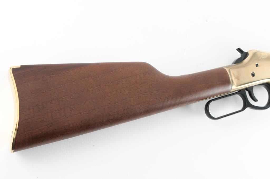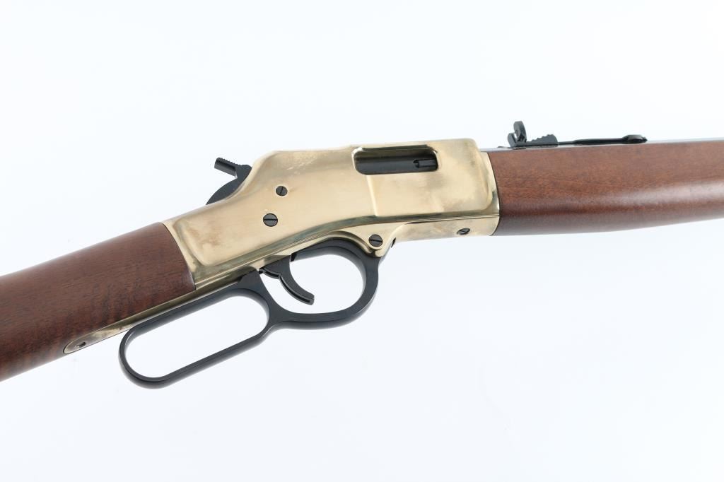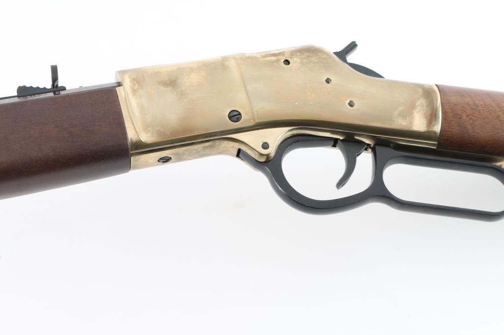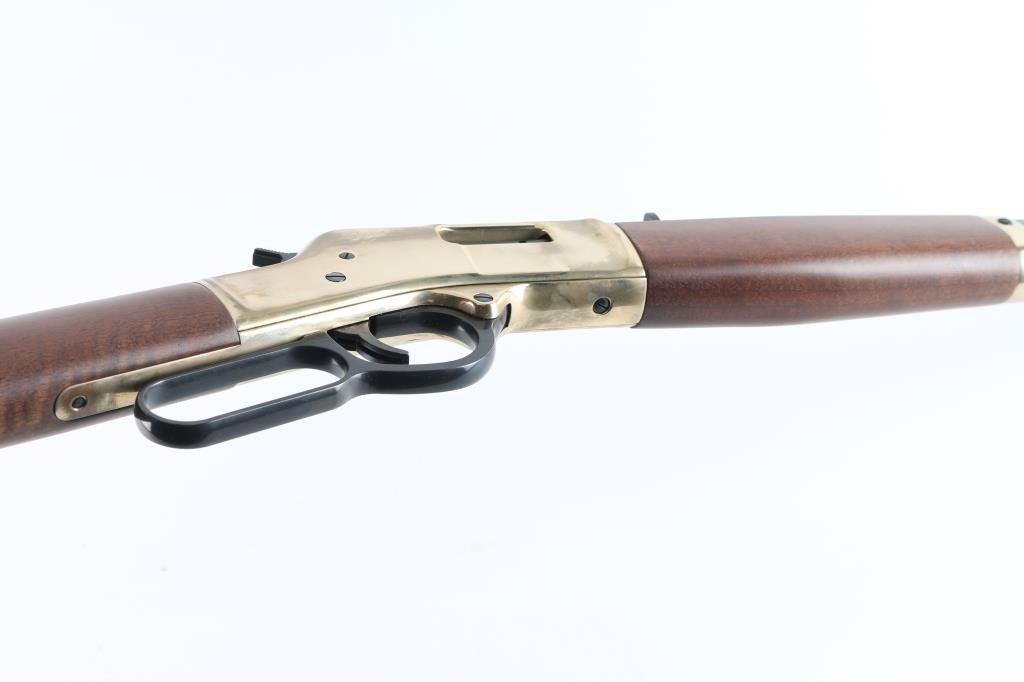 SN: BB0065169M. 'Big Boy' American made lever-action repeating rifle chambered in .357 Magnum/.38 Spl.. Features a blued 20" octagonal barrel, full tube magazine, blade front sight with brass bead, adjustable semi-buckhorn rear sight, brass receiver & barrel band, smooth trigger, serrated hammer, smooth American Walnut forend and straight grip shoulder stock with brass buttplate. receiver drilled/tapped for optics, Includes the original cardboard box with documents. Rifle exhibits approximately 99%+ of it's original finish showing little to no visible wear. Action is smooth, bore is pristine and wood stocks are fine. Condition is like new in box. Modern Firearm.