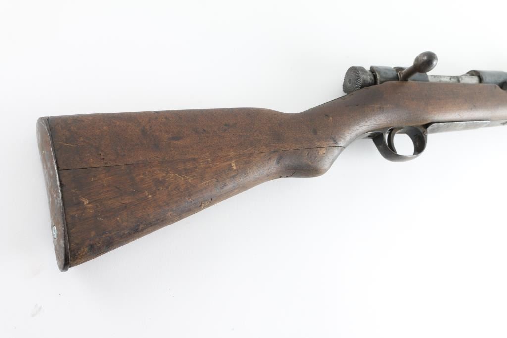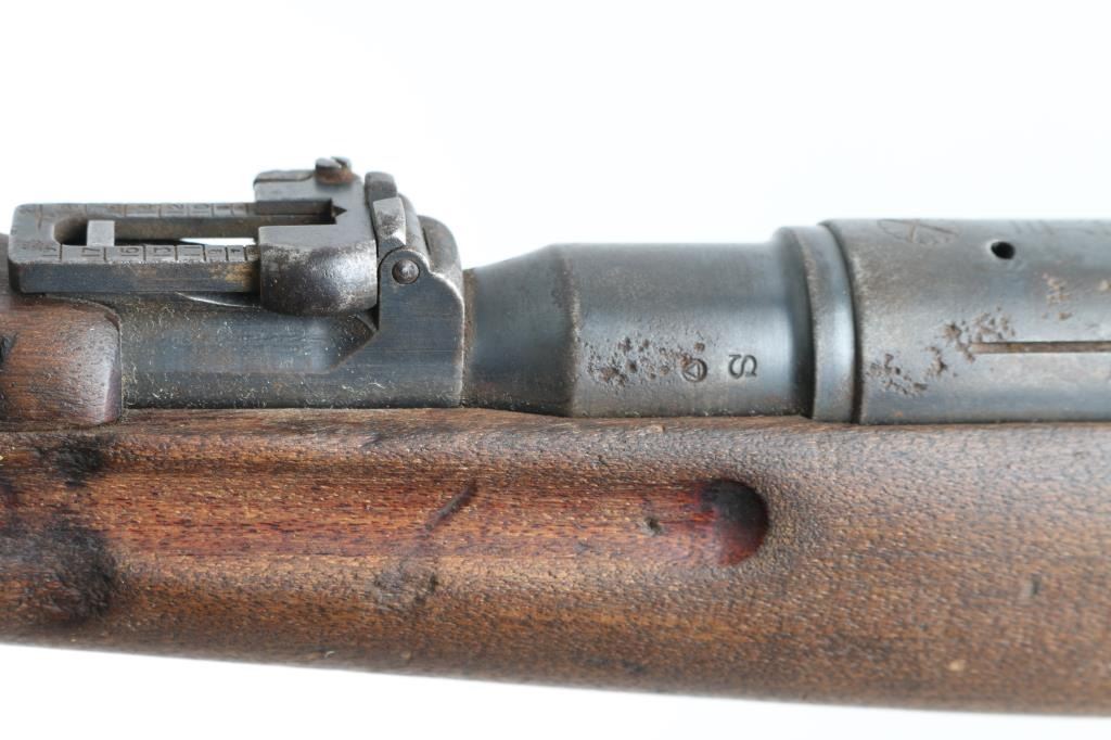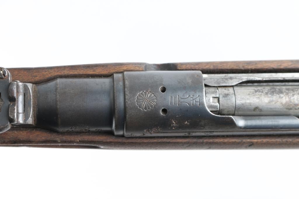 SN: 113117 Struck Mum. Japanese military bolt action rifle features 19" barrel, blade front sight with protector ears, V notch rear sight with flip-up elevator ladder, cleaning rod, bayonet lug, side mounted sling swivels, manual safety, hinged floorplate. Missing dust cover. Bore is fair to good condition, frosted, darkness in grooves, strong rifling. Retains 20% blued finish, large areas of patina or pitting (especially on barrel), bare metal on edges or where cleaned. Rough texture and loss to original fine detail in several areas. Stock is fair condition with signs of heavy use, dented & gouged, stained and missing finish, several 'hour glass' plug repairs to left side of butt. Buttplate has fair fit due to wood erosion. Butt dovetail showing slight gap. Bayonet lug numbered "640". Bolt numbered "247" on stem, extractor, safety. Condition is NRA Fair++ *** C&R Firearm ***