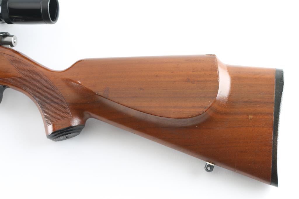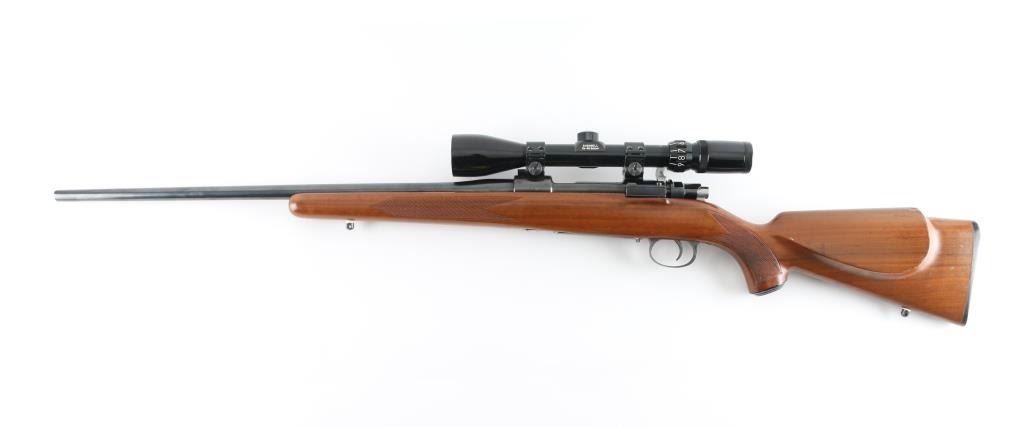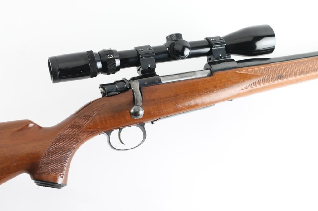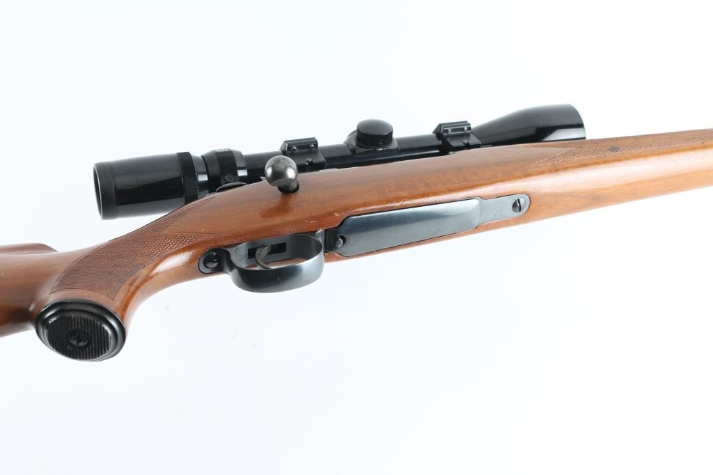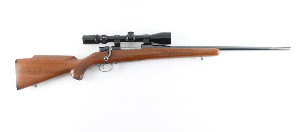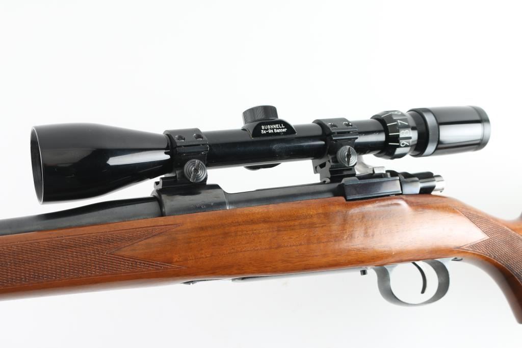 SN: C1630 FN Belgian bolt action rifle sold under the Montgomery Wards trade name "Western Field", using a commercial 98 action. Features blued finish, wood stock with right hand cheekpiece, 22.5" barrel, no sights, drilled & tapped receiver, two piece Weaver mounts, sliding safety on right side of tang, black plastic buttplate, checkering at wrist & forend, swivel studs. Bolt is polished bare metal, checkered flat on bottom of knob. Bore is very good condition. Rifle retains 90% blue with handling marks, some fading and beginnings of patina on barrel near muzzle. Stock is very good with some dents & scratches. Mounts a very good condition Bushnell Banner 3-9x scope with clear view, duplex reticle. Condition is NRA Very Good *** C&R Firearm ***