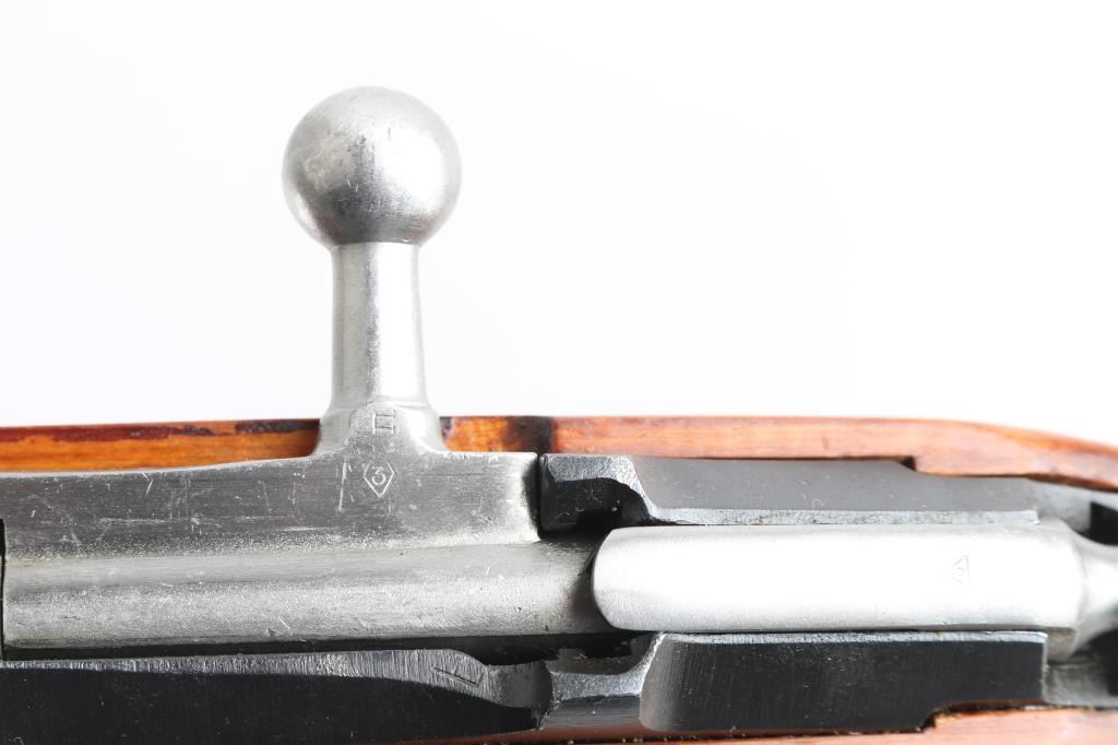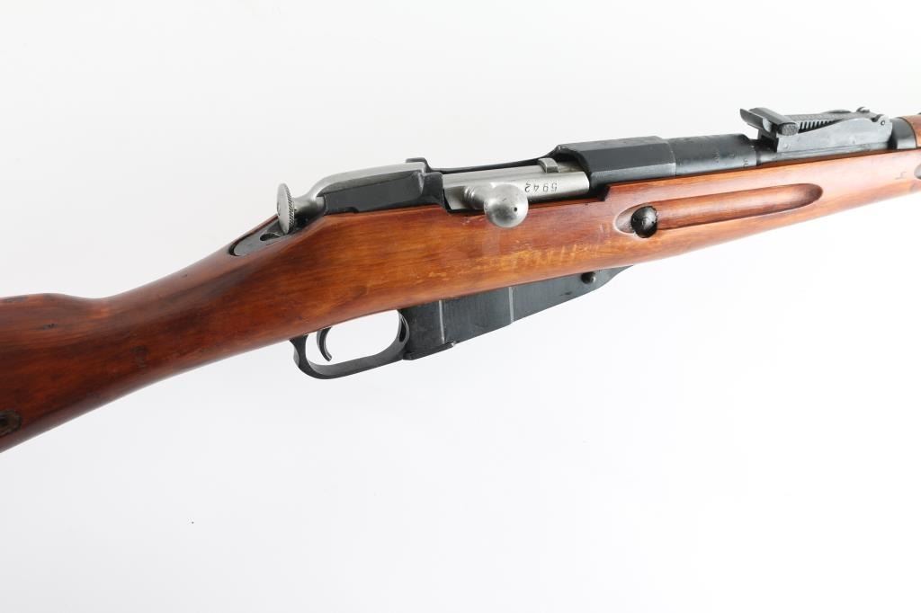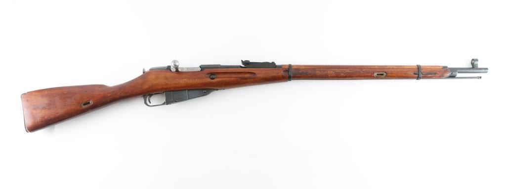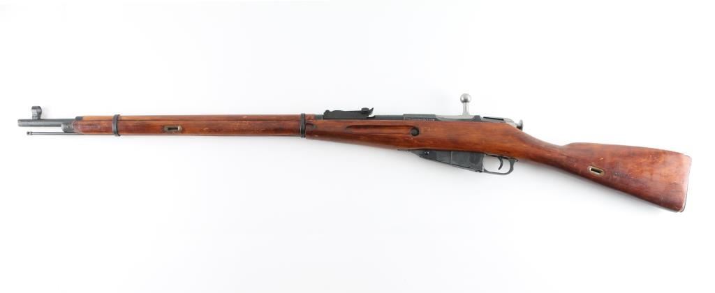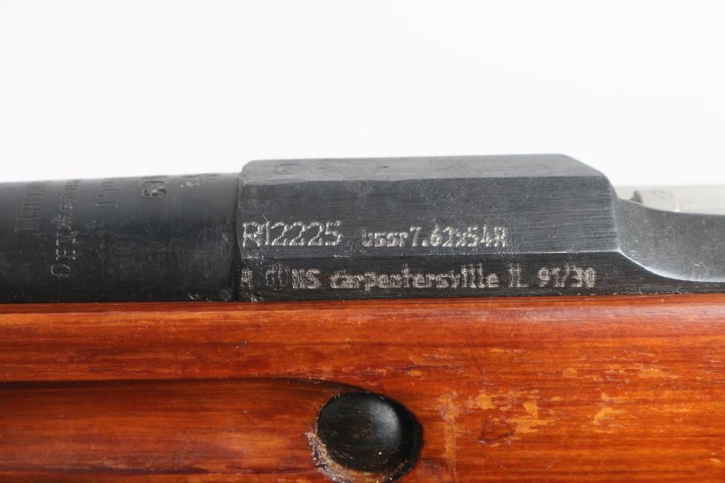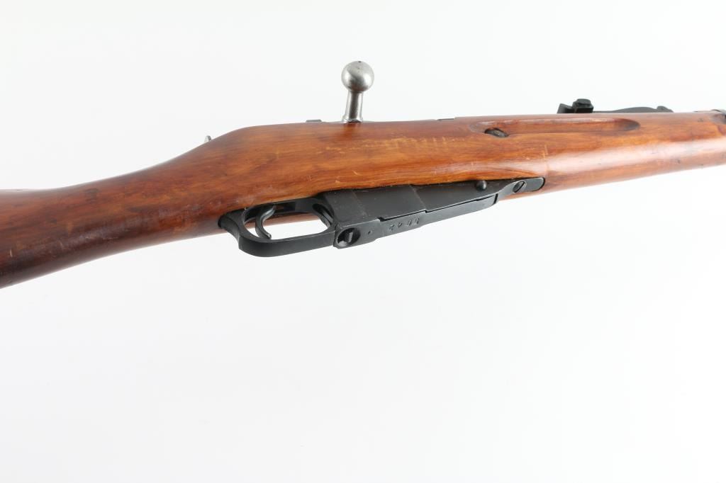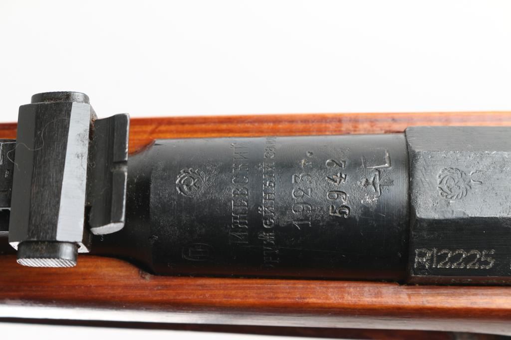 SN: R12225 Russian (Soviet Union) military bolt action rifle dated 1923. Imported by R.Guns (Left Receiver) Arsenal refinished. Features blued finish, wood stock & handguard, 29" barrel, post front sight, tangent rear sight, sling slots. Bore is good, rifling is a little worn. Metal retains 94% blue finish, with minor edge wear/scuffs. Bare metal bolt. Wood is very good with minor scratches/scuffs, some finish loss from handling, Original serial number matches on receiver, bolt. floorplate, and steel buttplate. Cleaning rod present. NRA Condition-Very Good. C&R Firearm
