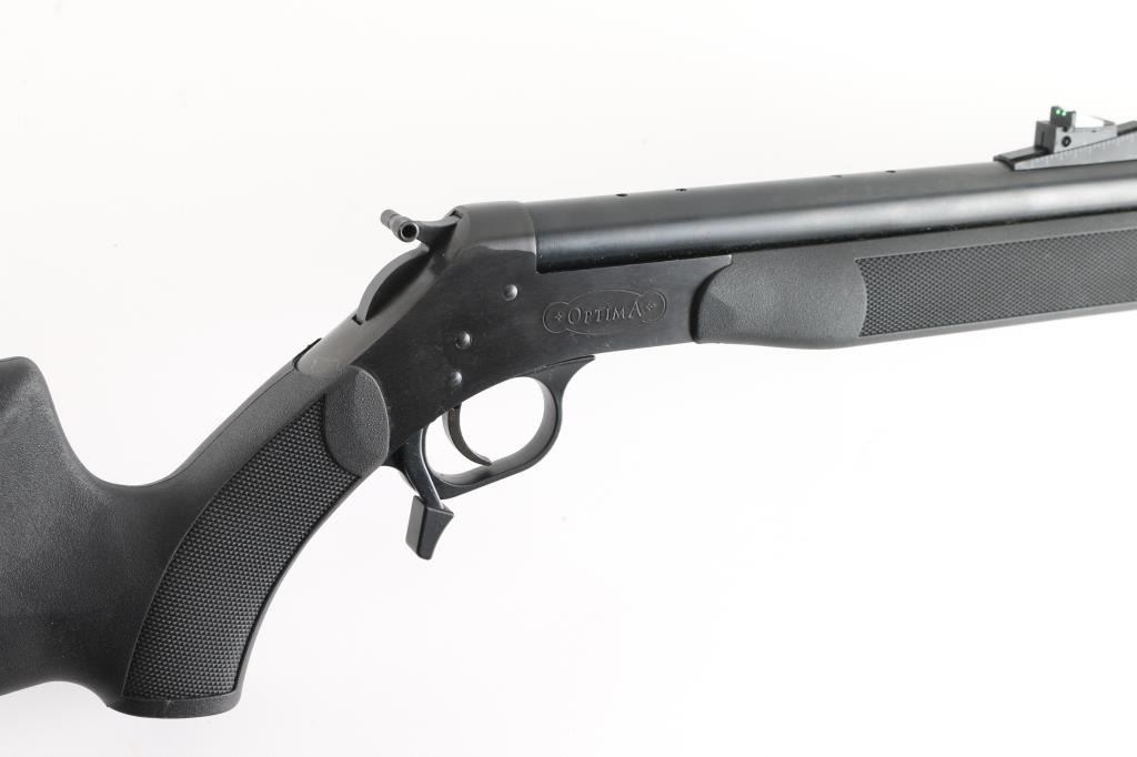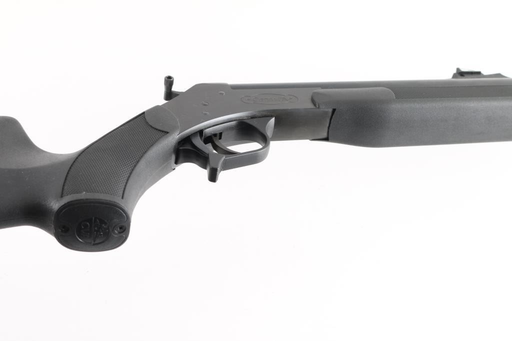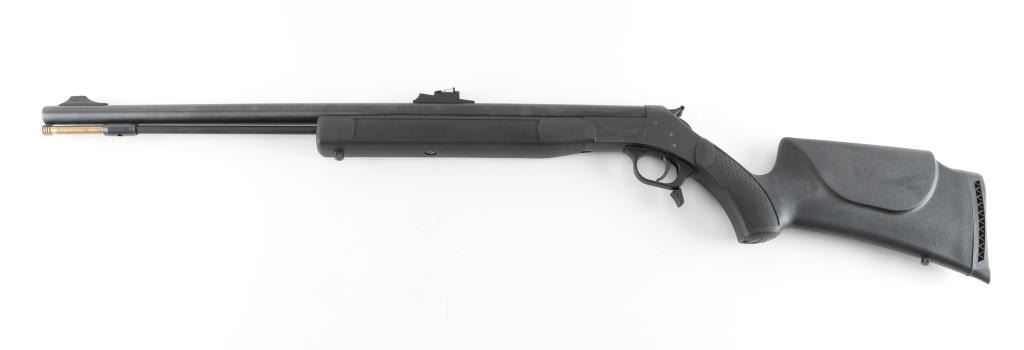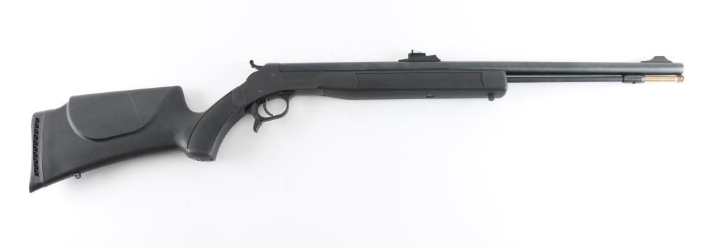 SN: 61-13-025686-04 Single shot muzzleloading rifle for use with black powder (or equivalent substitute) only. Breaks open to prime, centerline ignition with hammer. Features blued finish, black polymer furniture, 26" barrel, ramrod under barrel, blade front & adjustable rear sights (fiber optic insert in rear), opening lever at rear of trigger guard, sling studs, ventilated recoil pad, shallow double sided cheek pieces, checkered panels at wrist and forend. Front sight is missing the fiber optic insert. Appears unfired, with shiny bright bore. Overall excellent condition with few handling marks. Condition is NRA Excellent (missing front sight insert) *** Antique Firearm ***