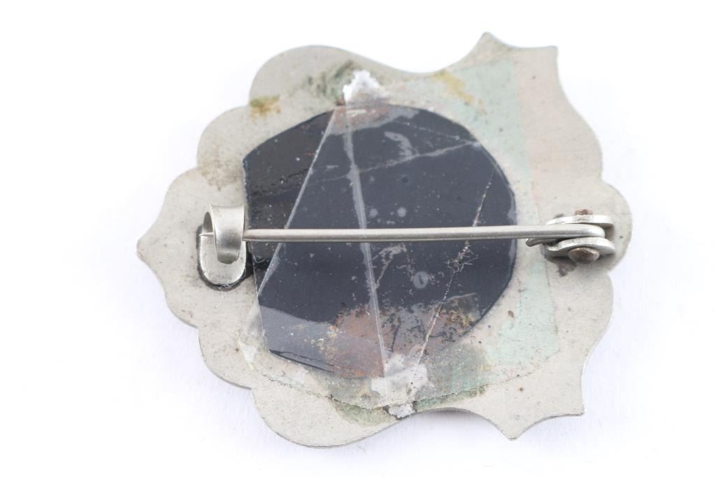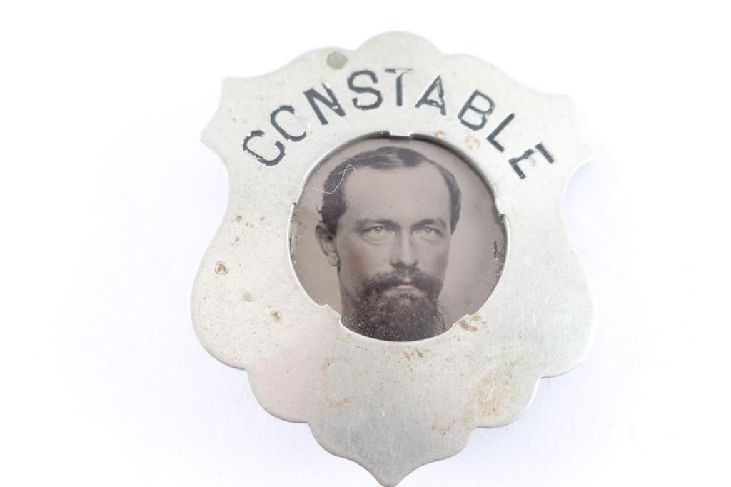 with window containing old photo of Lawman. 1 34/" across. Partial name removed at bottom circa 1890-1910 approx. Pin back, photo taped to re secure. From the Jim & Peggy Aplan Collection.