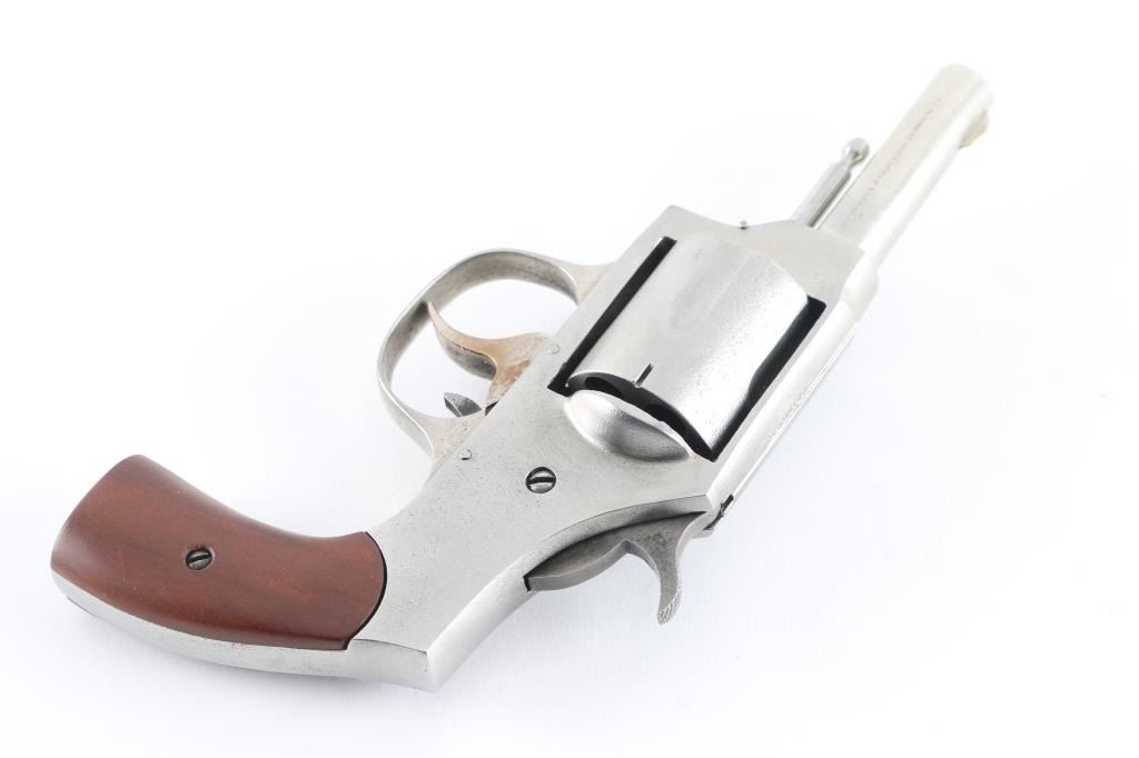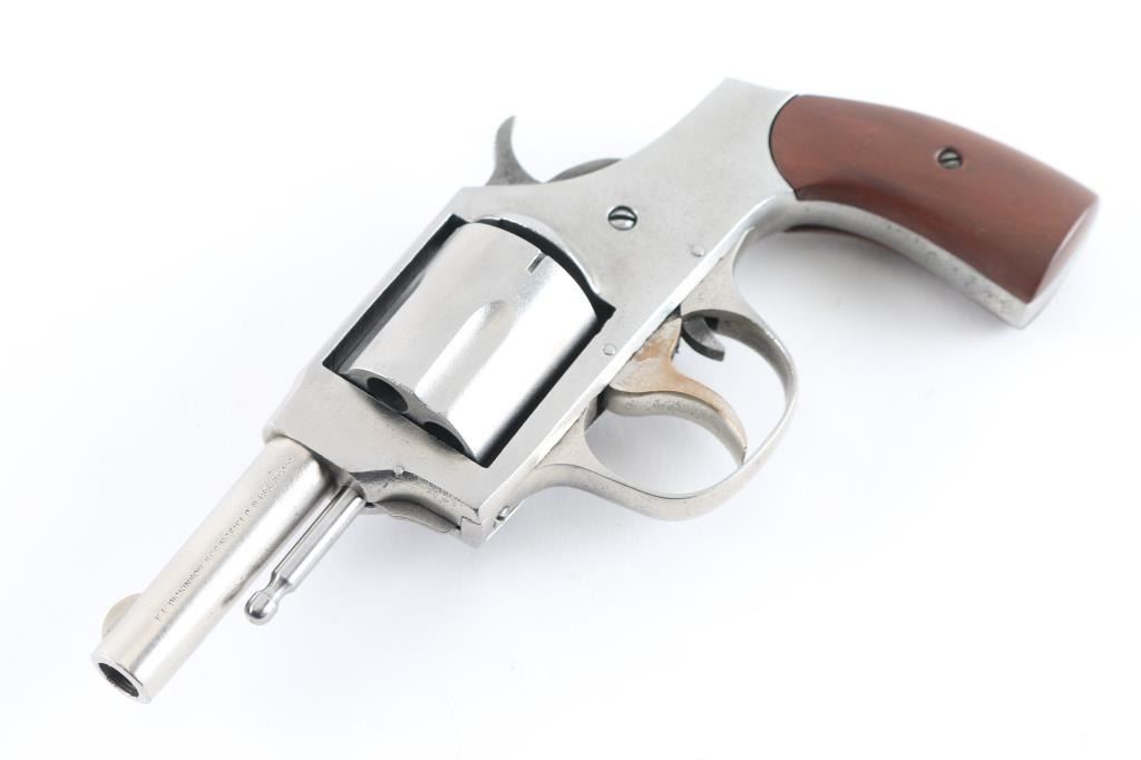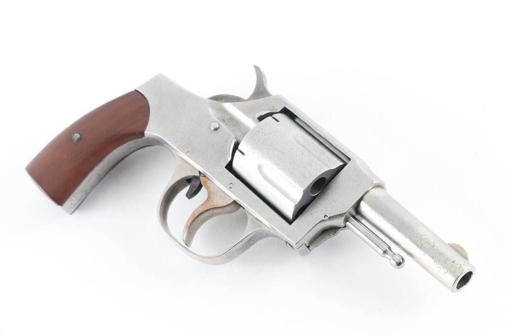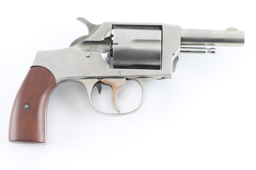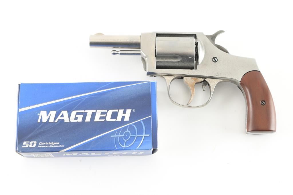 Vintage solid frame double action revolver chambered for 32 S&W Short centerfire cartridges. Features 2.5" round barrel, fixed sights, 5 shot fluted cylinder, side loading port, wood grips. Spring loaded latch on front of frame retains cylinder pin, which is removed for unloading. Finish is bare metal, rough media blasted with some visible deeper pitting in places. Markings are good, readable. Bore is good condition, sharp rifling, a bit dark and lightly corroded in grooves. Charge holes are lightly corroded, overall good condition. Grips are very good. Action is smooth with tight lock-up when trigger is held to rear. Cylinder spins freely when trigger at rest. Includes partial box (45 rounds) Magtech 32 S&W ammunition. Condition is NRA Fair *** C&R Firearm ***