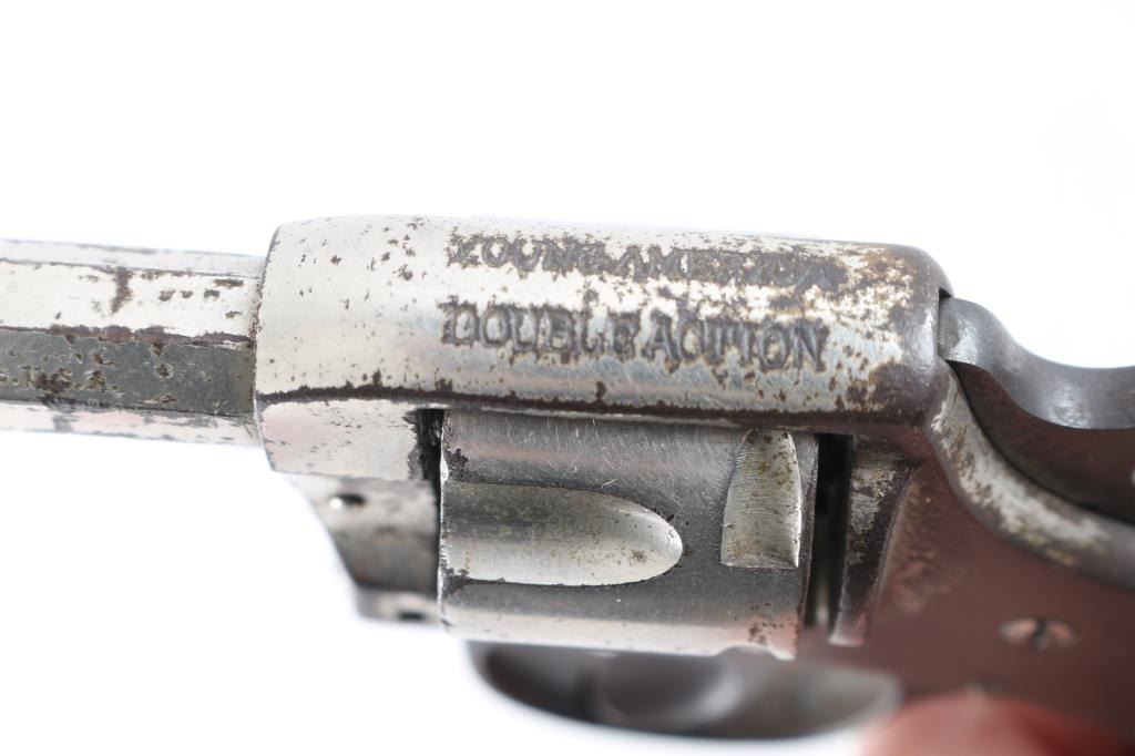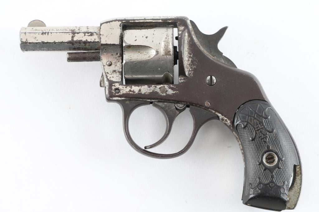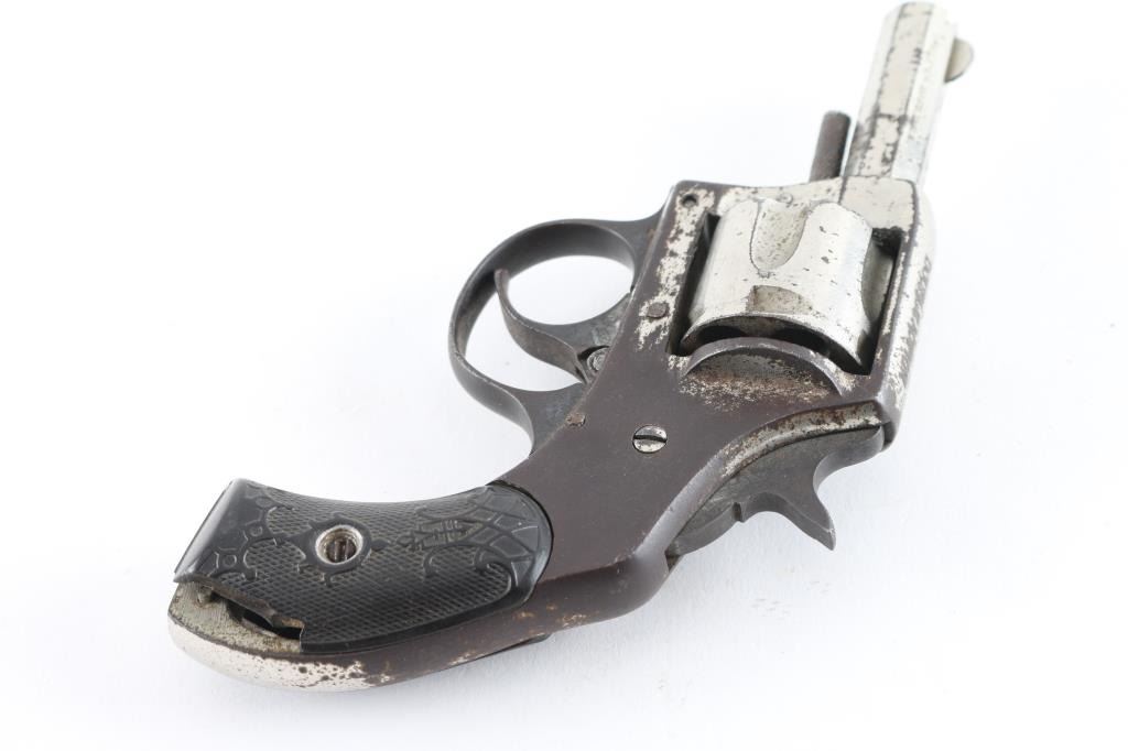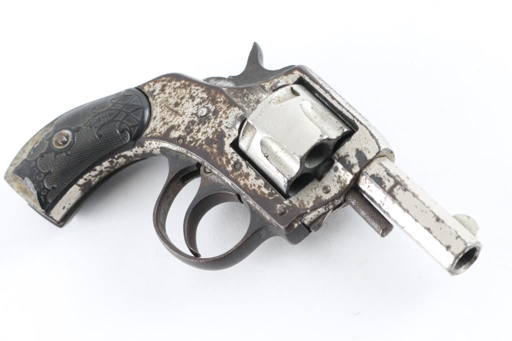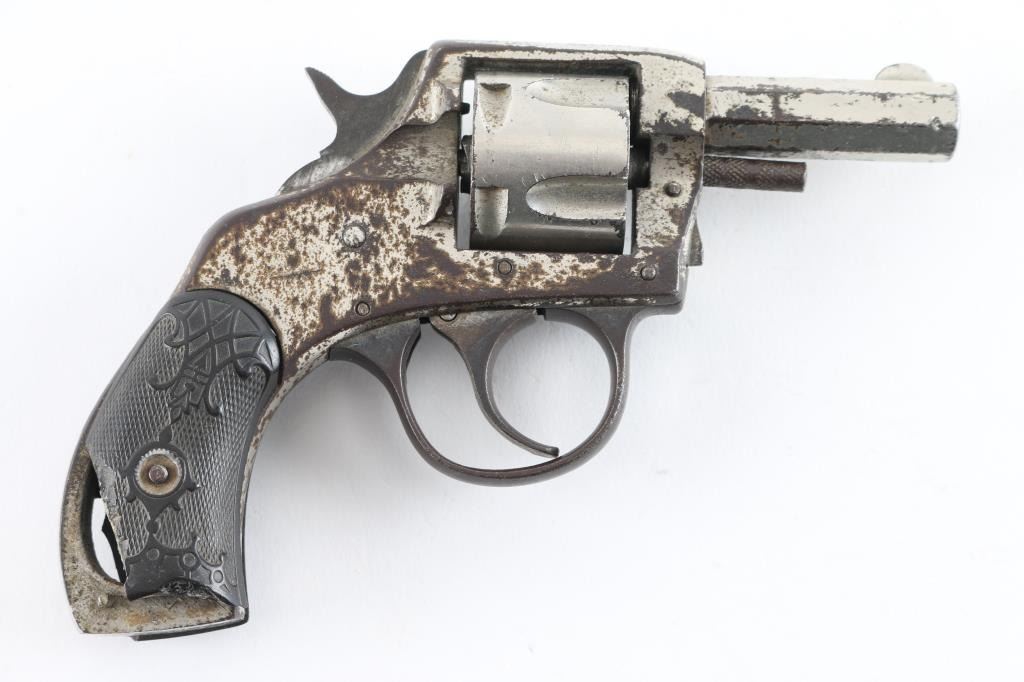 SN: 4602 Vintage double action revolver features nickel finish, checkered black hard rubber grips, 2" octagon barrel, fixed sights, 5 shot fluted cylinder. Poor condition bore shows rust & traces of rifling. Retains 20% nickel with large areas of brown patina. Grips are chipped, missing small pieces. Action is non functional. Condition is NRA Poor *** C&R Firearm ***