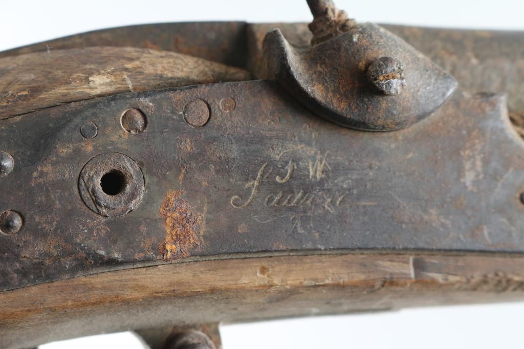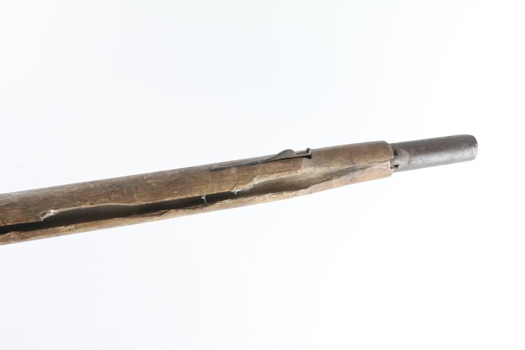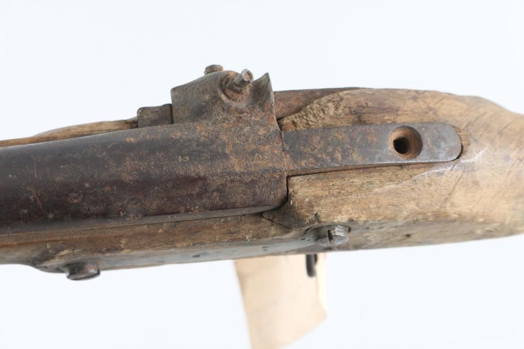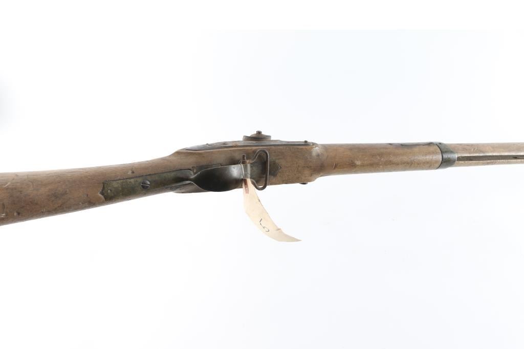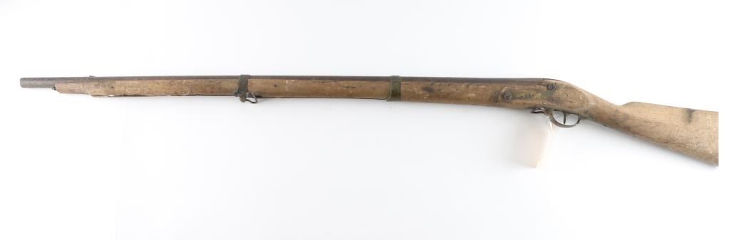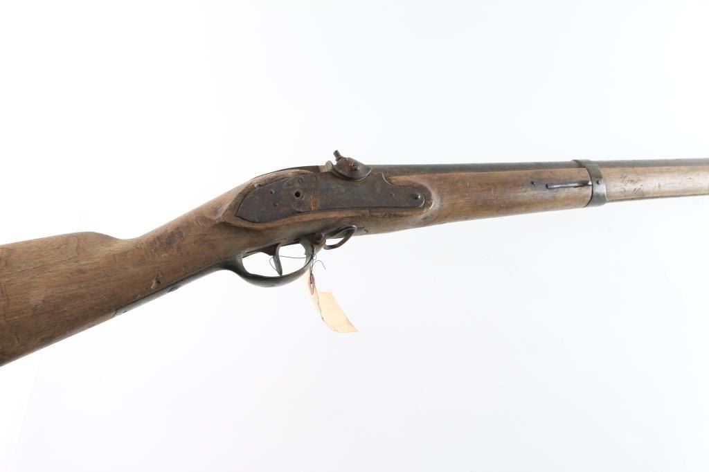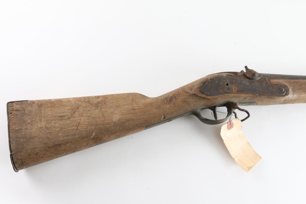 Circa 1830's-40's converted from flintlock to percussion with brass mounts. Heavily rusted as found, with missing hammer, and forend cap showing weathering, exposure to elements and relic like condition. Saurn Arsenal markings on lock and approx 69 cal plus smooth bore. Many of this type musket traded to Indians in the west. The estate of "Jim" Aplan who loved " Out of the attic or teepee antique arms. Antique Firearm NRA Poor-Fair